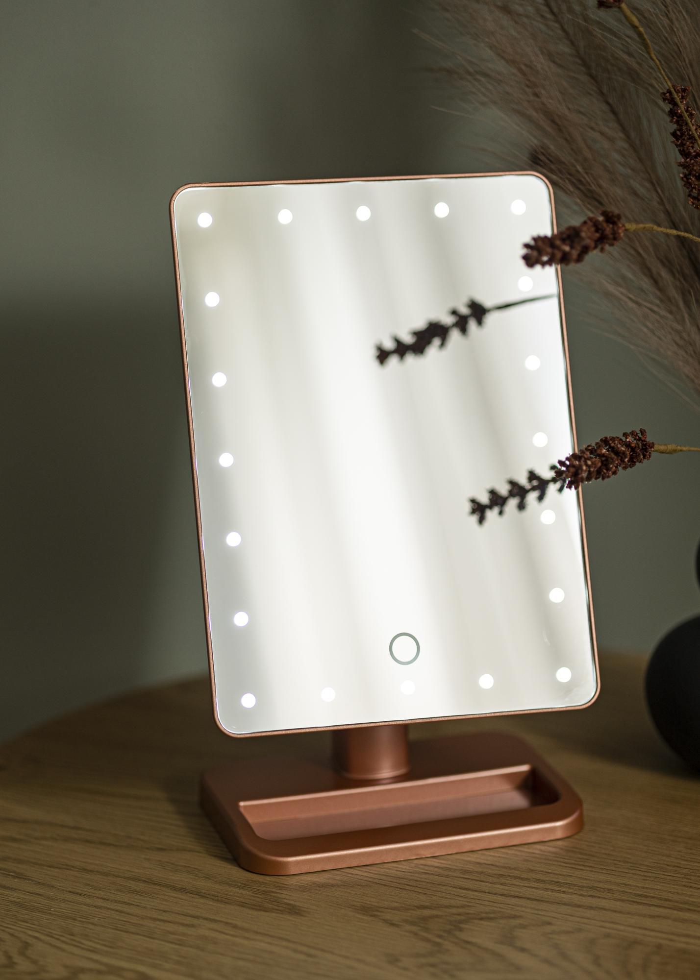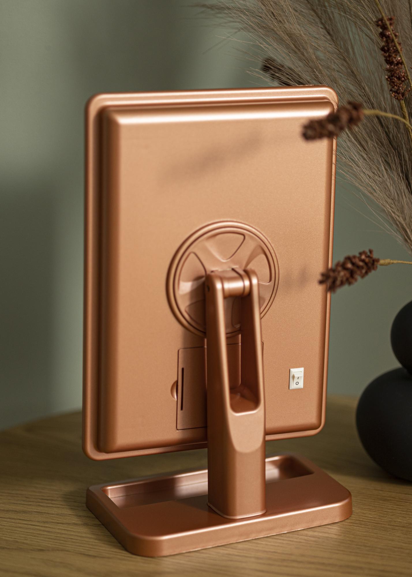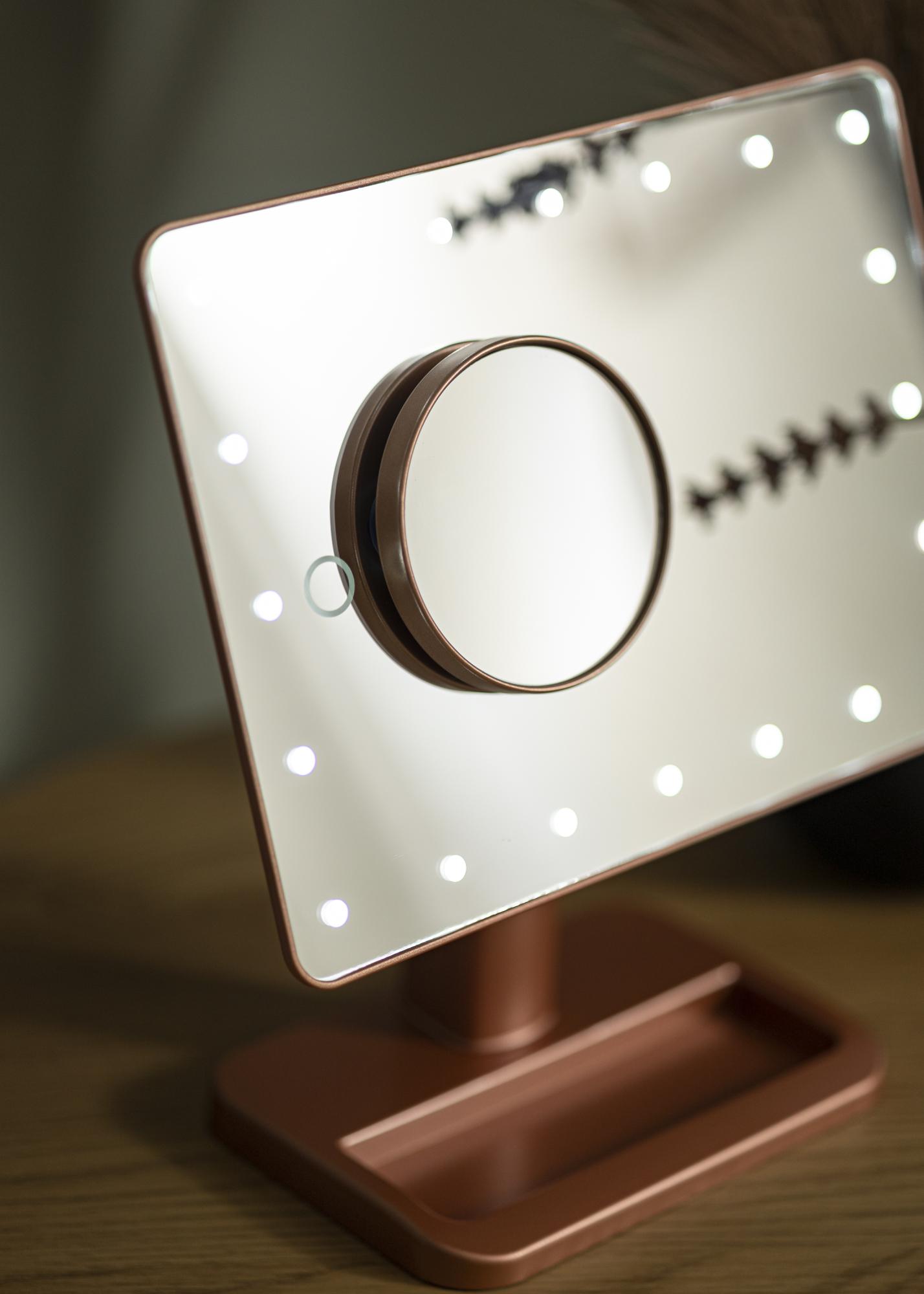 Toto je zrcadlo na líčení pro vás, kteří chcete elegantní zrcadlo ve flexibilním designu. Je umístěno stojící, což umožňuje snadno přemísťovat zrcadlo po domácnosti nebo si ho vzít s sebou na cestách. Zrcadlová plocha o rozměrech 16,5x25 cm může být nakloněna, abyste mohli lépe nanést make-up přesně podle přání. Menší zrcátko s 10x zoomem je součástí balení a může být připevněno na zrcadlovou plochu hlavního zrcadla.