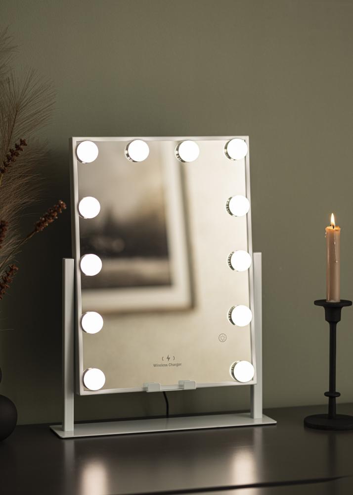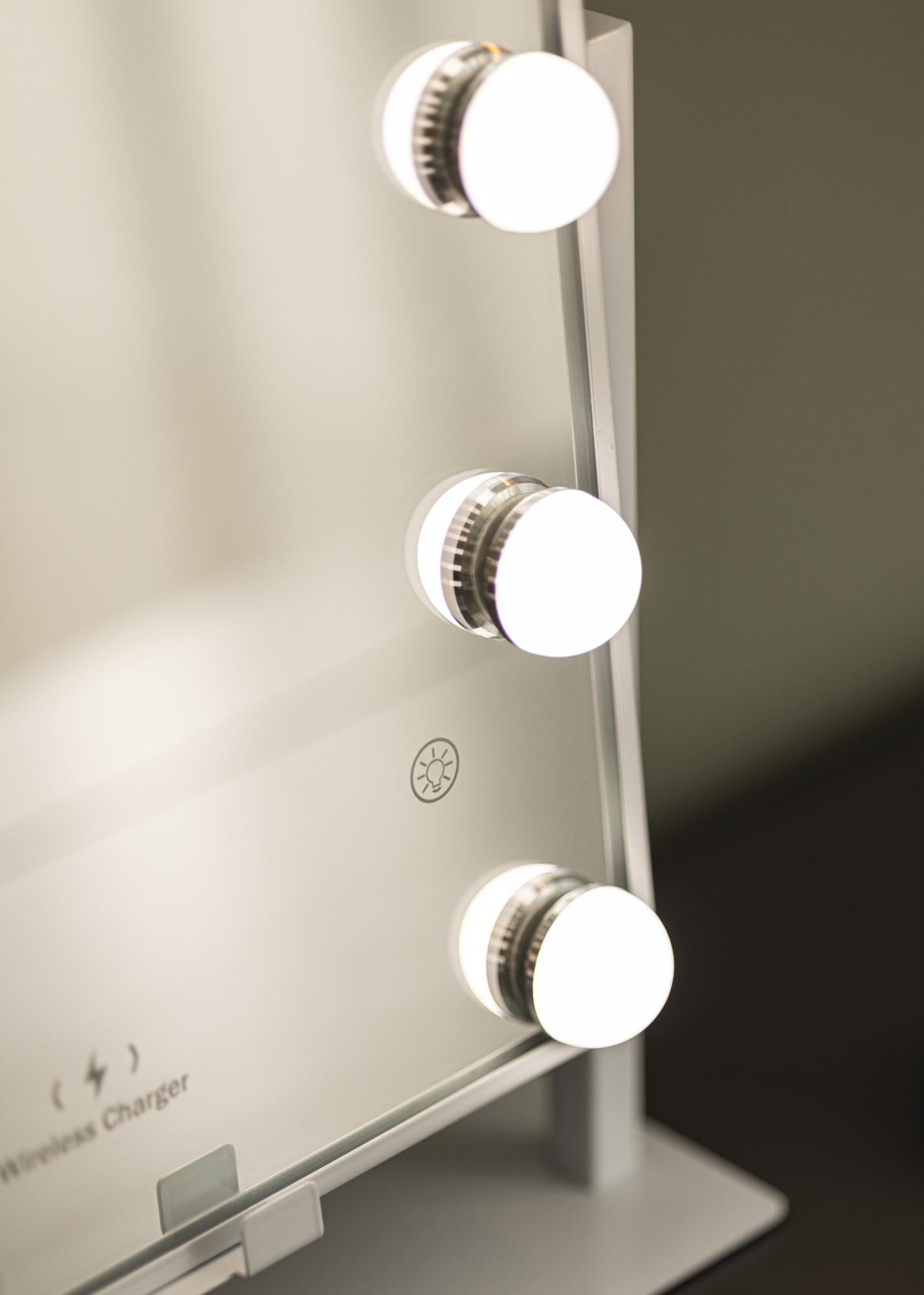 Toto je stylové zrcadlo na líčení s extra luxusní funkcí – totiž podporuje bezdrátové nabíjení vašeho smartphonu! Když je lampa zapnutá, umístěte své zařízení na určené místo na zrcadle, aby se nabilo výkonem 5V/2A (10W). Je to velmi praktické pro hektická rána, kdy chcete mít telefon při ruce, zatímco se připravujete před zrcadlem. Funkce funguje pro všechny modely smartphonů, které podporují bezdrátové nabíjení.
