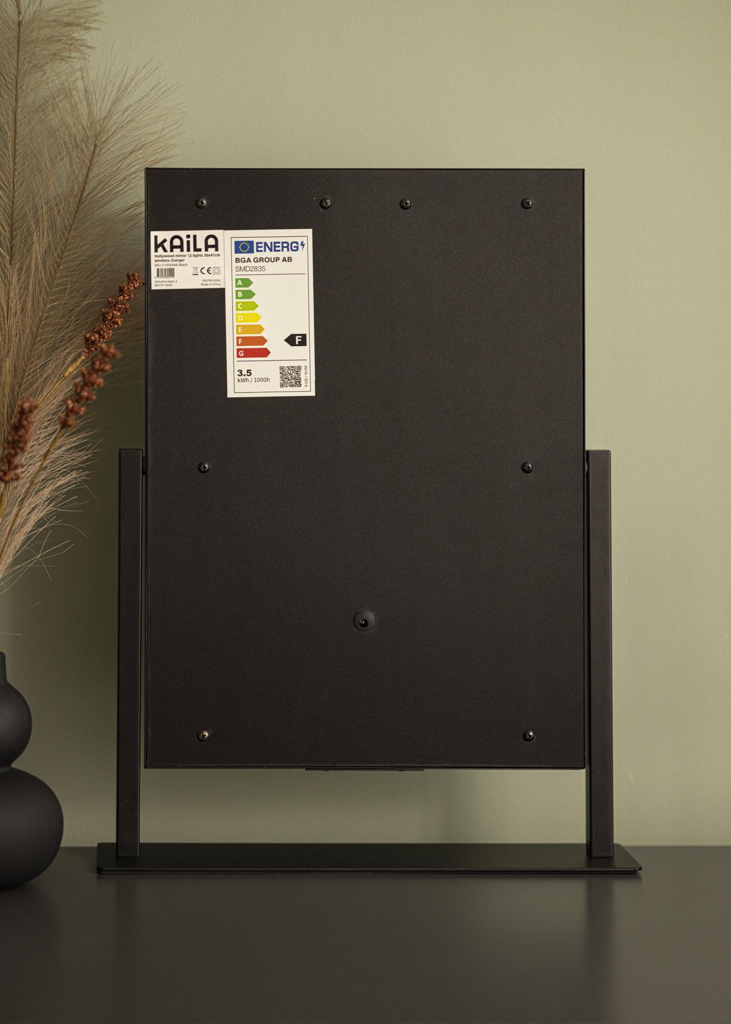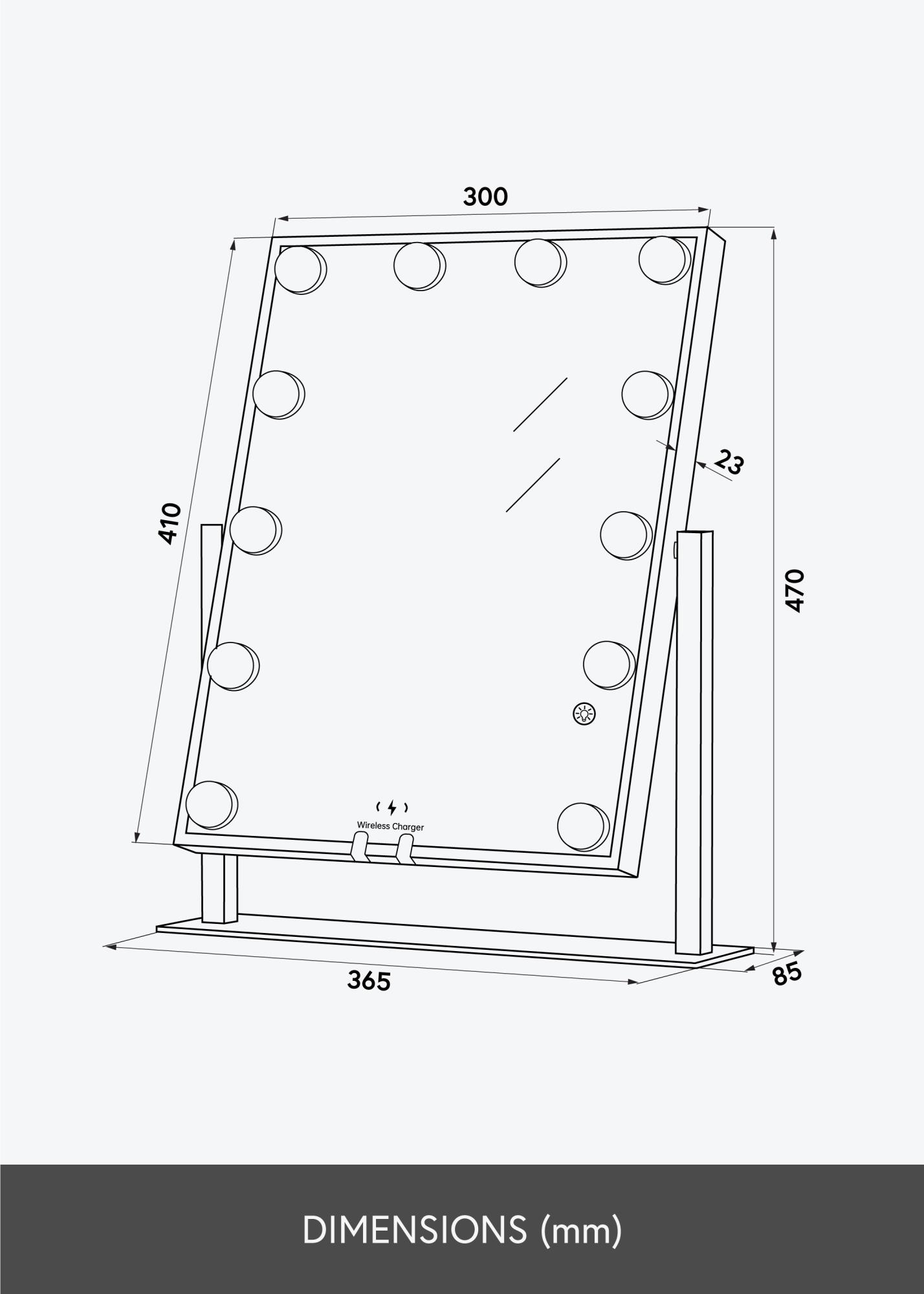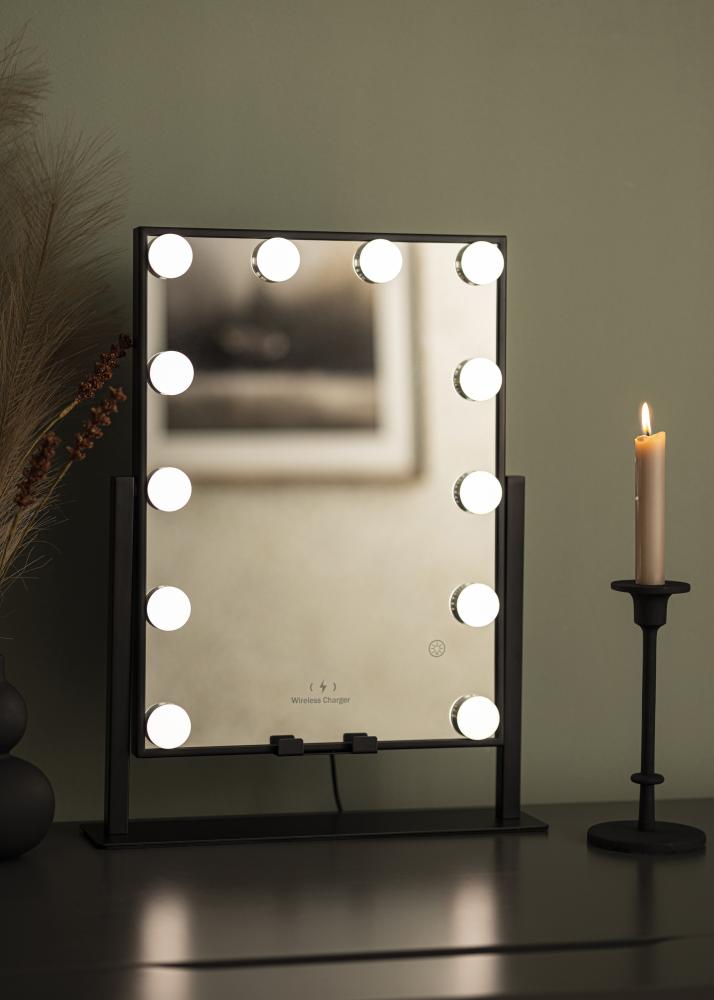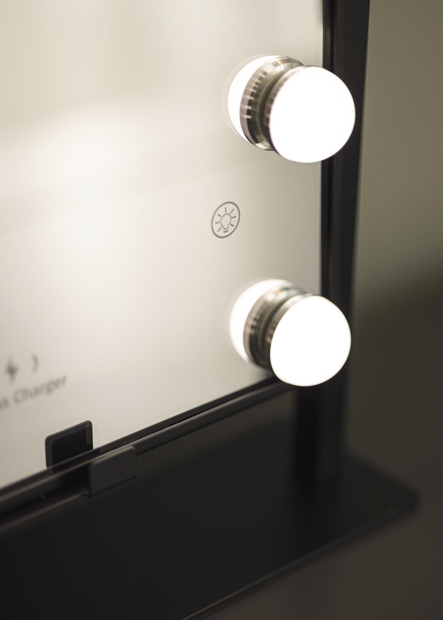 Zrcadlo má elegantní černou barvu, která se dobře hodí k interiéru většiny pokojů. Černá barva je doplněna 12 LED lampami, které ještě více zvýrazňují stylový výraz. Vestavěné LED lampy jsou rozmístěny jako rám kolem zrcadlové plochy o rozměrech 30x41 cm. Držením dotykového tlačítka na přední straně zrcadla několik sekund můžete ztlumit osvětlení na úroveň, která vám vyhovuje. Elektrické připojení se provádí pomocí zástrčky.