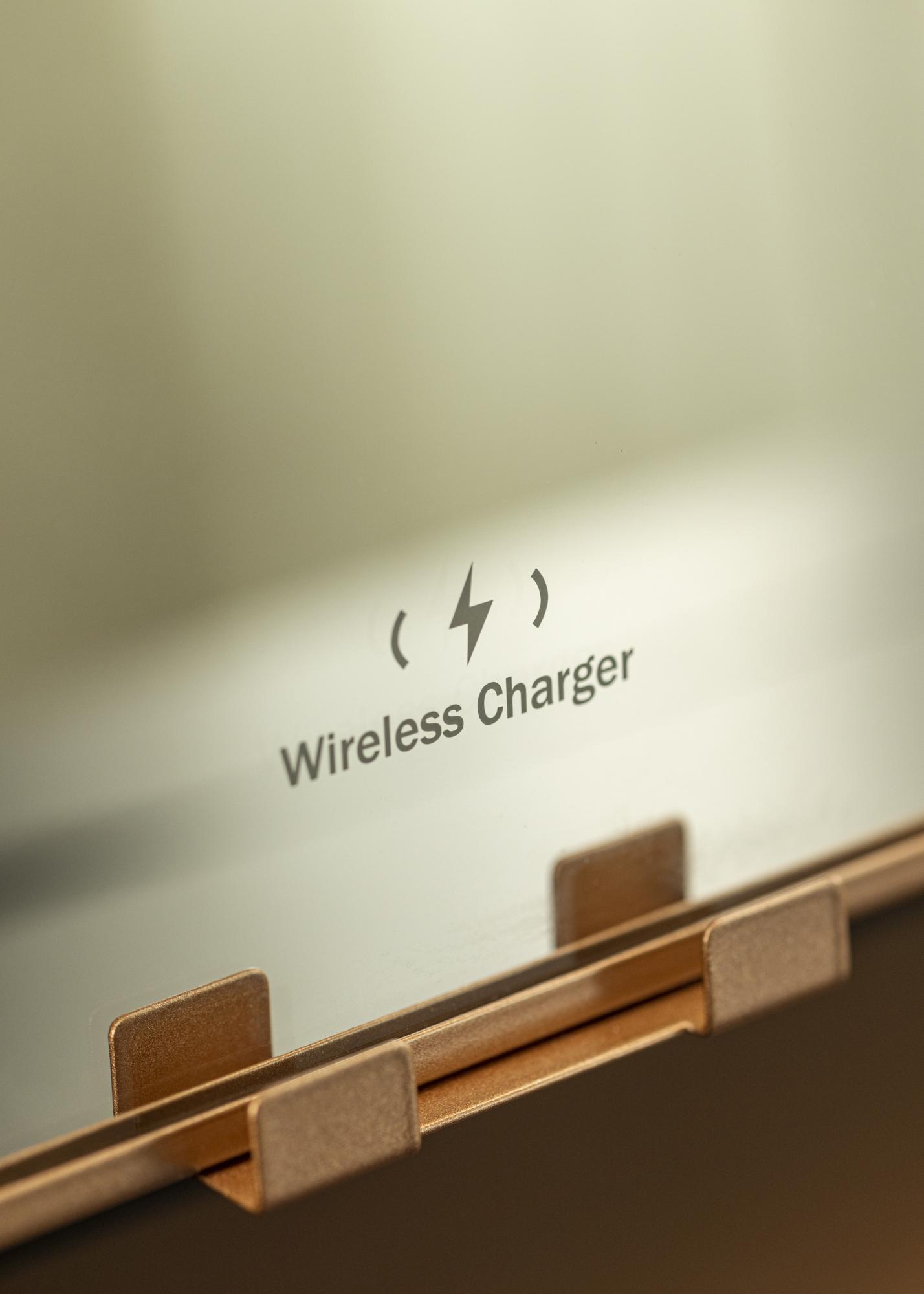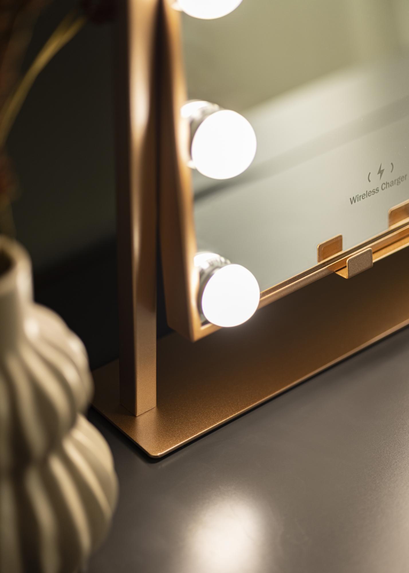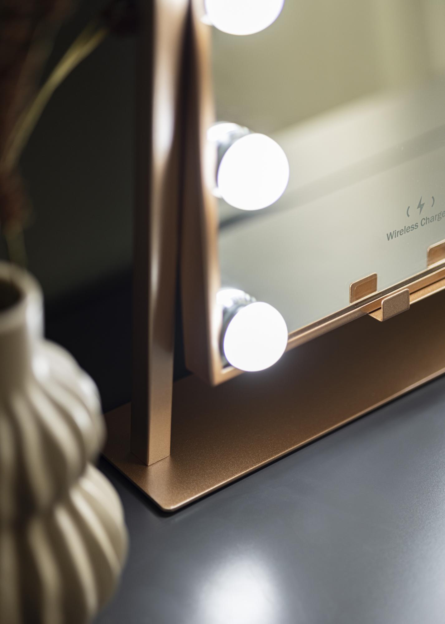 Toto je zrcátko na líčení v odstínu růžového zlata, s luxusní funkcí bezdrátového nabíjení! Když je zrcátko zapnuto, položte svůj telefon na určené místo pro nabíjení s výkonem 5V/2A (10W). Funkce nabíjení funguje pro všechny chytré telefony, které podporují bezdrátové nabíjení. Další šikovné funkce, které toto zrcátko má, jsou naklápěcí zrcadlová plocha a vestavěné LED osvětlení, které vám poskytne dobré světlo při nanášení make-upu. Osvětlení se skládá z 12 LED žárovek, které krásně lemují zrcadlovou plochu a dodávají celému zrcátku stylový vzhled. Osvětlení je stmívatelné a pro nastavení světla na požadovanou intenzitu podržte dotykové tlačítko na přední straně zrcátka po několik sekund.