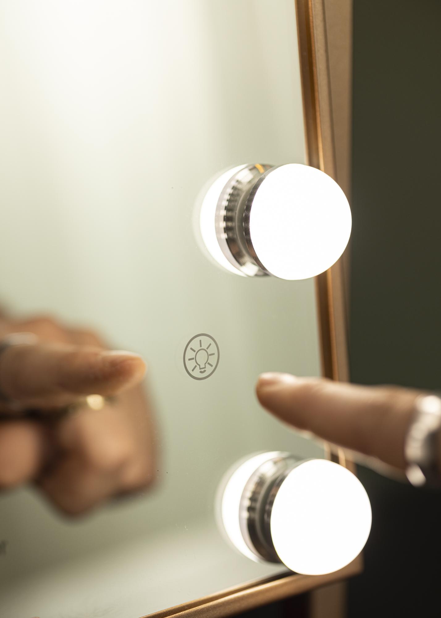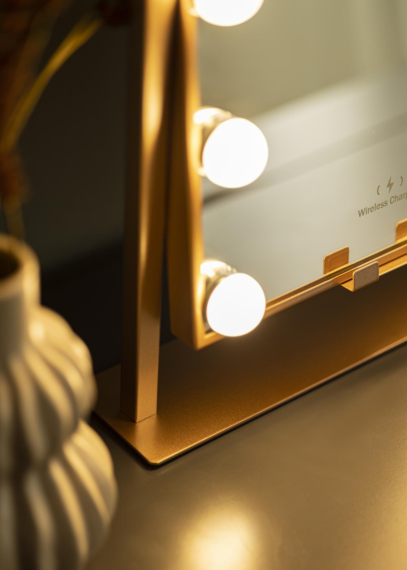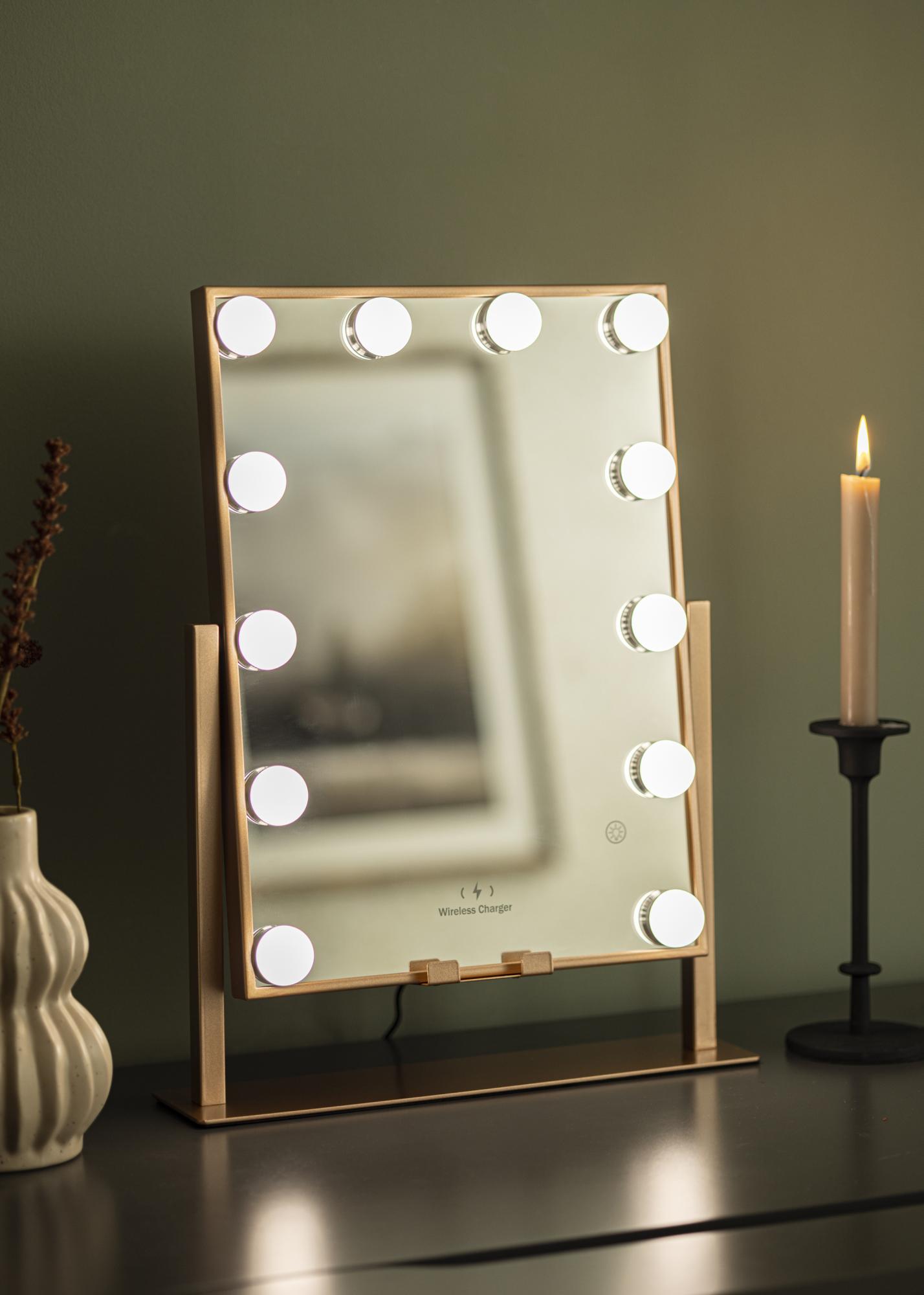 Toto je zrcátko na líčení v odstínu růžového zlata, s luxusní funkcí bezdrátového nabíjení! Když je zrcátko zapnuto, položte svůj telefon na určené místo pro nabíjení s výkonem 5V/2A (10W). Funkce nabíjení funguje pro všechny chytré telefony, které podporují bezdrátové nabíjení. Další šikovné funkce, které toto zrcátko má, jsou naklápěcí zrcadlová plocha a vestavěné LED osvětlení, které vám poskytne dobré světlo při nanášení make-upu. Osvětlení se skládá z 12 LED žárovek, které krásně lemují zrcadlovou plochu a dodávají celému zrcátku stylový vzhled. Osvětlení je stmívatelné a pro nastavení světla na požadovanou intenzitu podržte dotykové tlačítko na přední straně zrcátka po několik sekund.