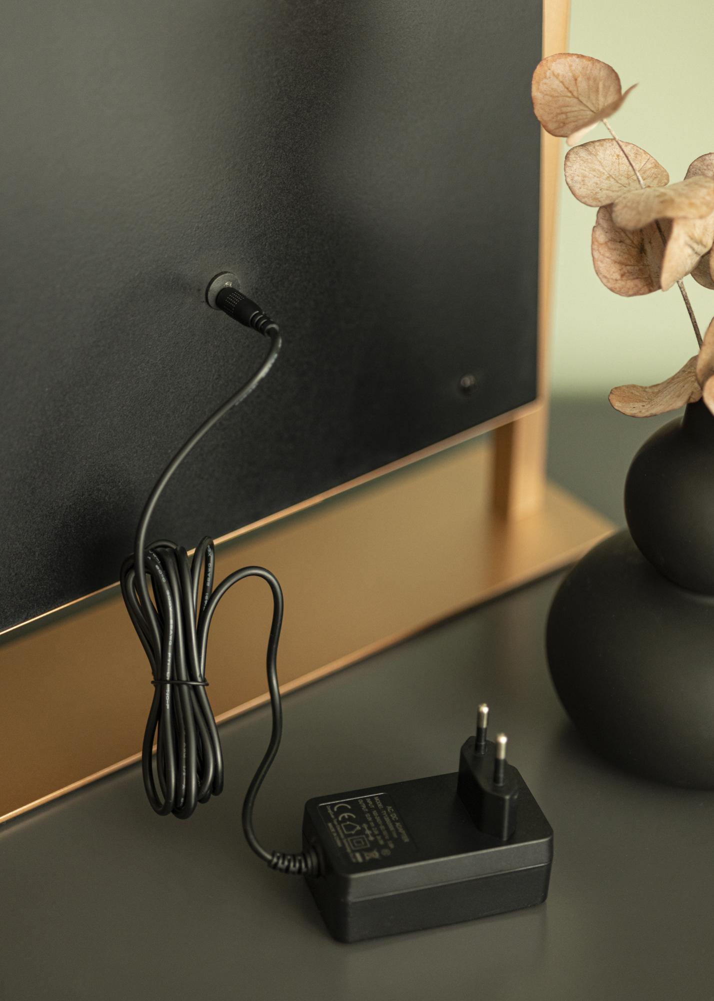 Zrcátko má stojatý design a lze jej snadno umístit na komody, příborníky a stoly. Připojení k proudu je provedeno pomocí zástrčky.