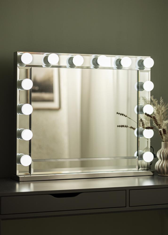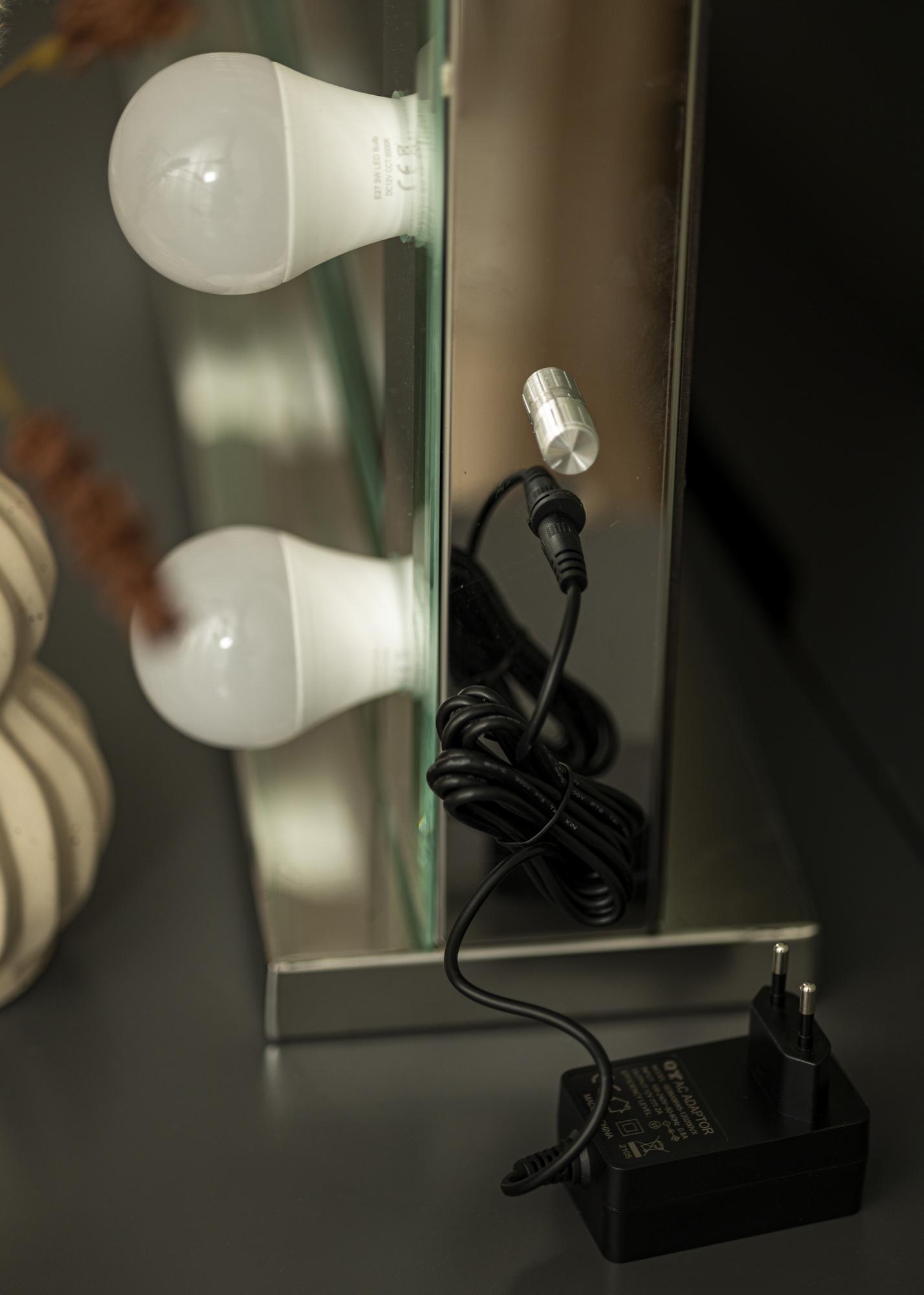 Dodejte svému domovu zlatý nádech s tímto kosmetickým zrcadlem v Hollywoodském designu. Zrcadlo má rám stříbrné barvy, který je ozdoben 14 žárovkami, což zrcadlu dodává luxusní vzhled. Žárovky jsou vyměnitelné a mají objímku E27. Lampy poskytují studené bílé světlo. Pokud si přejete, můžete zvolit ztlumení osvětlení na jas, který vyhovuje vašemu účelu – jasné osvětlení je ideální, když se líčíte, zatímco tlumenější světlo je lepší jako pozadí. Toto nastavení se provádí jednoduše pomocí malé otočné páčky na boční straně zrcadla.