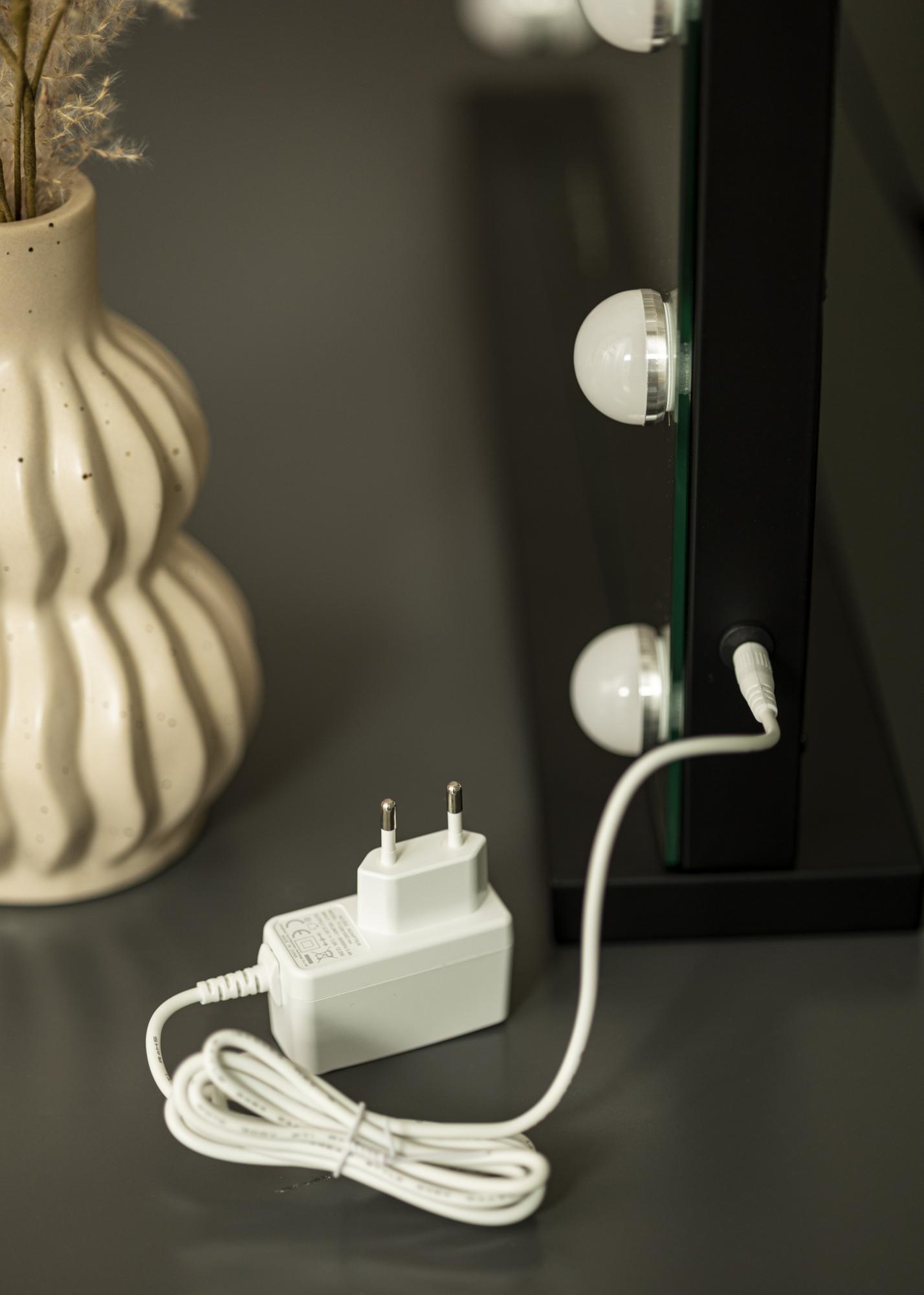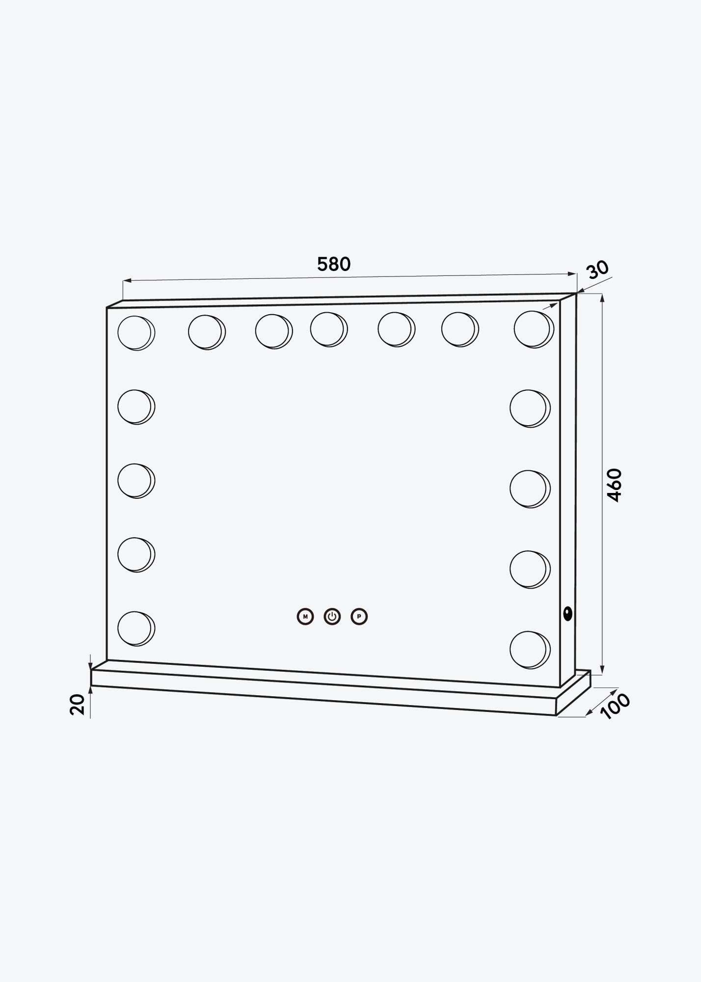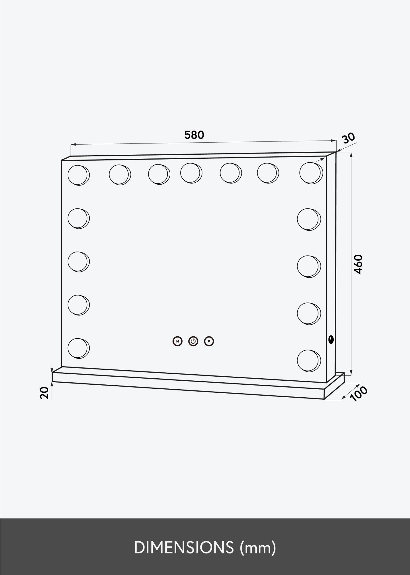 Oživte svůj kosmetický koutek, obývací pokoj nebo chodbu elegantním kosmetickým zrcadlem s vestavěným osvětlením! Zrcadlo nemá tradiční rám, místo toho je zrcadlový povrch lemován 15 LED lampami, které jsou umístěny podél hran zrcadla. Osvětlení je nastavitelné a můžete upravit jak jas, tak teplotu barev. Nastavení světla se provádí pomocí dotykových tlačítek na dolním okraji zrcadla, kde tlačítko "P" mění jas a tlačítko "M" upravuje teplotu barev. Je zde také dotykové tlačítko pro zapnutí nebo vypnutí osvětlení. Elektrické připojení se provádí pomocí zástrčky.