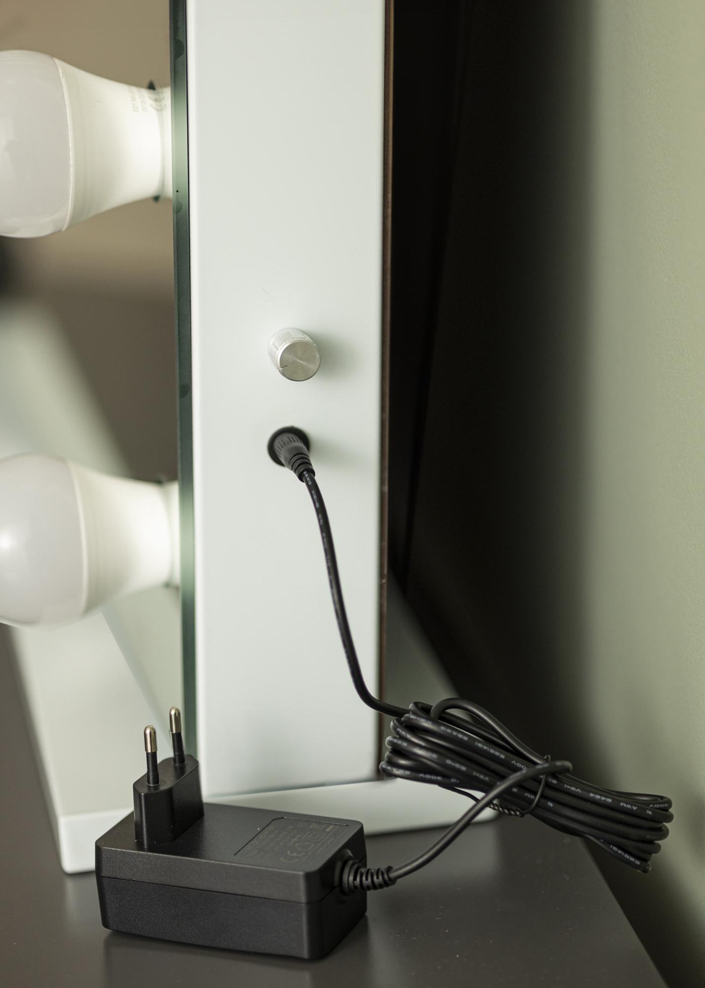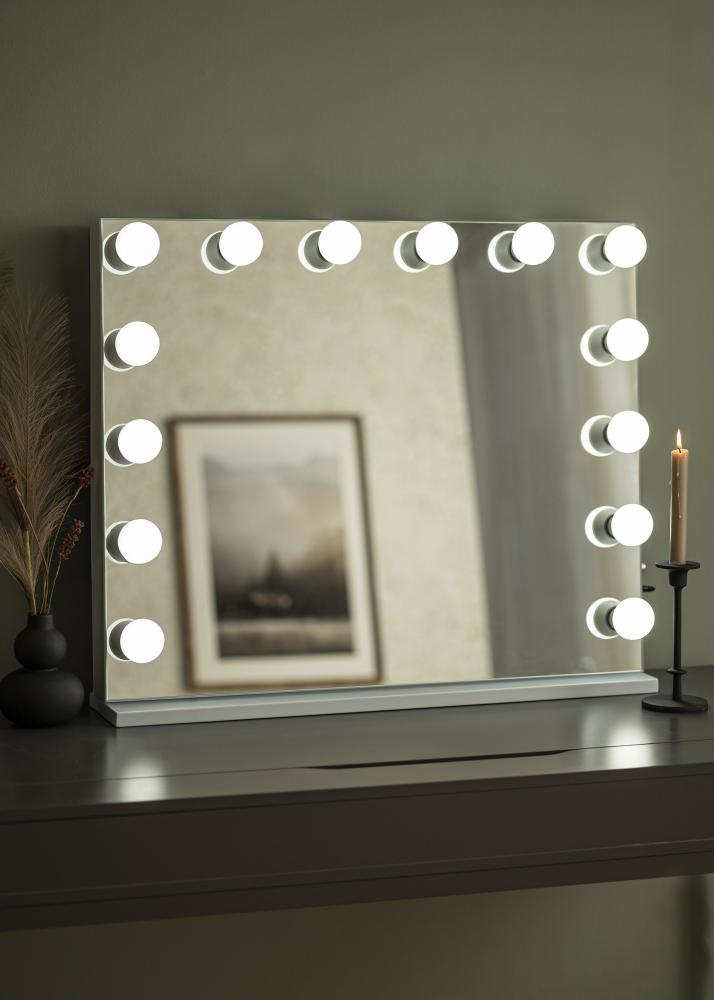 Toto je jedinečné kosmetické zrcadlo s designem, který evokuje šatnu v Hollywoodu. Velká plocha zrcadla o rozměrech 80x65 cm je orámována 14 žárovkami s paticí E27. Výsledkem je rovnoměrné, chladné bílé světlo, které je stejně vhodné pro líčení jako pro trendy světelný zdroj na console v obývacím pokoji. Osvětlení je navíc stmívatelné, pro ještě větší flexibilitu. Stačí otočit knoflík na jedné kratší straně zrcadla a nastavit si světlo podle svého přání.
