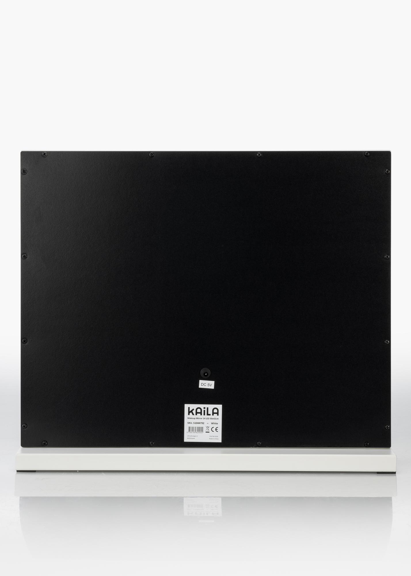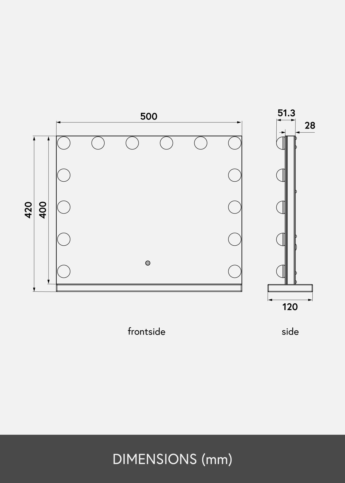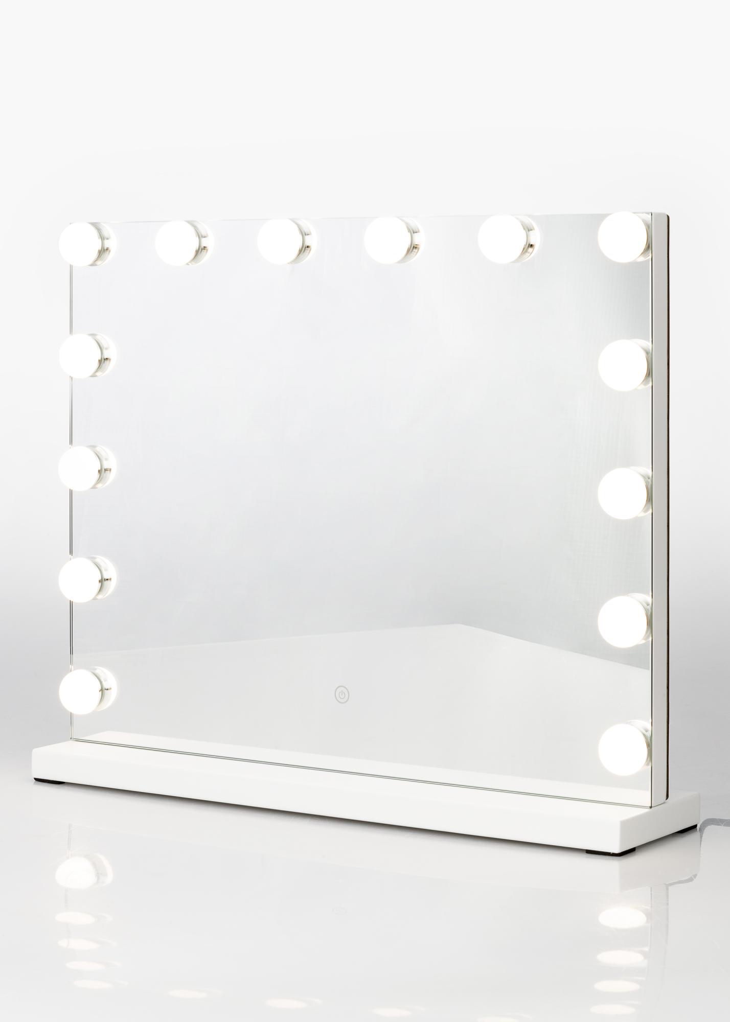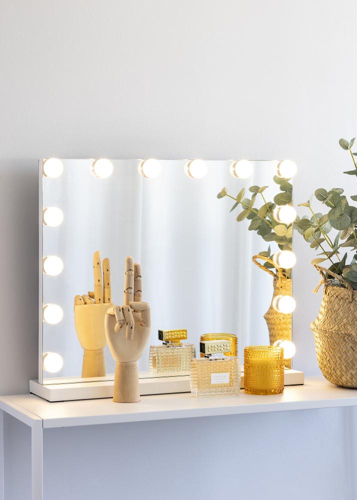 Přeměňte místnost na makeup studio s tímto luxusním kosmetickým zrcadlem v Hollywood stylu od KAILA! Toto je velké kosmetické zrcadlo s integrovaným osvětlením v podobě 14 LED žárovek, které elegantně lemují velkou zrcadlovou plochu. LED osvětlení je stmívatelné a má teplý bílý svit o teplotě 3000K. Osvětlení snadno zapnete stisknutím dotykového tlačítka na obrazovce a snadno nastavíte jeho intenzitu podržením tlačítka. Zrcadlo měří 50x45 cm. Elektrické připojení se zástrčkou.