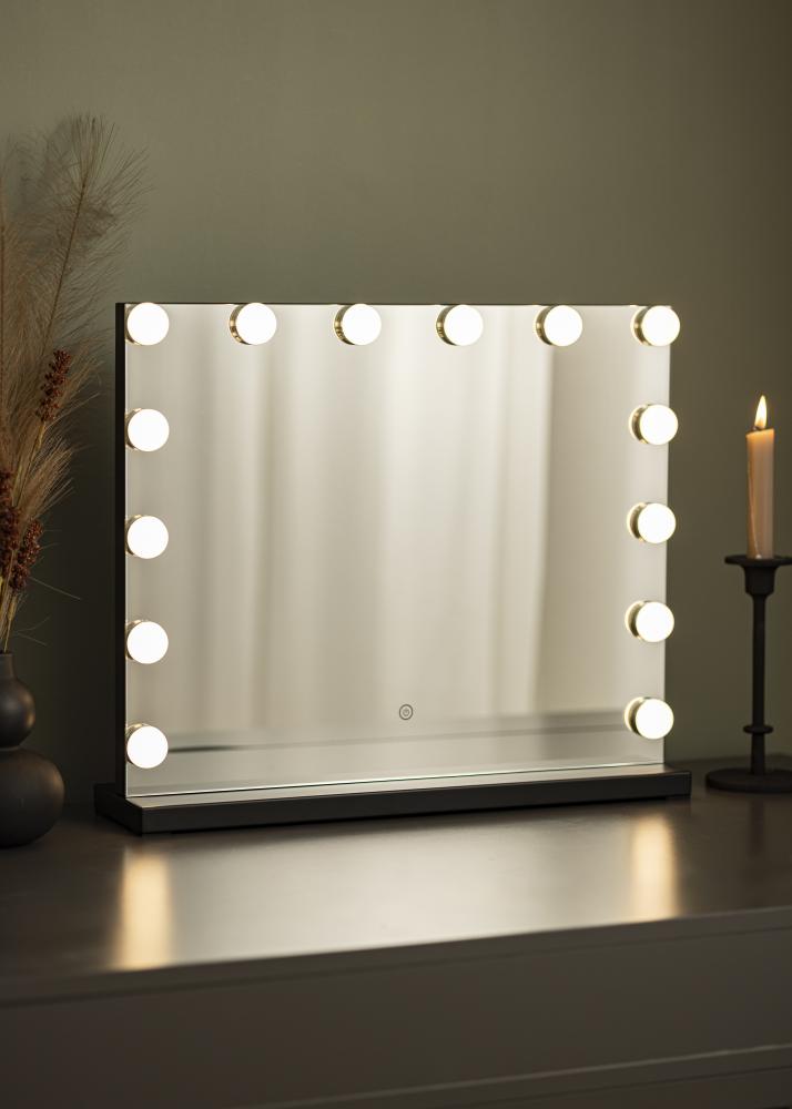 Přeměňte místnost na makeup studio s tímto luxusním kosmetickým zrcadlem v hollywoodském stylu od KAILA! Toto je velké kosmetické zrcadlo s integrovaným osvětlením v podobě 14 LED žárovek, které elegantně orámují velkou plochu zrcadla. LED osvětlení je stmívatelné a má teplý bílý svit o 3000K. Osvětlení snadno zapnete stisknutím dotykového tlačítka na obrazovce a jednoduše upravíte intenzitu přidržením tlačítka. Zrcadlo měří 50x45 cm. Elektrické připojení s vidlicí.
