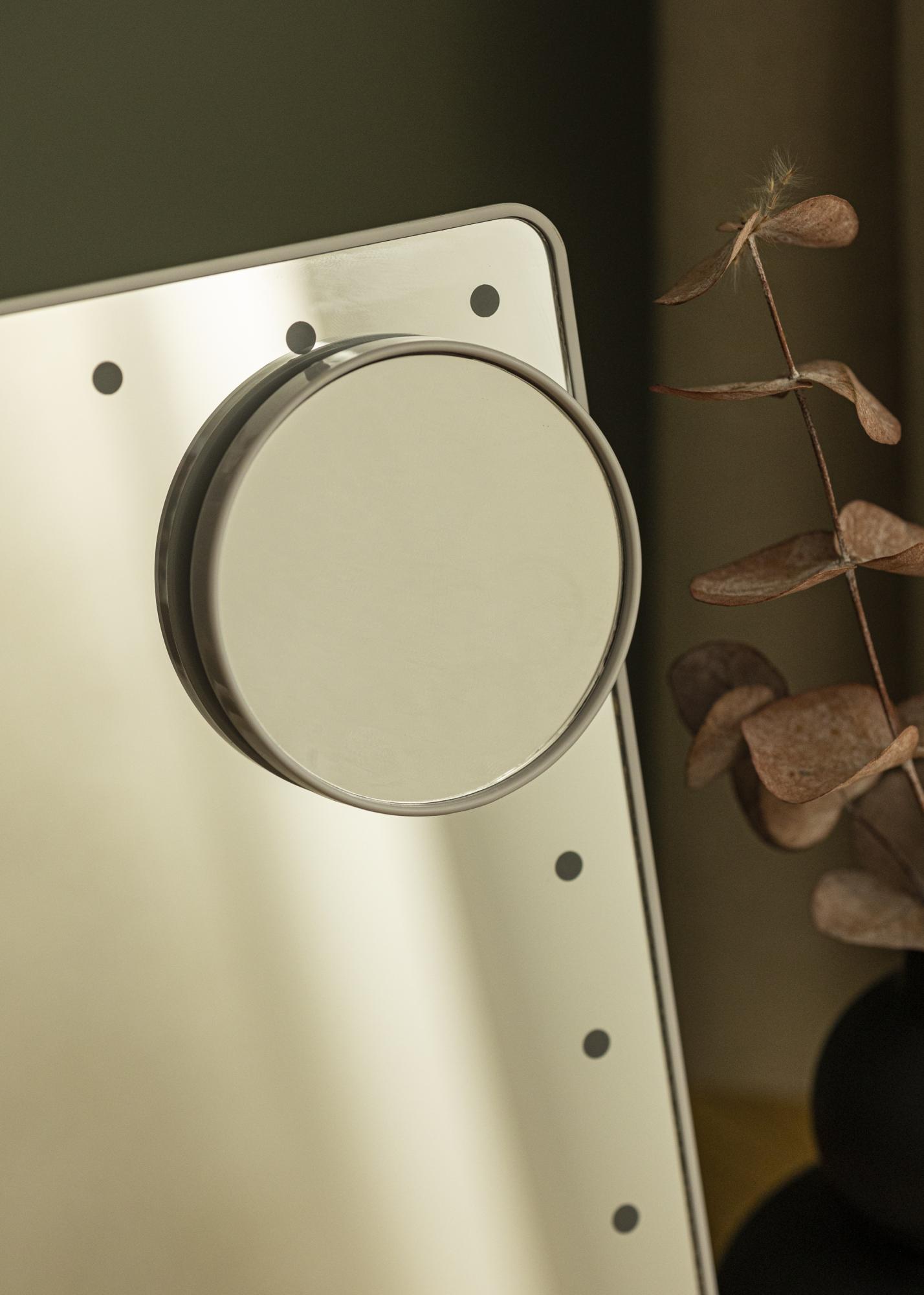 Zrcadlo má kompaktní velikost s odrazovou plochou 16,5x25 cm, což umožňuje jeho snadné přemísťování. Odrazová plocha může být otočena a nakloněna tak, abyste mohli nastavit úhel, který vám vyhovuje. Součástí je menší zrcátko s 2x a 3x zoomem, které lze použít samostatně nebo připevnit na sklo většího zrcadla. Toto kosmetické zrcadlo má také vestavěné LED osvětlení, které vrhá studené bílé světlo na vaši tvář, když se zrcadlíte. Osvětlení lze zapnout a vypnout pomocí tlačítka na zadní straně zrcadla a máte také možnost stmívat světlo. Zrcadlo je napájeno vestavěnou baterií, která se dobíjí přes USB připojení. Nabíjecí kabel je součástí balení.