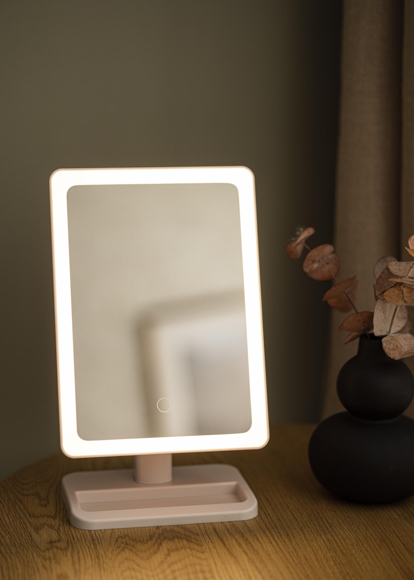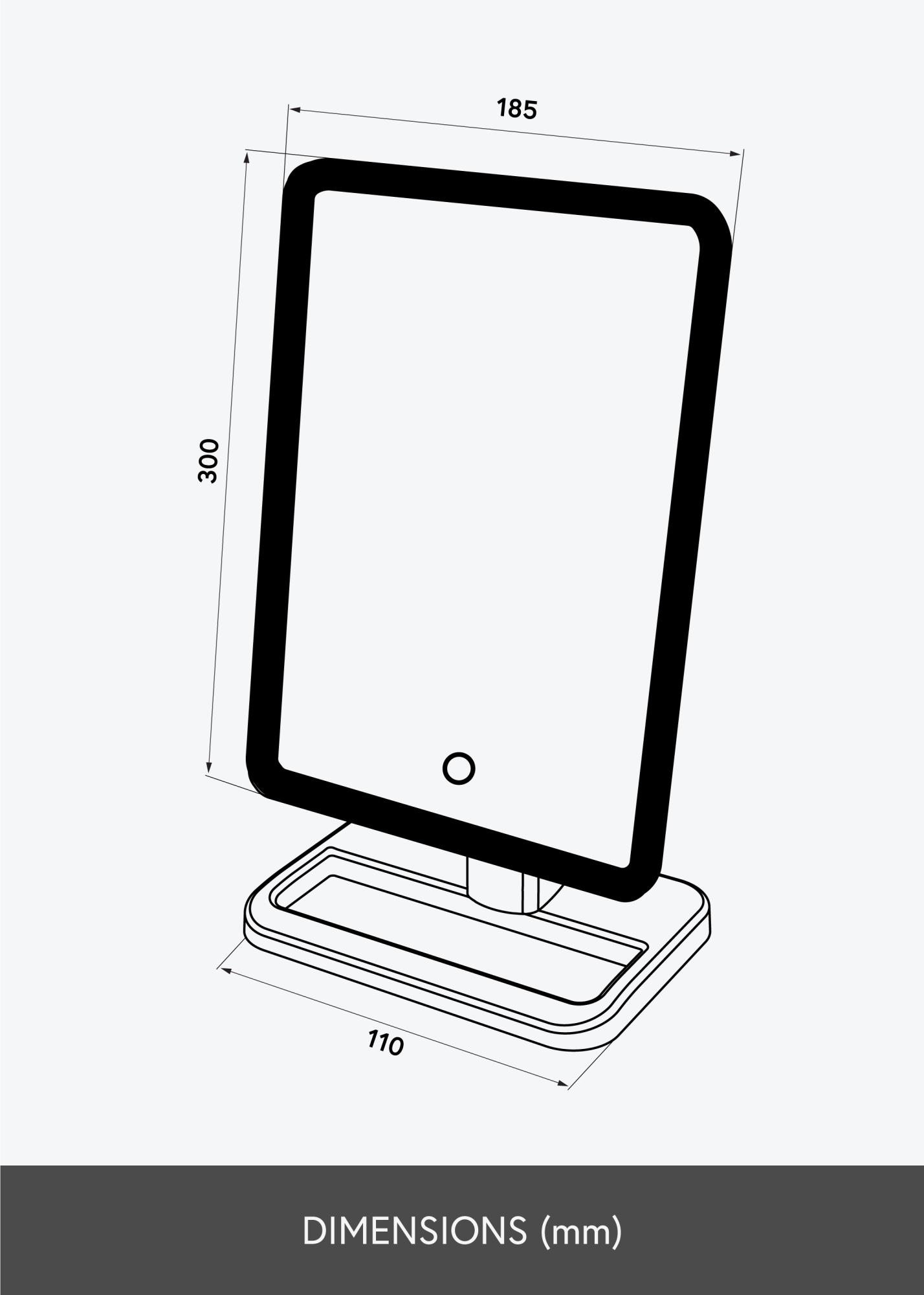 Zrcadlo má stylový vzhled, s neutrální bílou barvou a LED páskem, který rámuje zrcadlovou plochu o rozměrech 16,5x25 cm. Můžete ztlumit osvětlení podržením tlačítka na zrcadlové ploše po několik sekund. Tímto způsobem si můžete nastavit jas, který vám nejlépe vyhovuje. Chytrý design zrcadla vám umožňuje natáčet a naklánět zrcadlovou plochu podle potřeby a nízká hmotnost zrcadla usnadňuje jeho přemísťování. Součástí je menší zrcadlo s 10x zoomem. Je ideální, když chcete zrcadlit část obličeje do detailu. Zrcadlo je napájeno zabudovanou baterií, která se nabíjí pomocí přiloženého nabíjecího kabelu.