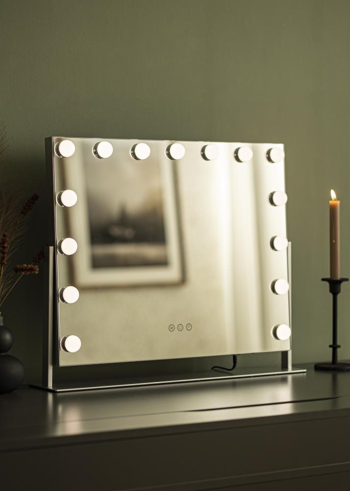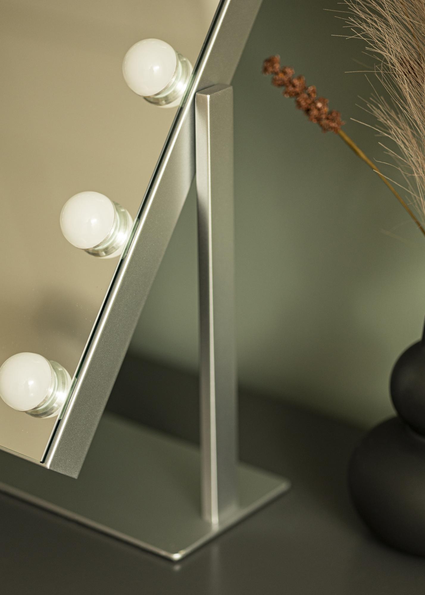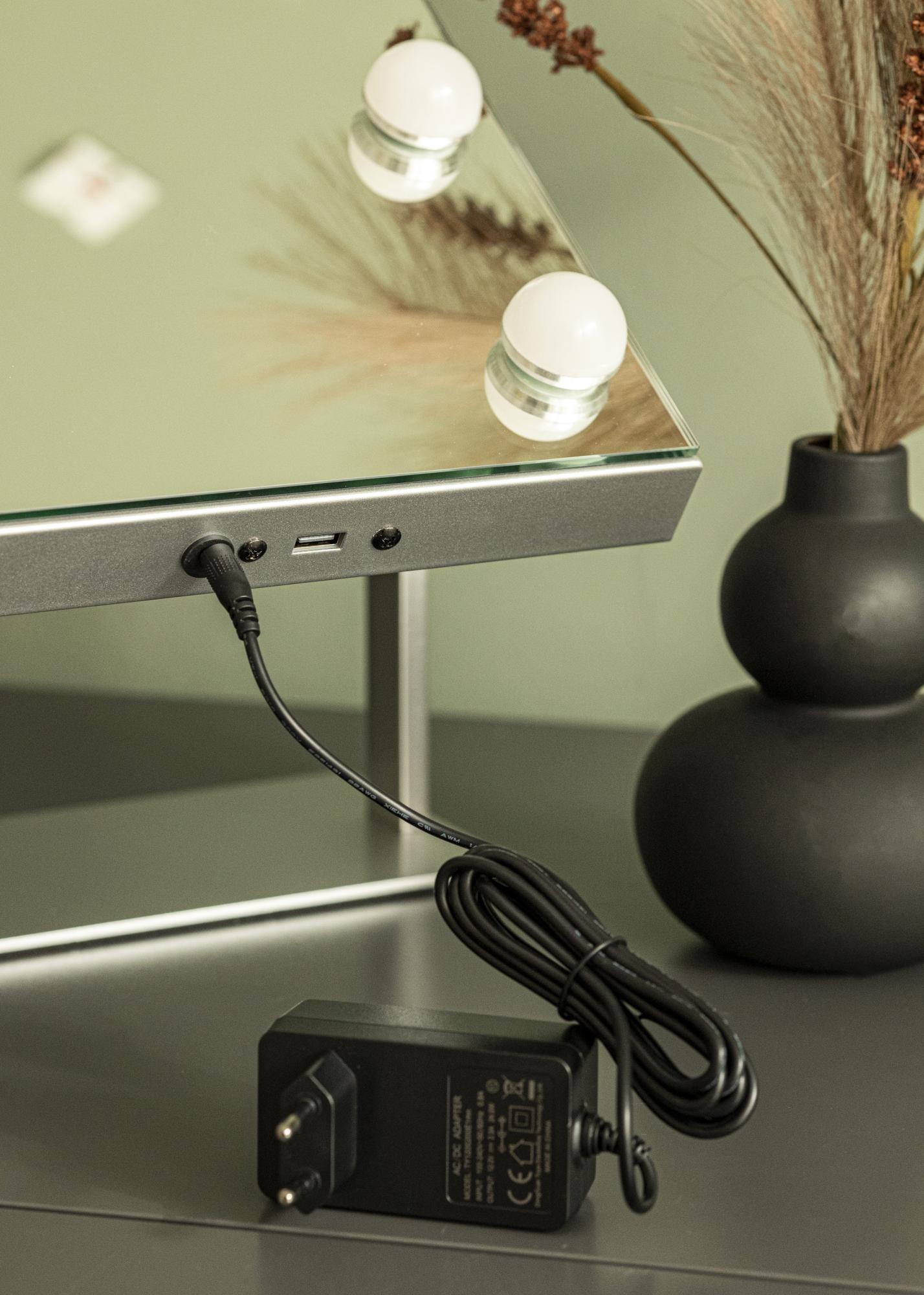 Toto zrcadlo má stojan ve stříbrné barvě, který nejen poskytuje elegantní vzhled, ale také umožňuje naklonit zrcadlový povrch. Na dolním okraji zrcadla je USB port pro nabíjení vašich chytrých zařízení.