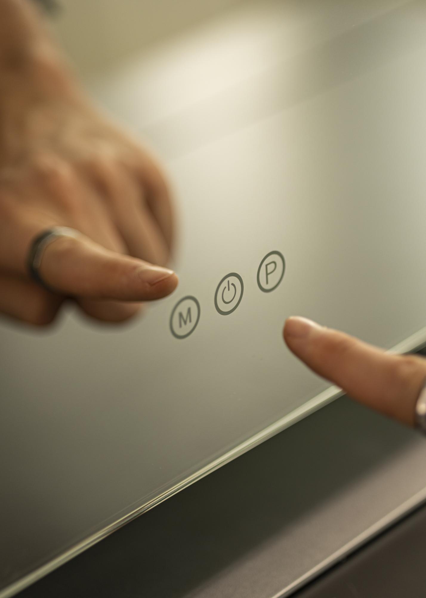 S elegantným kosmetickým zrcadlem můžete vytvořit luxusnější atmosféru v každé místnosti. Toto zrcadlo má vestavěné LED osvětlení, které můžete přizpůsobit podle toho, zda chcete mít příjemné podsvícení v obývacím pokoji nebo ostré světlo v kosmetickém koutku. Pro úpravu osvětlení používáte dotyková tlačítka v dolním okraji zrcadla; tlačítko "M" upravuje teplotu barvy světla a tlačítko "P" mění jas. Je zde také tlačítko pro zapnutí/vypnutí osvětlení zrcadla. Připojení k napájení se provádí pomocí zástrčky.