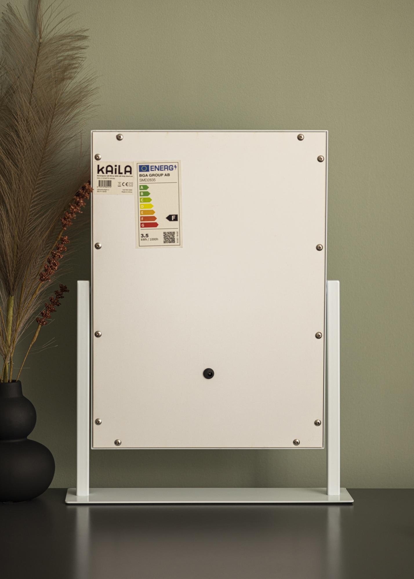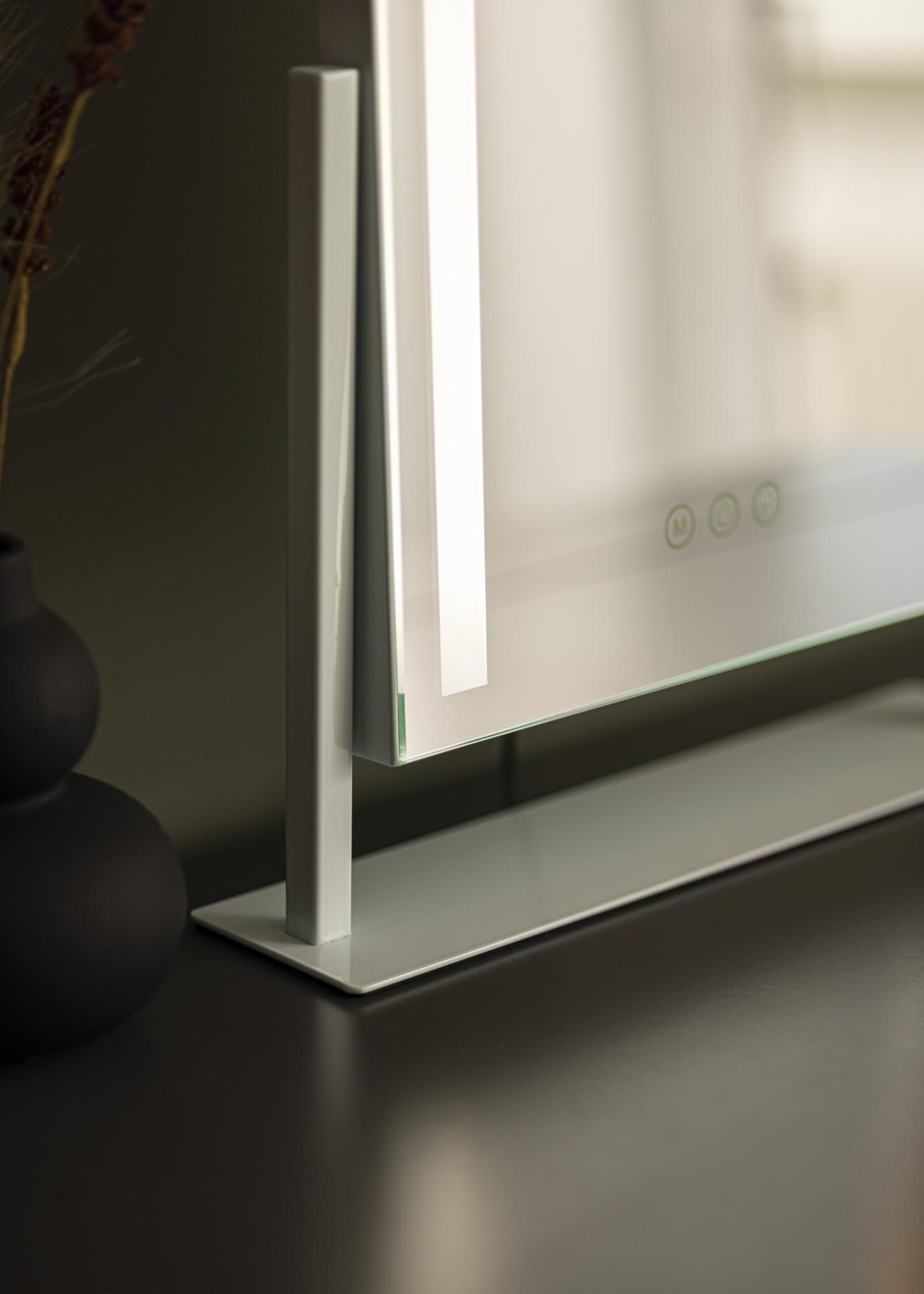 Toto zrcadlo má stojan z kovu a elegantní bílou barvu, která dodává stylový vzhled. Díky kompaktnímu formátu, se zrcadlovou plochou 30x41 cm, se snadno vejde na stůl v líčícím koutku i na komodu v předsíni nebo obývacím pokoji. Chytrý design vám umožní naklánět zrcadlo. Elektrické připojení se provádí pomocí zástrčky.