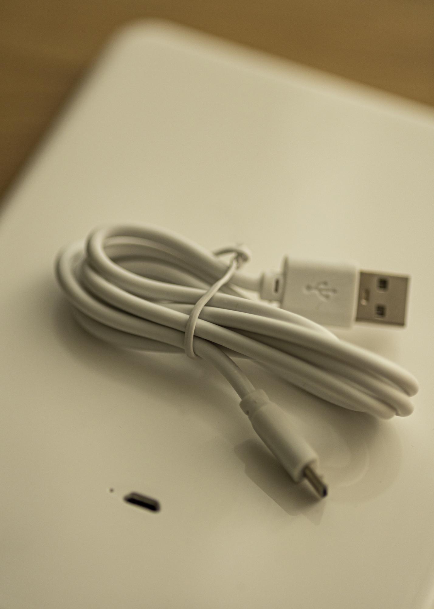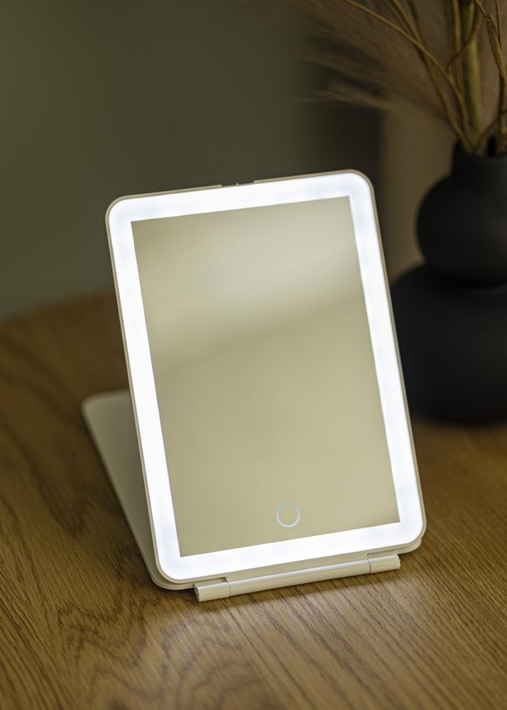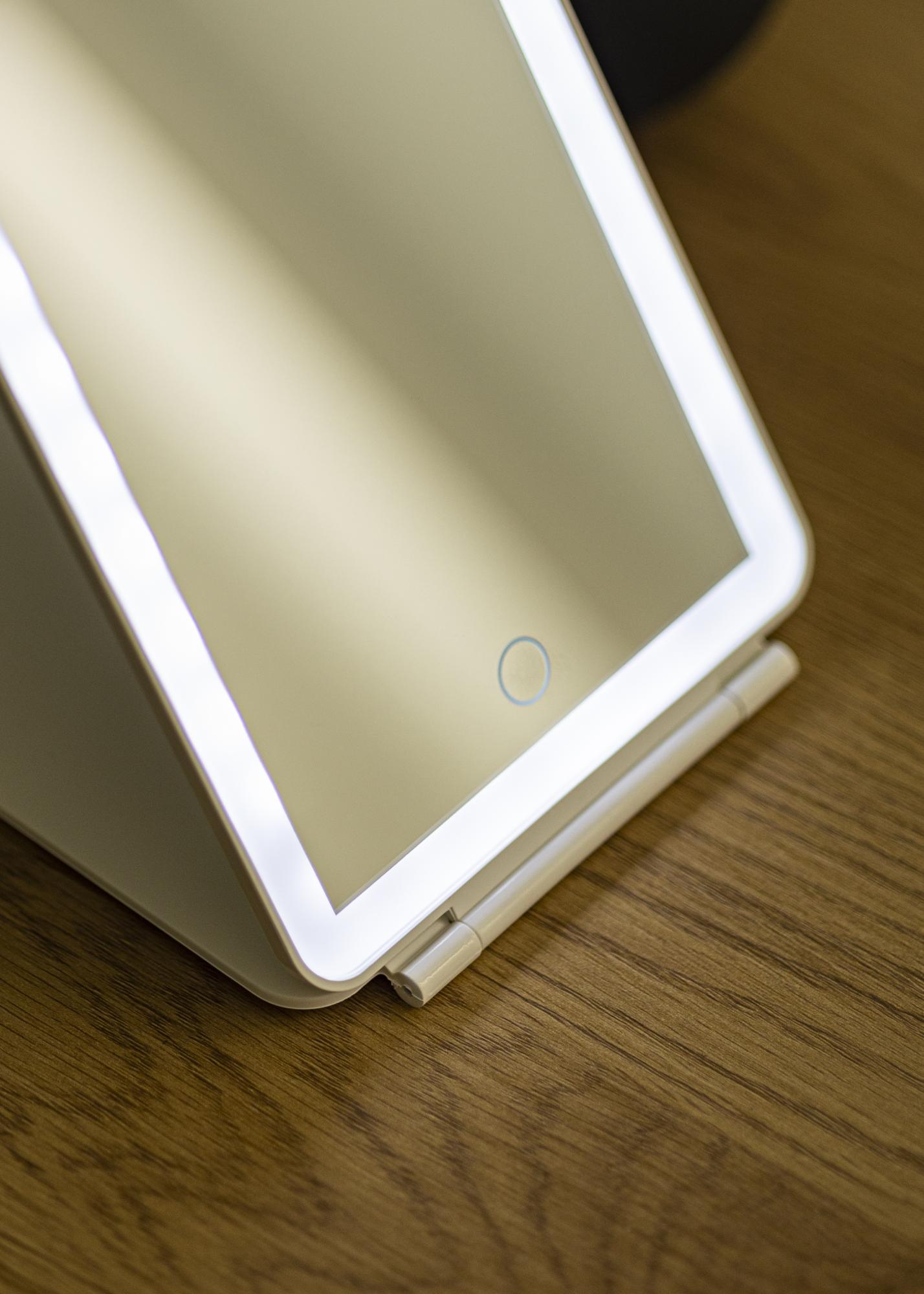 Toto je bílé zrcadlo s vestavěným LED osvětlením, které poskytuje příjemné světlo na vaši tvář. Je napájeno bateriemi a snadno se nabíjí přes USB připojení, když se baterie začínají vybíjet. Součástí balení je nabíjecí kabel. Zrcadlo se zapíná pomocí dotykového tlačítka na zrcadlové ploše, kterým můžete také nastavit osvětlení. Podržením tlačítka na několik sekund můžete nejen ztlumit světlo, ale také nastavit barevnou teplotu.