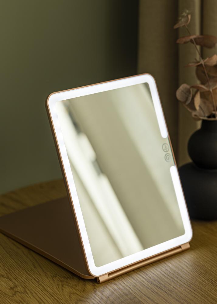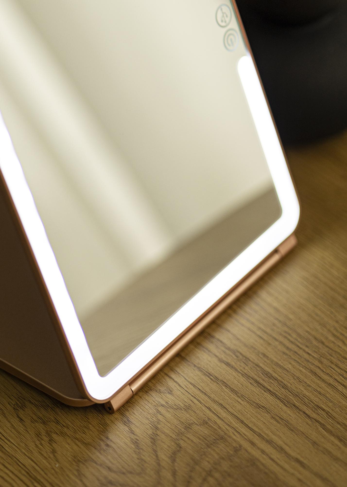 Toto je kosmetické zrcadlo, které je ideální k použití, když jste na cestách, díky svému kompaktnímu formátu, skládacímu designu a integrovanému LED osvětlení. Navíc má módní odstín v růžovém zlatě. Kosmetické zrcadlo se snadno vejde do vaší tašky, jak na každodenní použití, tak při cestování. Skládací design chrání zrcadlovou plochu před poškrábáním a špínou a umožňuje naklonění zrcadla do požadované polohy. Zrcadlo je vybaveno běžným zrcadlovým sklem a dvěma menšími zrcadlovými plochami; jedna s 5x zvětšením a jedna s 3x zvětšením.