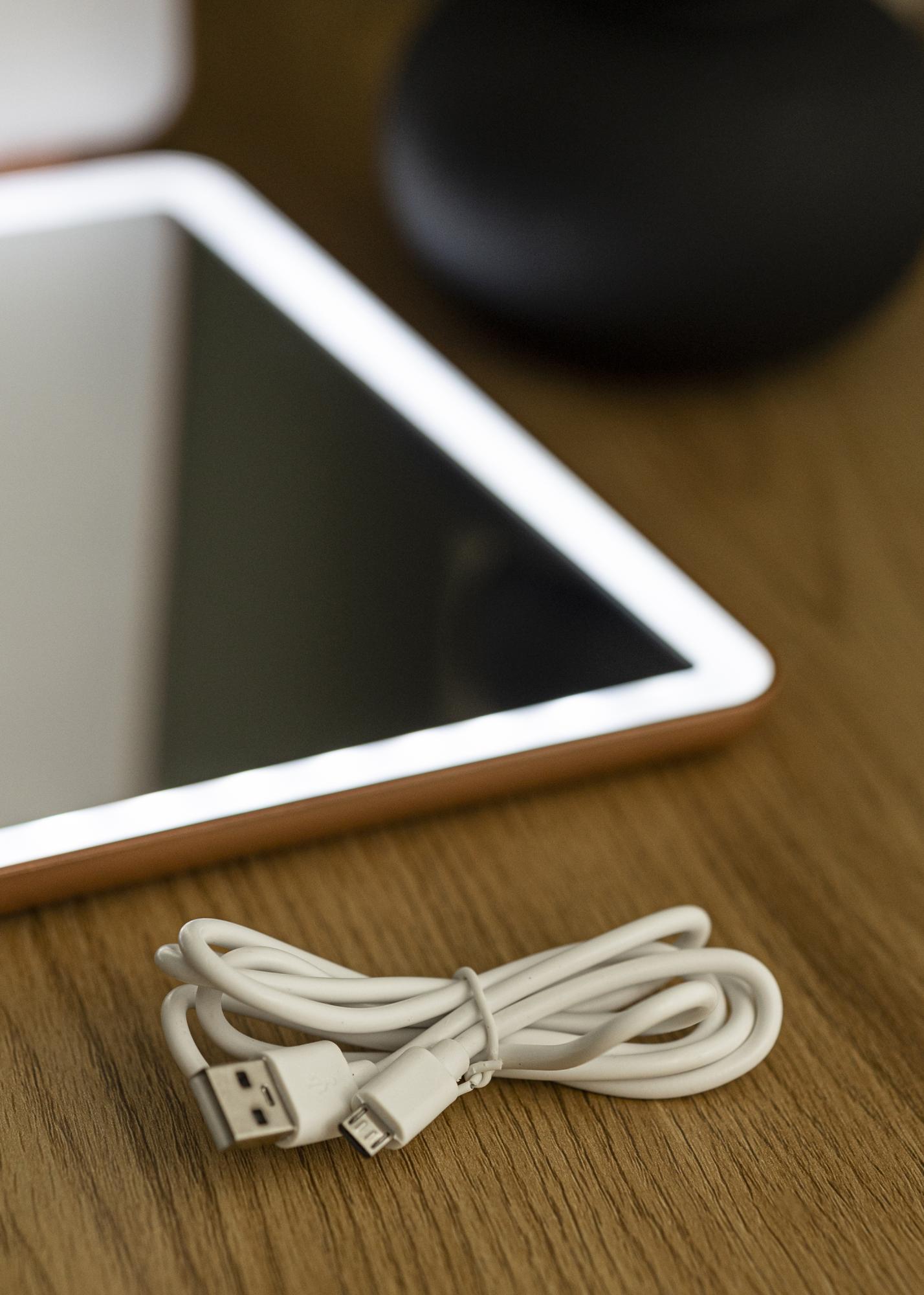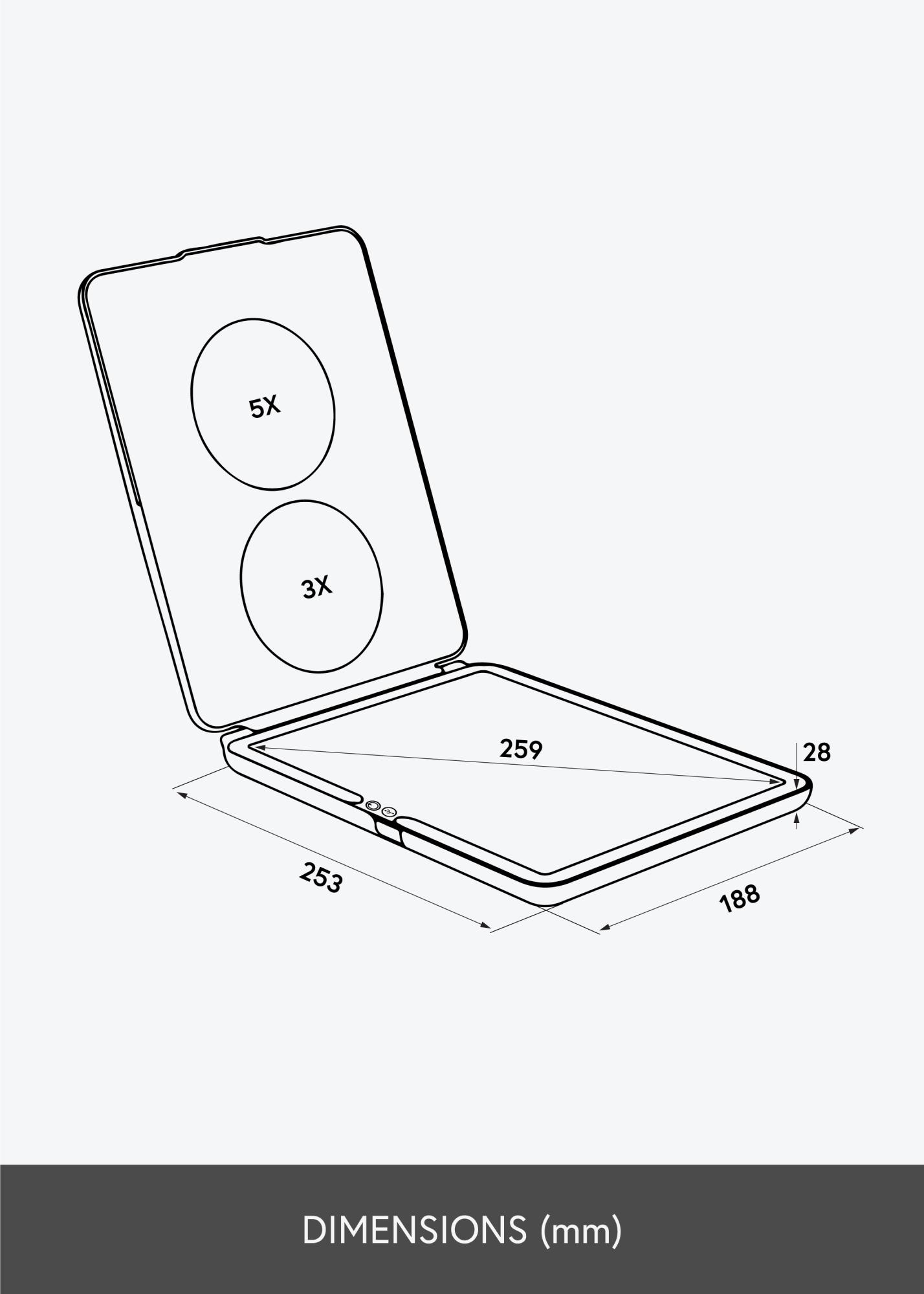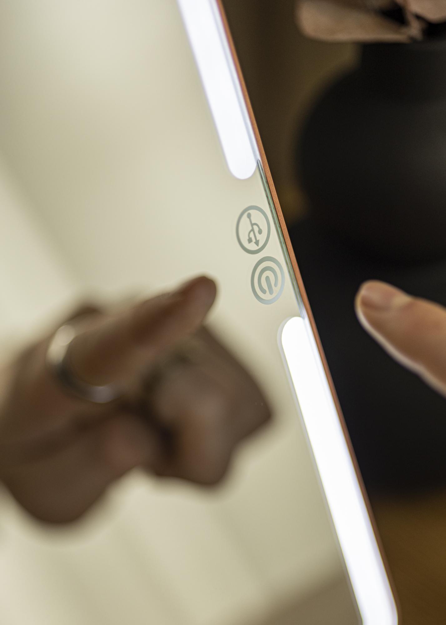 Integrovaný LED pás poskytuje příjemné světlo při zrcadlení. Osvětlení je napájeno vestavěnou baterií, která se snadno nabíjí prostřednictvím USB připojení. Zrcadlo je vybaveno dotykovým tlačítkem, které slouží k zapnutí a vypnutí osvětlení a k jeho ztlumení. Když složíte zrcadlo, když je zapnuté, automaticky přejde do úsporného režimu a světlo se vypne, dokud zrcadlo znovu neotevřete.