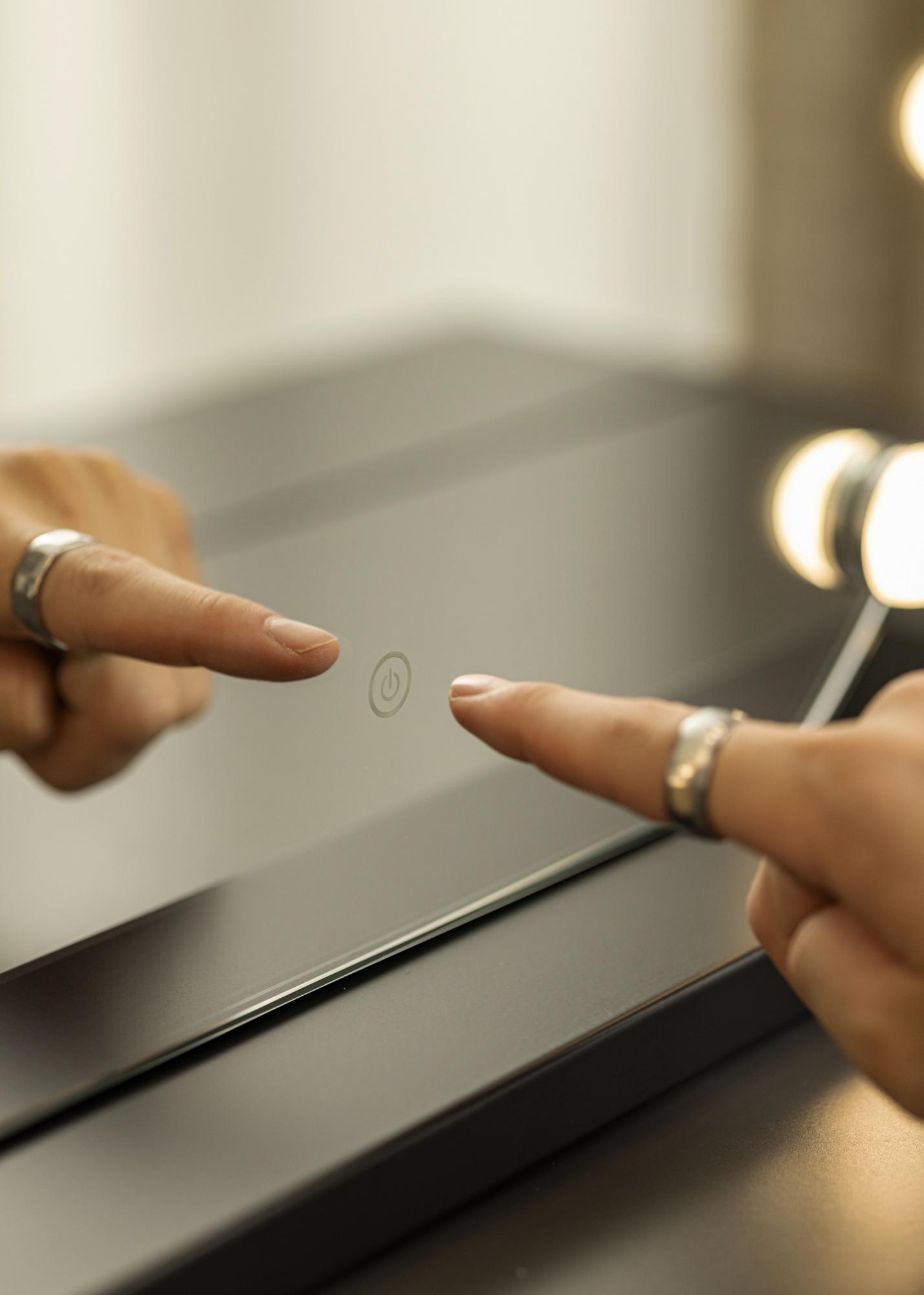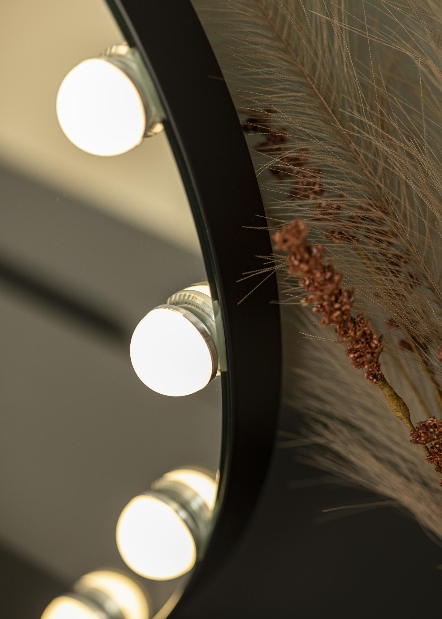 Zažijte konečný pocit luxusu a hollywoodského půvabu s naším kosmetickým zrcadlem s osvětlením v elegantním černém odstínu. Toto kosmetické zrcadlo je vybaveno 12 dekorativními LED žárovkami, které šíří rovnoměrné a teplé bílé světlo o 3000K, což je optimální pro aplikaci make-upu. Osvětlení je aktivováno dotykovým tlačítkem a lze jej snadno nastavit na intenzitu podržením tlačítka. Navíc jsou LED žárovky energeticky úsporné, což poskytuje trvalé a přirozené světlo. Naše kosmetické zrcadlo kombinuje praktickou funkci s trendy designem, což z něj činí dokonalý doplněk do vaší domácnosti, ať už je to ve vašem líčicím pokoji nebo ložnici.