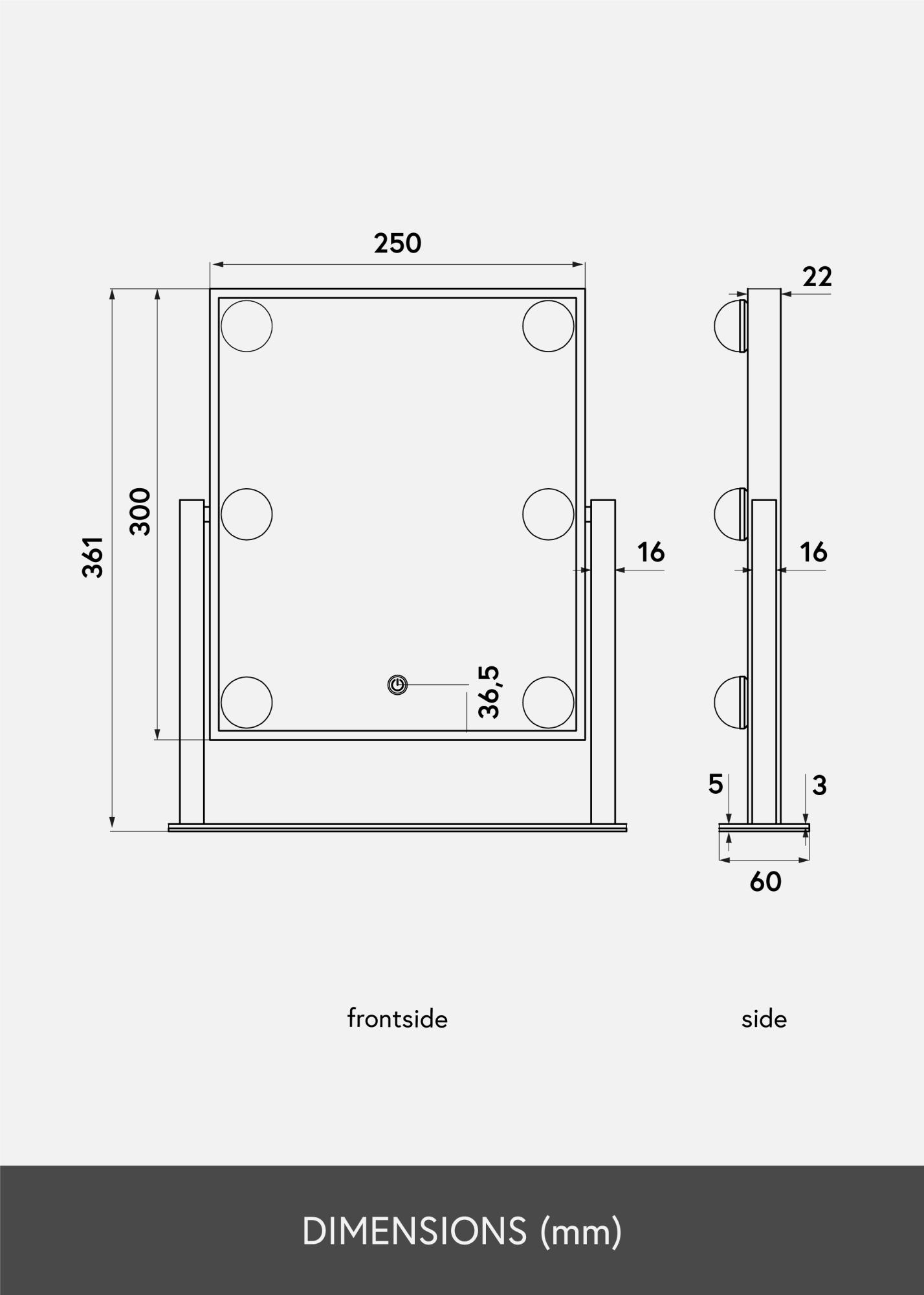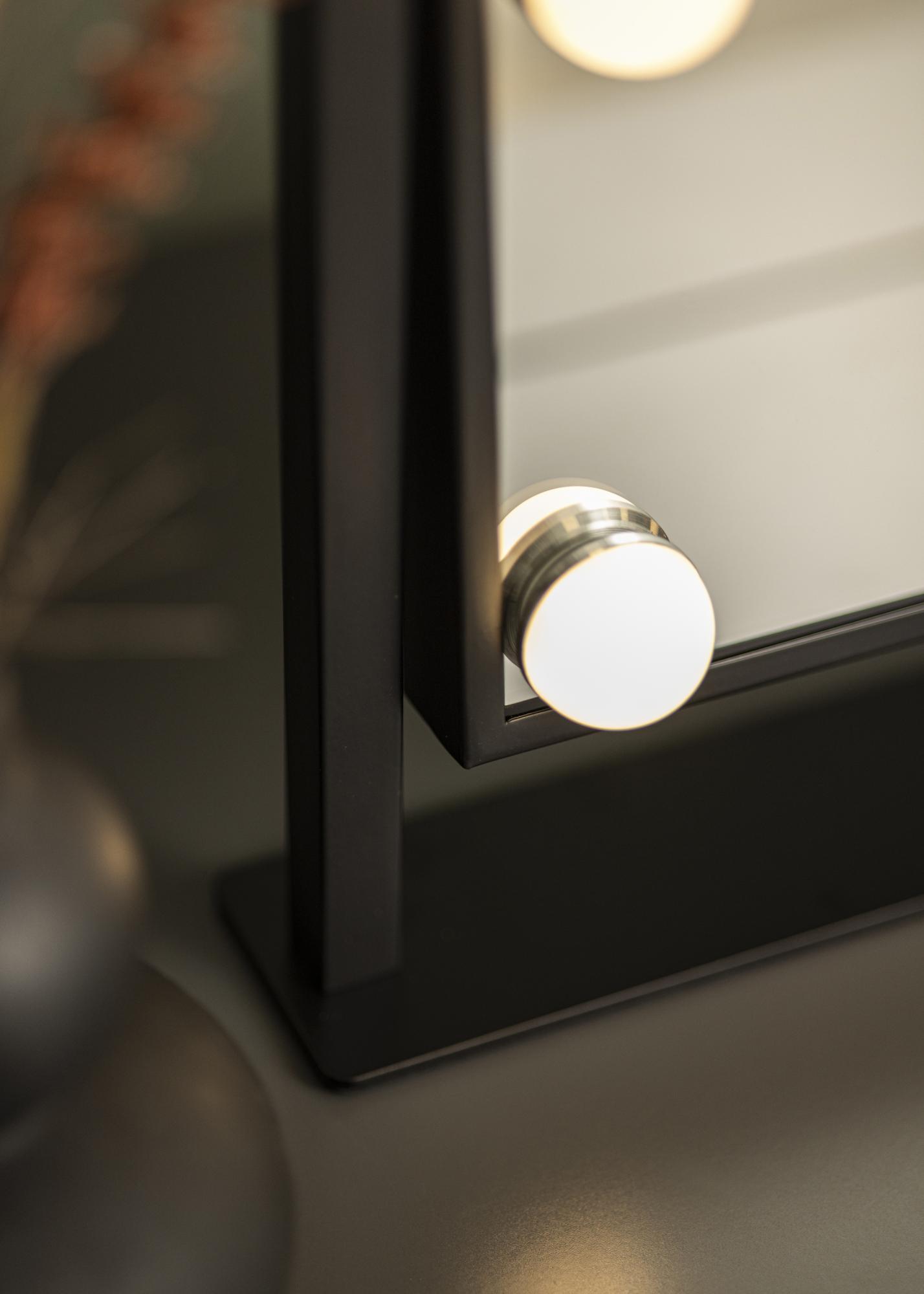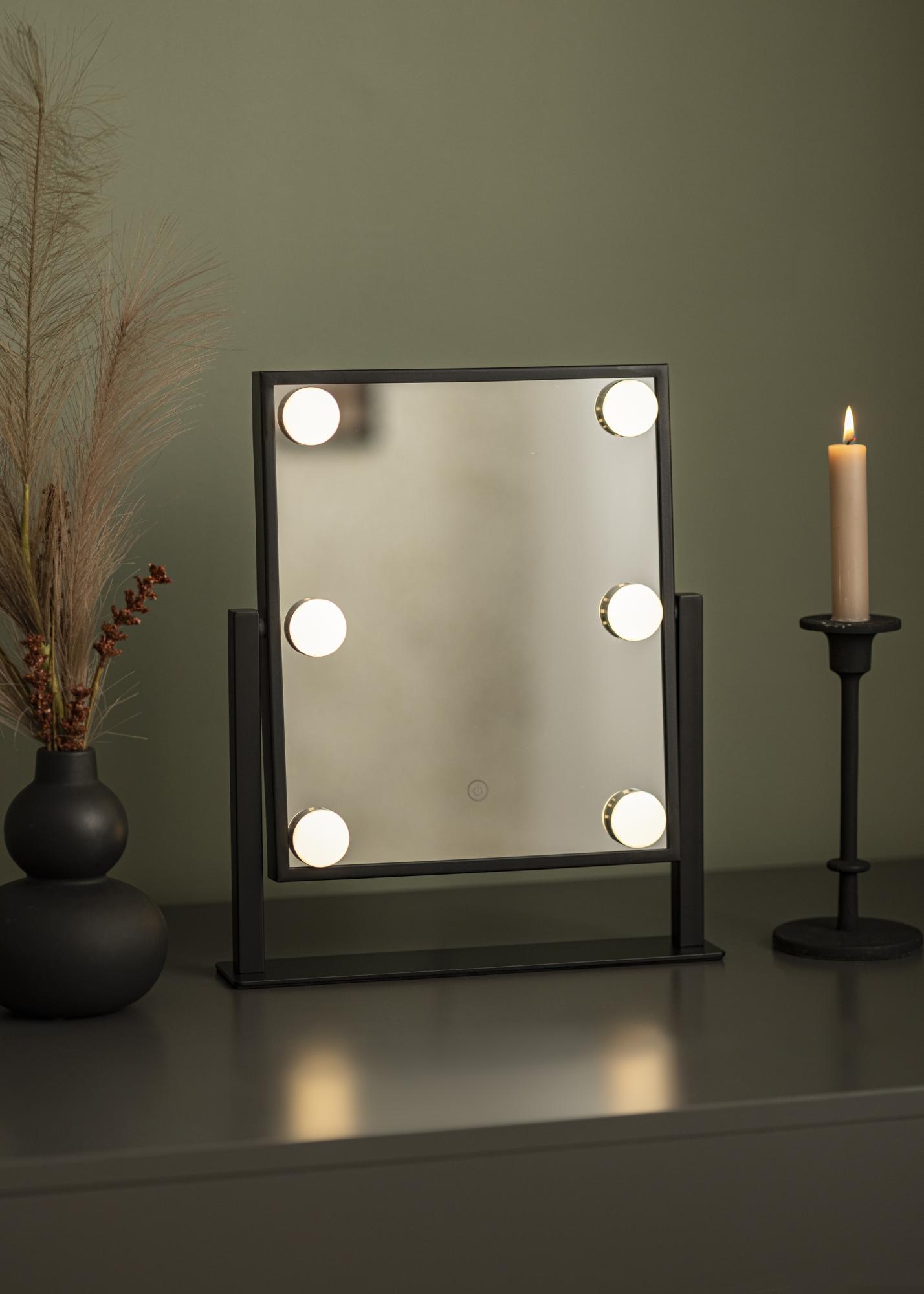 Toto je opravdu luxusní kosmetické zrcadlo se šesti dekorativními a ztlumitelnými LED žárovkami v trendy černém odstínu. Osvětlení poskytuje teplé bílé světlo při 3000K a zapíná se stisknutím dotykového tlačítka. Nastavte intenzitu světla podržením tlačítka na několik sekund. LED je světelný zdroj, který spotřebovává méně energie, má delší životnost a poskytuje přirozenější a rovnoměrnější světlo. Kosmetické zrcadlo lze naklonit, takže můžete snadno aplikovat svůj make-up s větší přesností. Kromě mnoha funkcí má toto kosmetické zrcadlo opravdový hollywoodský pocit a stává se elegantním prvkem v domácnosti!