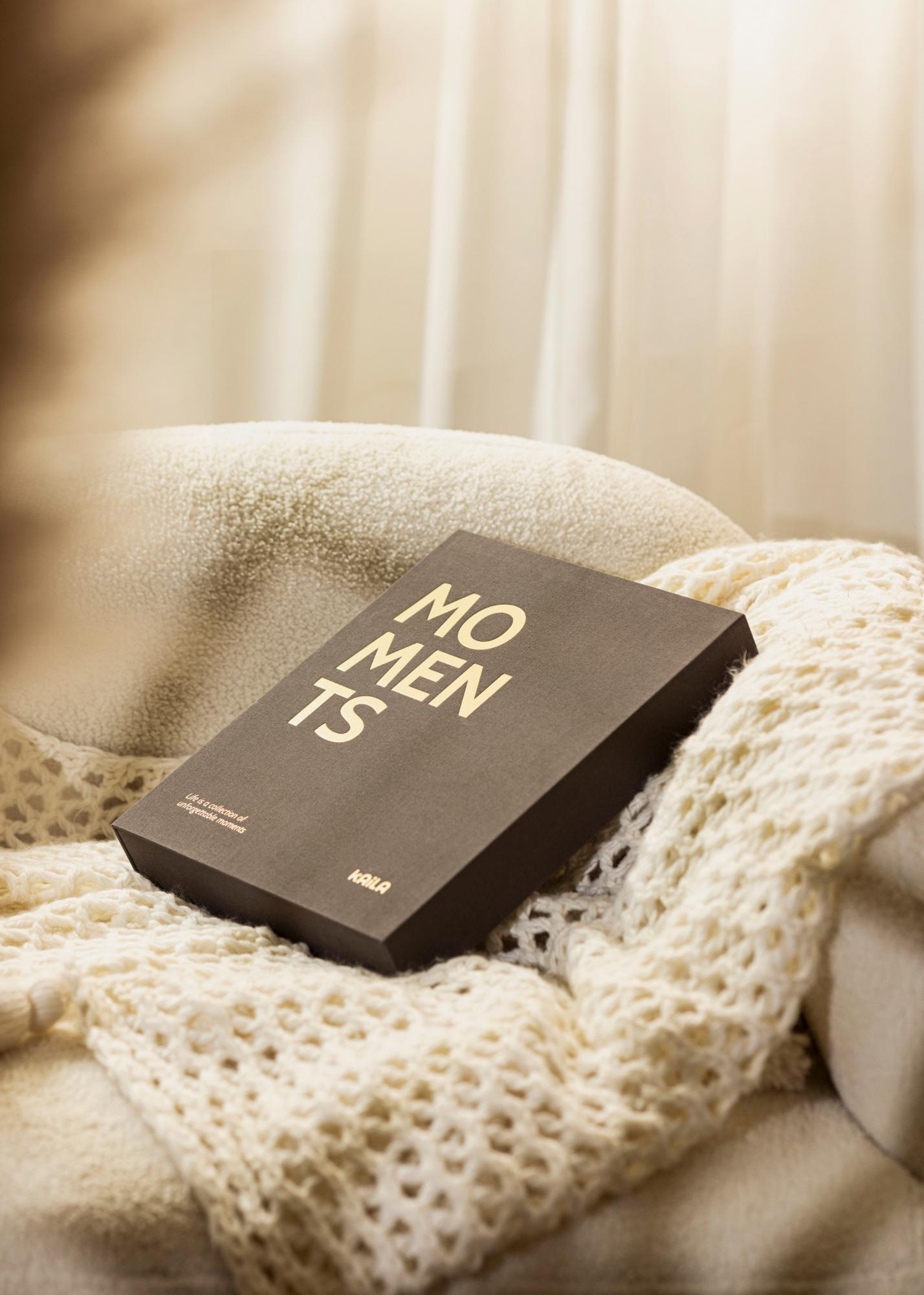 Fotoalbum je navrženo jako krabička, kterou můžete otevřít, abyste se dostali ke svým obrázkům. Obal je vyzdoben černou textilií, která dodává luxusní pocit. Na přední a krátké straně je text „MOMENTS“. V levém rohu na vrchní straně se zobrazuje krásný podtitul „Life is a collection of unforgettable moments“.