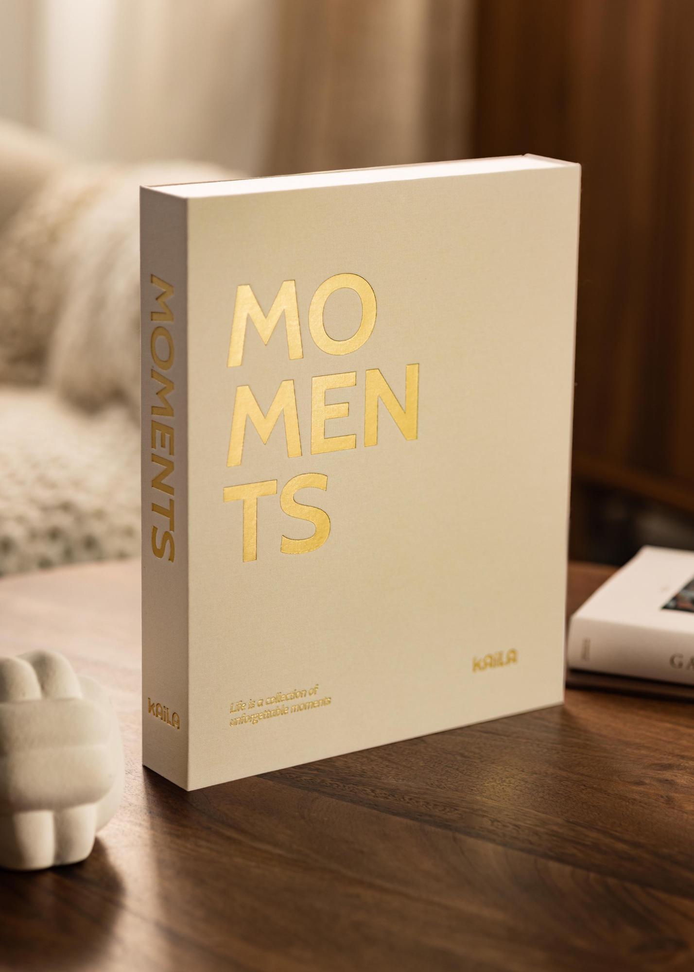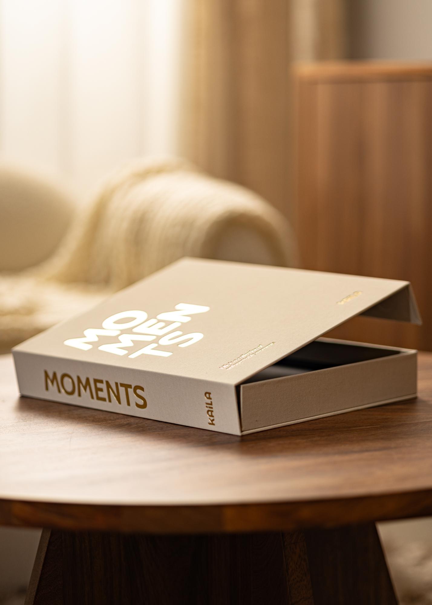 Fotoalbum je navrženo jako krabička, kterou můžete otevřít pro přístup ke svým obrázkům. Obal je ozdoben krémovou textilií, což mu dodává luxusní pocit. Na přední straně a krátké straně je nápis „MOMENTS“. V levém rohu na horní straně je vidět krásný podnadpis „Life is a collection of unforgettable moments“.