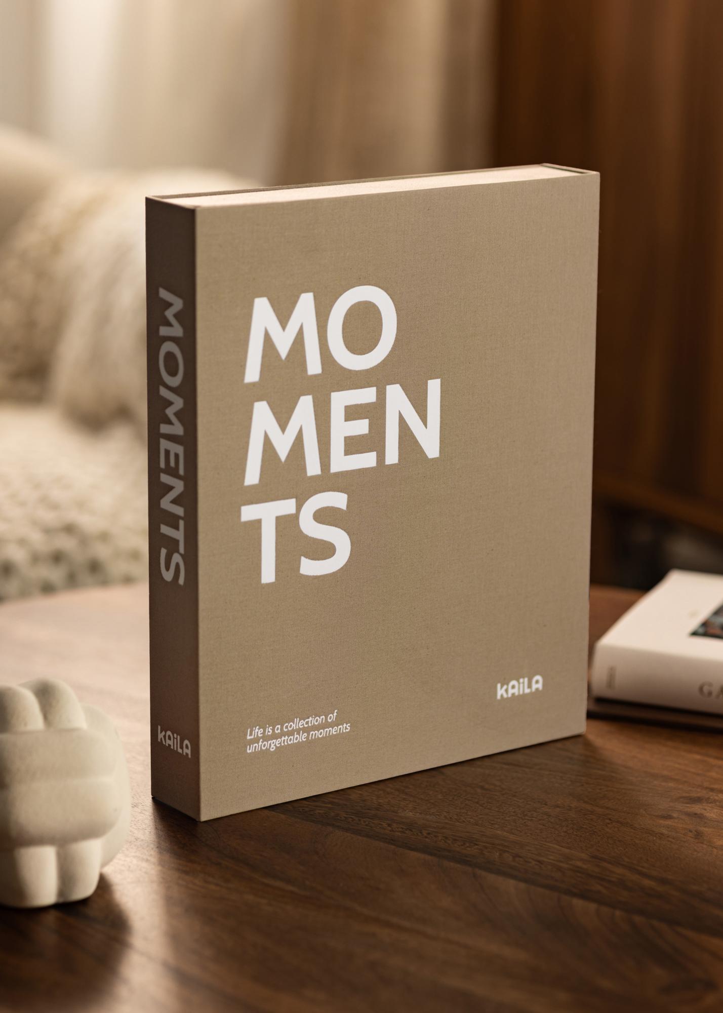 Fotoalbum je navrženo jako krabička, kterou můžete otevřít, abyste se dostali ke svým obrázkům. Obal je ozdoben šedým textilem, což dodává luxusní pocit. Na přední straně a na okraji je text „MOMENTS”. V levém rohu nahoře je vidět krásný podtitul „Life is a collection of unforgettable moments”.