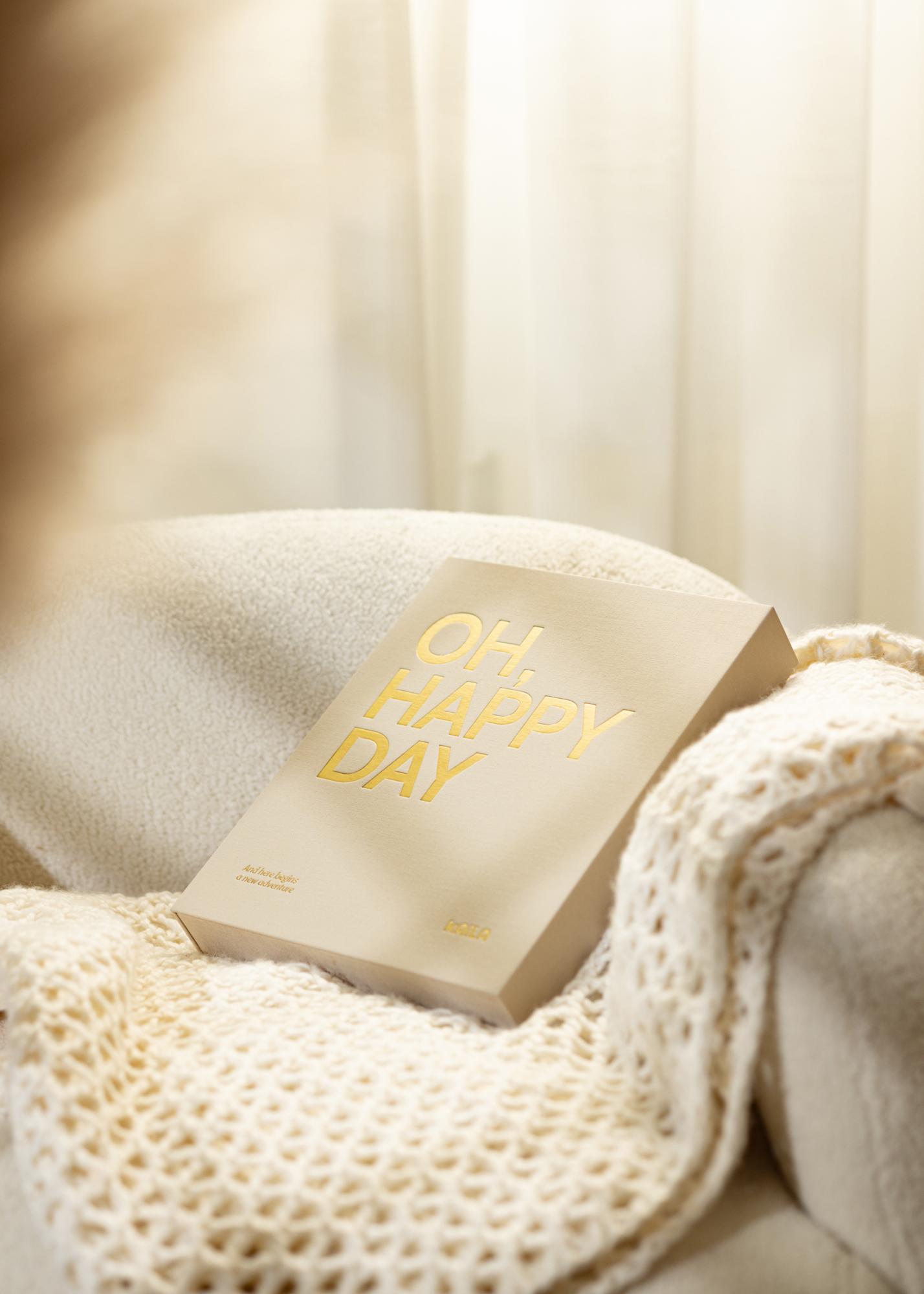 Zde je dokonalé fotoalbum pro vaše nejšťastnější vzpomínky od KAILA! Uchovávejte je stylově v textilním Coffee Table Photo Albu, které se zároveň stane krásným dekoračním prvkem vašeho domova. Toto album má na přední straně tištěný název „OH, HAPPY DAY“ velkými bílými písmeny a podtitul „And here begins a new adventure“.