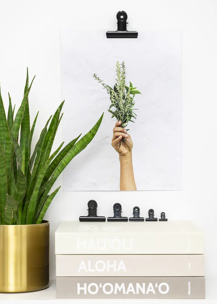 Tato černá kovová svorka má elegantní matný povrch a poskytuje vašim plakátům a tiskům šik a trendové zavěšení. Otevření svorky má pevný úchop, takže můžete připevnit i ten nejtenčí papír, ale zároveň ji lze použít pro motivy s trochu větší tloušťkou. Pokud máte velký plakát, který chcete pověsit, můžete použít dvě svorky na plakáty. Design kovové svorky je elegantní a otvory v kulatém vršku svorky usnadňují a umožňují jednoduché zavěšení na zeď pomocí malé hřebíku nebo šroubu.