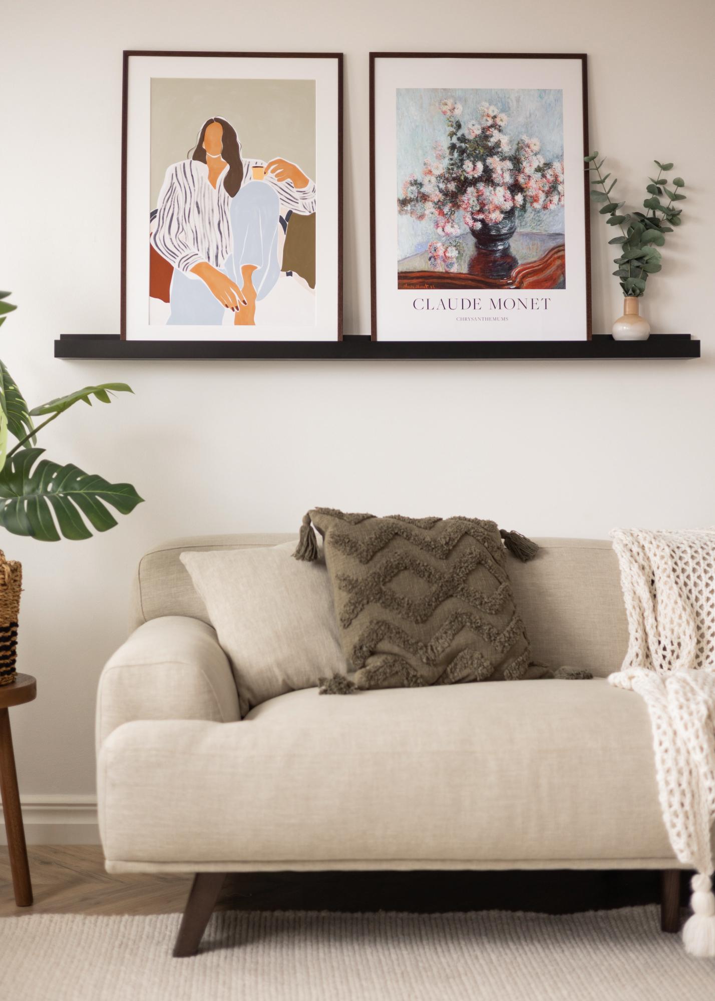 Zobrazit a obměnit svou nástěnnou uměleckou galerii jednoduše a elegantně s elegantní poličkou na obrazy! Tato polička na obrazy je vyrobená z MDF a je trendy natřená na černo s krásným, pololesklým povrchem. Polička na obrazy má elegantní design s rovnými, jednoduchými liniemi a minimalistickým dojmem. Police má uprostřed vytvarovaný zářez, který slouží jako opora pro vaše obrazy a poskytuje jim elegantní úhel, kde se opírají o zeď.