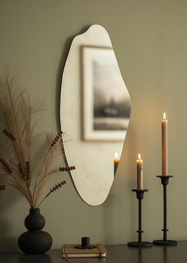 Toto je podélné zrcadlo s krásným asymetrickým tvarem, který z něj činí vzrušující interiérový prvek, jenž se dokonale hodí do moderního domova. Zrcadlo má praktické nástěnné úchyty na zadní straně a je zavěšeno na zdi v místnosti dle vašeho výběru – hodí se i do koupelny!
