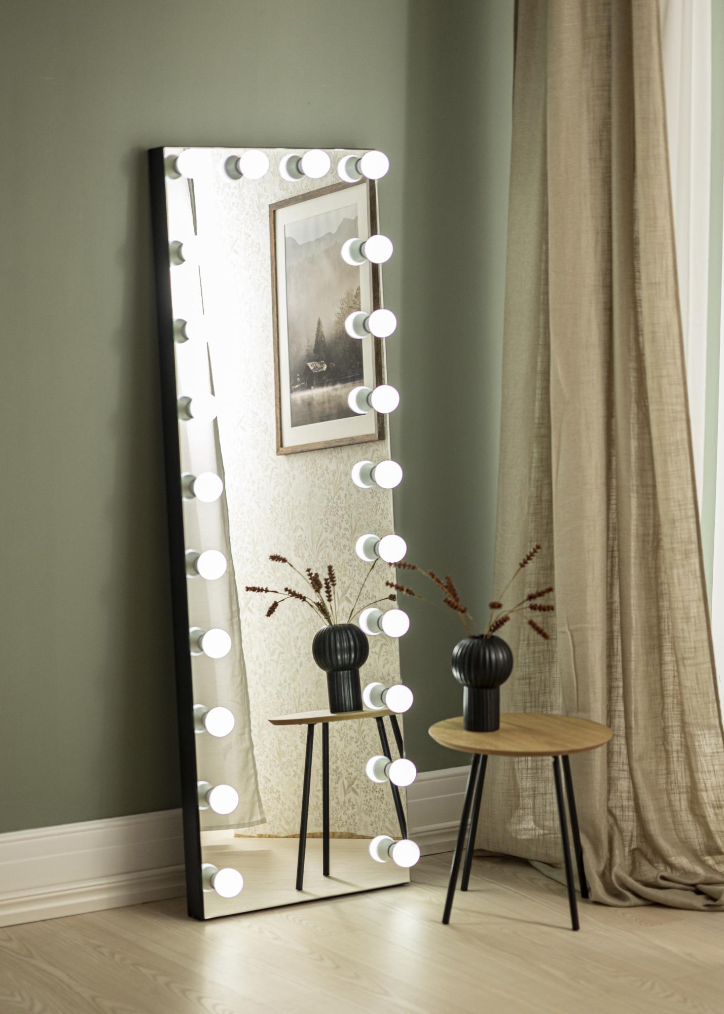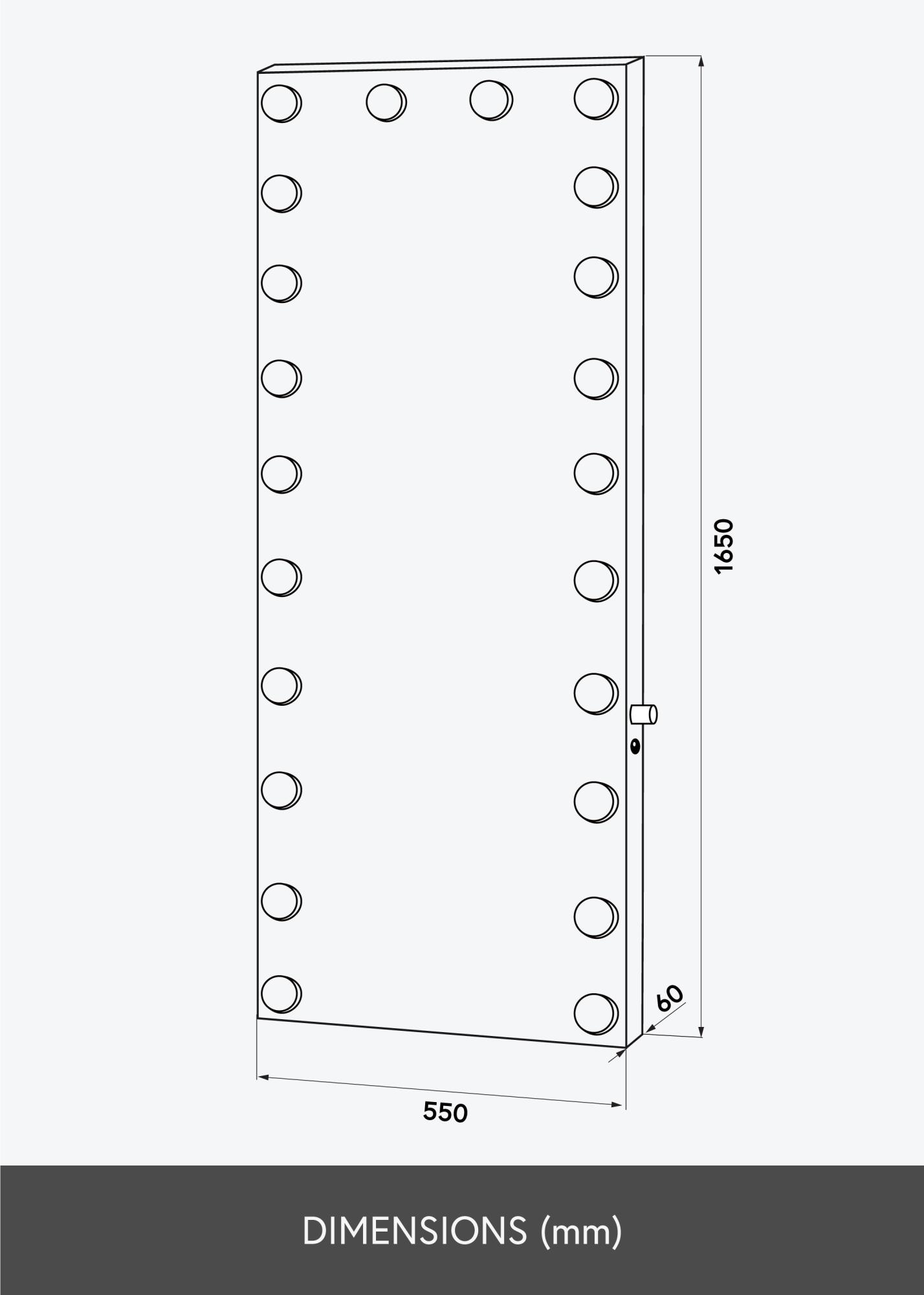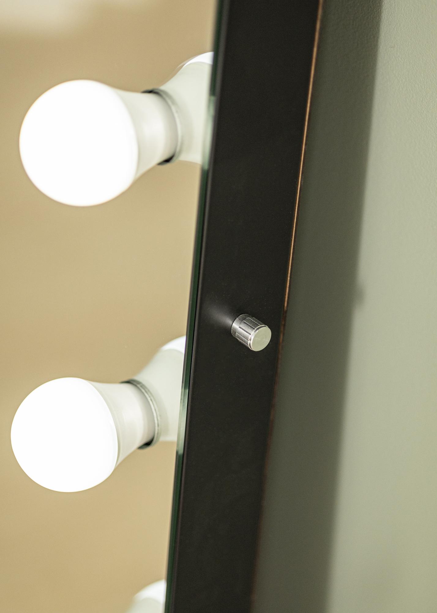 Nástěnné zrcadlo má 22 velkých LED žárovek, které krásně orámují zrcadlovou plochu a dodávají zrcadlu jeho okouzlující vzhled. Pomocí menšího kolečka na jedné z dlouhých stran zrcadla můžete stmívat jas podle vlastního vkusu. Připojení k elektrické síti se provádí pomocí zástrčky.