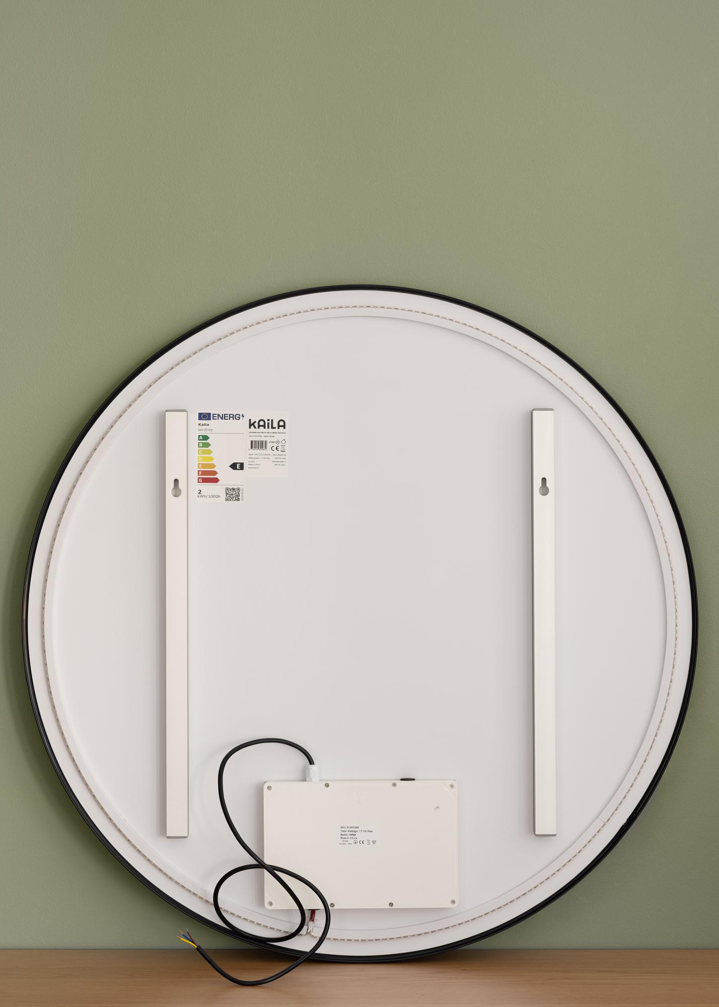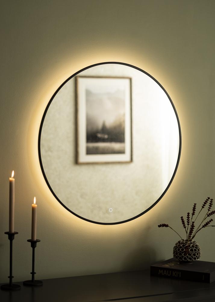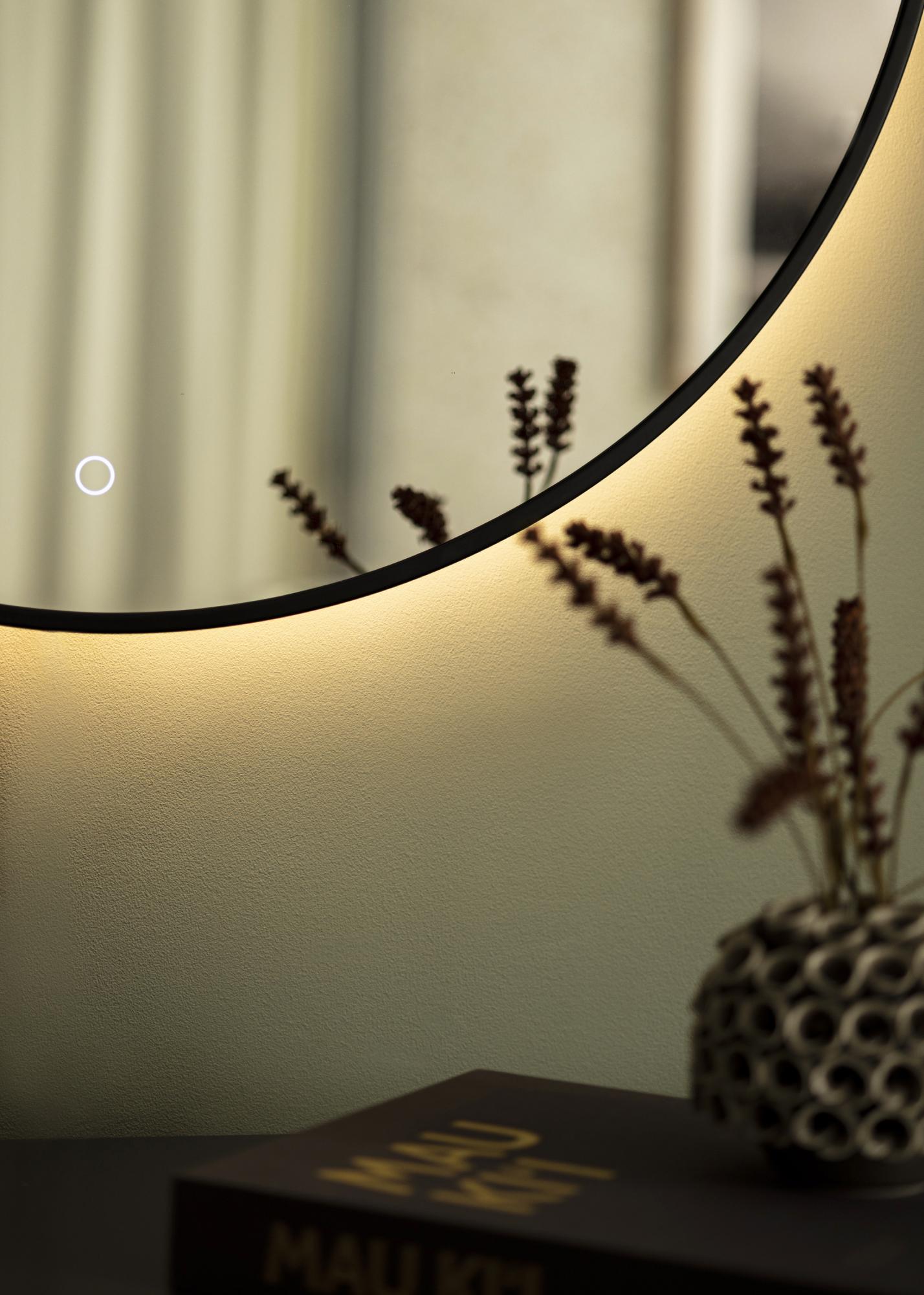 Toto je stylové zrcadlo s LED osvětlením, které je stejně elegantní v předsíni jako v koupelně. Zrcadlo má klasický kulatý tvar a kovový rám v sofistikované černé barvě. Integrované LED osvětlení zrcadla o teplotě 3000K lze stmívat od 10% do 100% jasu. To vám umožňuje snadno nastavit osvětlení na požadovanou úroveň jasu a změnit ji, pokud se vaše potřeby změní. Pro ztlumení světla podržte dotykové tlačítko na dolní části zrcadlové plochy po několik sekund. LED osvětlení je umístěno na zadní straně zrcadla, což dává světlu měkčí vzhled.
