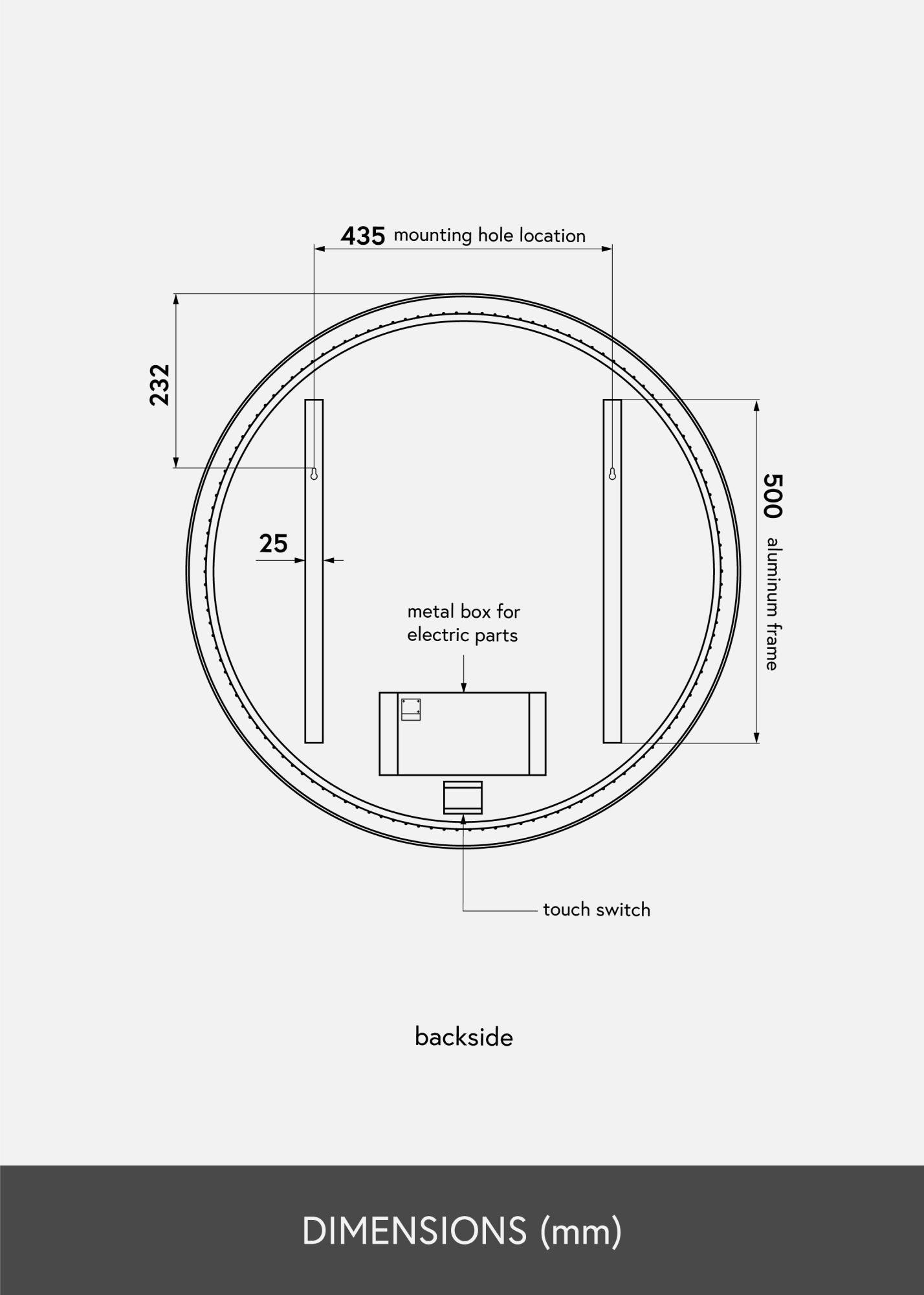 Nástěnné zrcadlo má zrcadlovou plochu s průměrem 78,5 cm. Je určeno pro pevnou instalaci a připojuje se k vypínači. Pro správnou funkci zrcadla by mělo být připojeno k běžnému vypínači, nikoli k stmívatelnému vypínači.