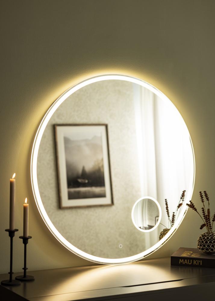 Hledáte stylové koupelnové zrcadlo s vestavěným LED osvětlením a zvětšením? Pak je toto zrcadlo pro vás! Zrcadlo má klasický kulatý tvar a LED pásku podél okrajů zrcadlové plochy. Je vybaveno běžným zrcadlovým sklem a má menší zrcadlo s 3x zvětšením, také s LED osvětlením, které ohraničuje zrcadlovou plochu. Světlo má příjemný odstín 3000K, který můžete snadno ztlumit z 10-100% jasu. Pro nastavení jasu podržte dotykové tlačítko ve spodním okraji zrcadla několik sekund.