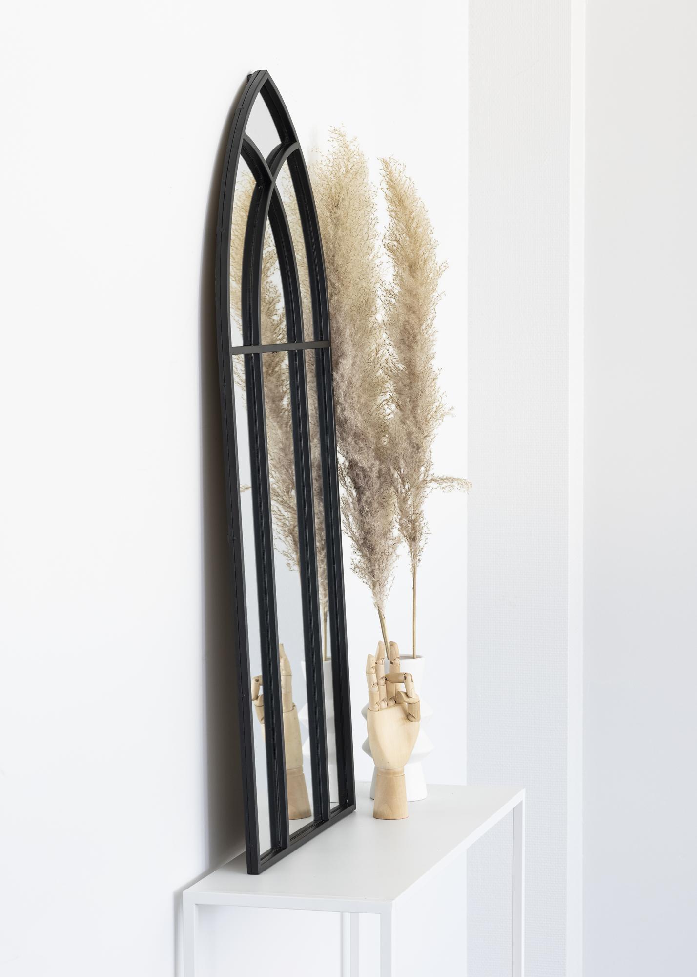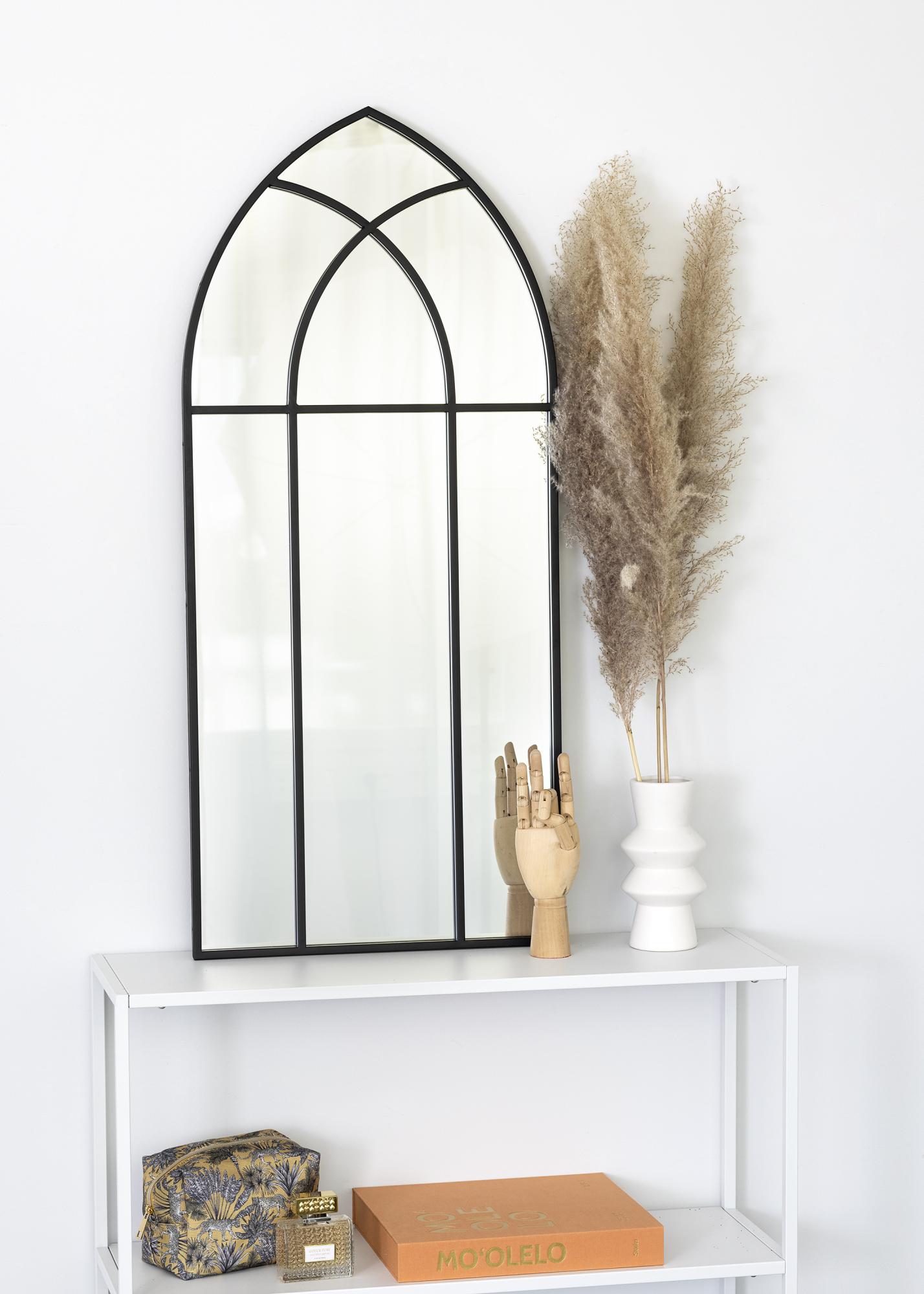 Toto je velmi dekorativní zrcadlo, které okamžitě vytváří romantičtější atmosféru v místnosti, kde je umístěno! Zrcadlo má design připomínající zahradní okno a přitom má trochu gotický charakter. Zajímavý tvar zrcadla z něj udělá poutavý prvek ve vašem domově! Zrcadlo měří 45x100 a má dekorativní vzor černých tenkých linií v kovu.