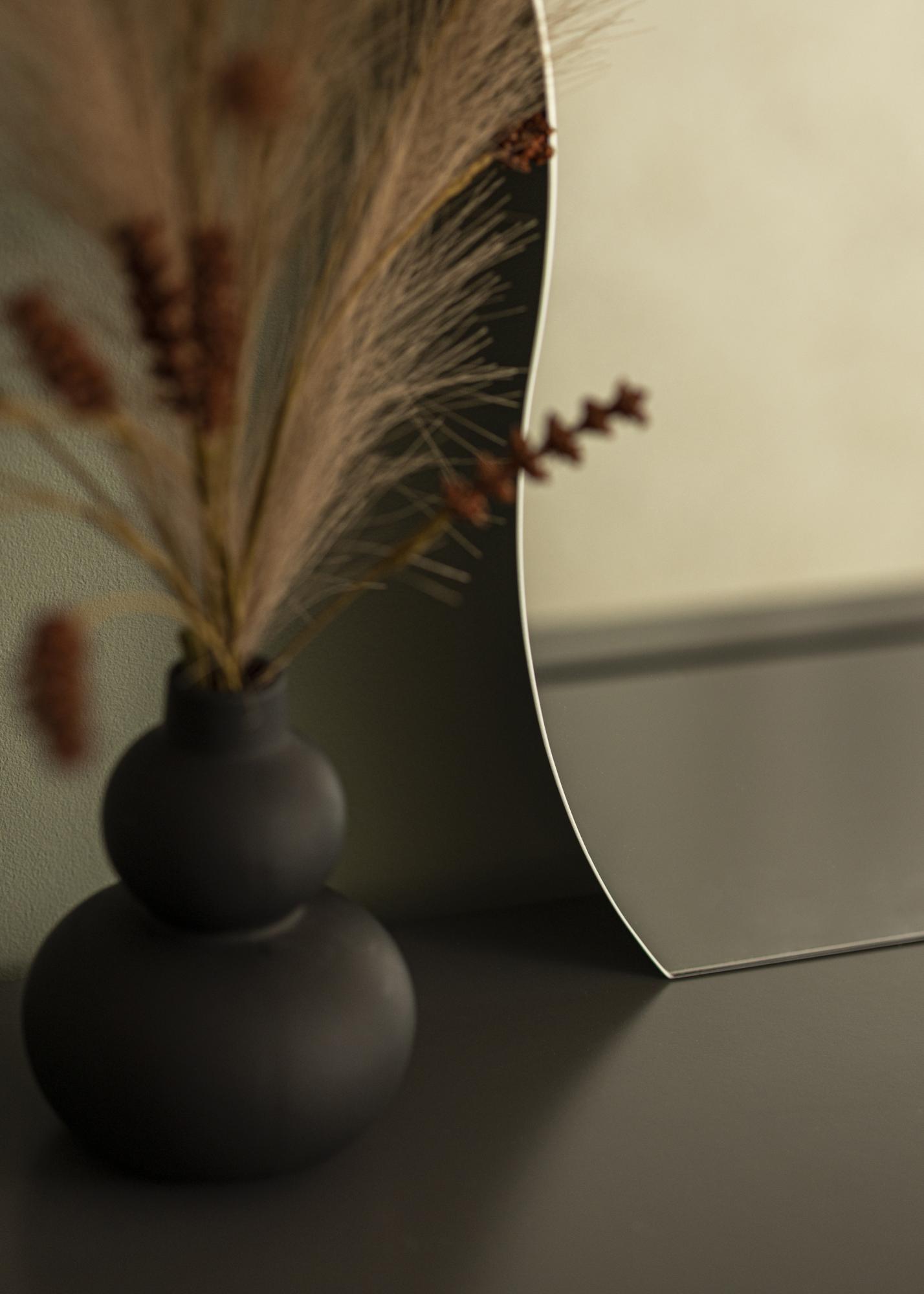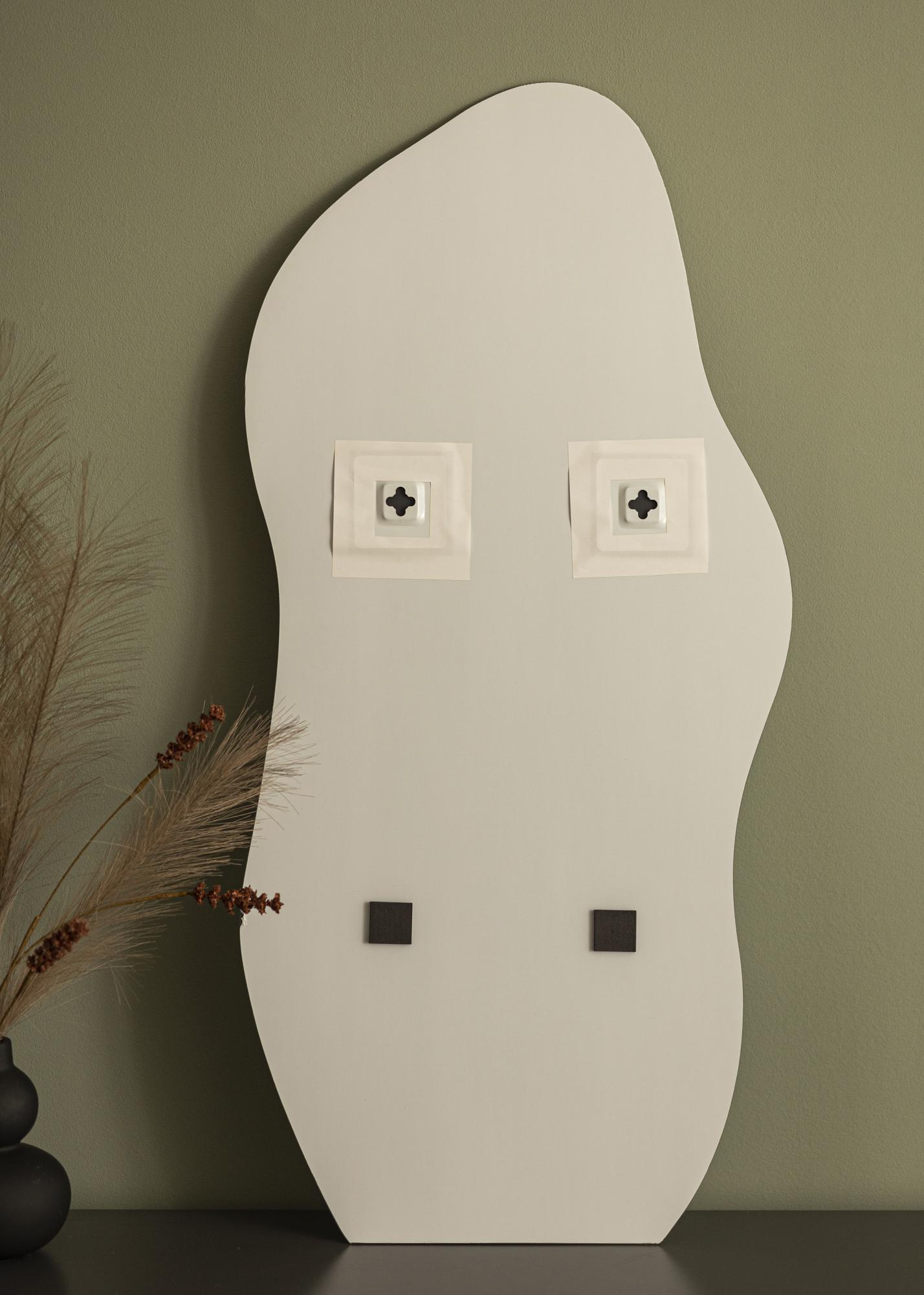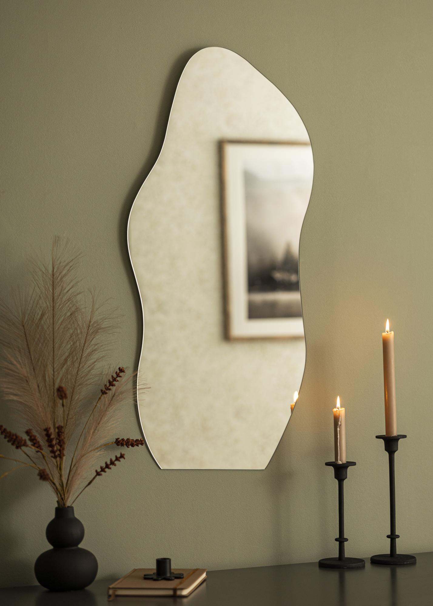 Toto je nástěnné zrcadlo v trendy designu, s boky s měkkým vlnitým tvarem. Spodní hrana je rovná, což zrcadlu dodává extra eleganci, když je zavěšeno nad nábytkem, kde dolní hrana zrcadla vytváří paralelní linii s horní stranou komody nebo příručního stolku. Zrcadlo má nástěnné úchyty na zadní straně a je připevněno na stěnu ve svislé poloze.
