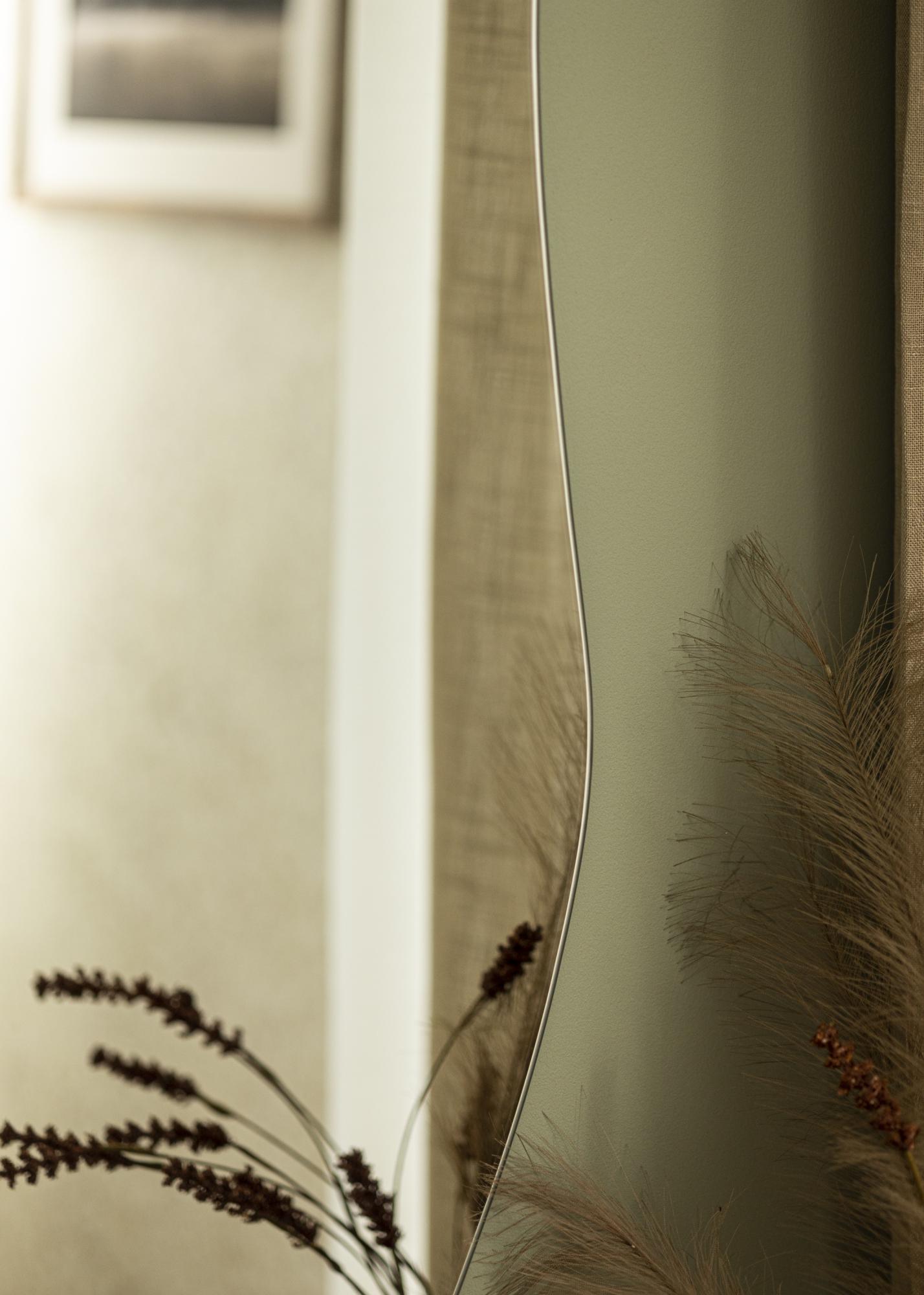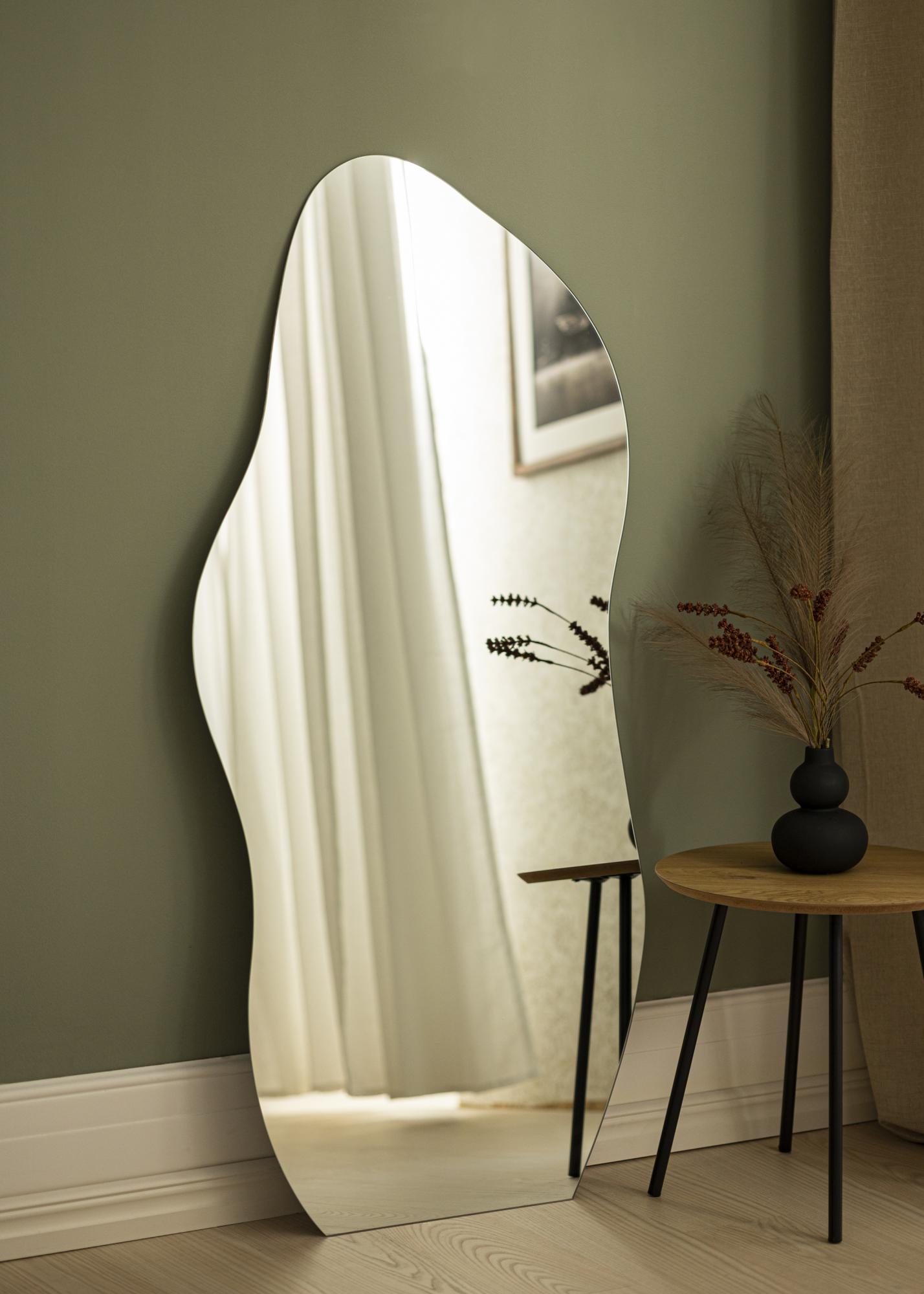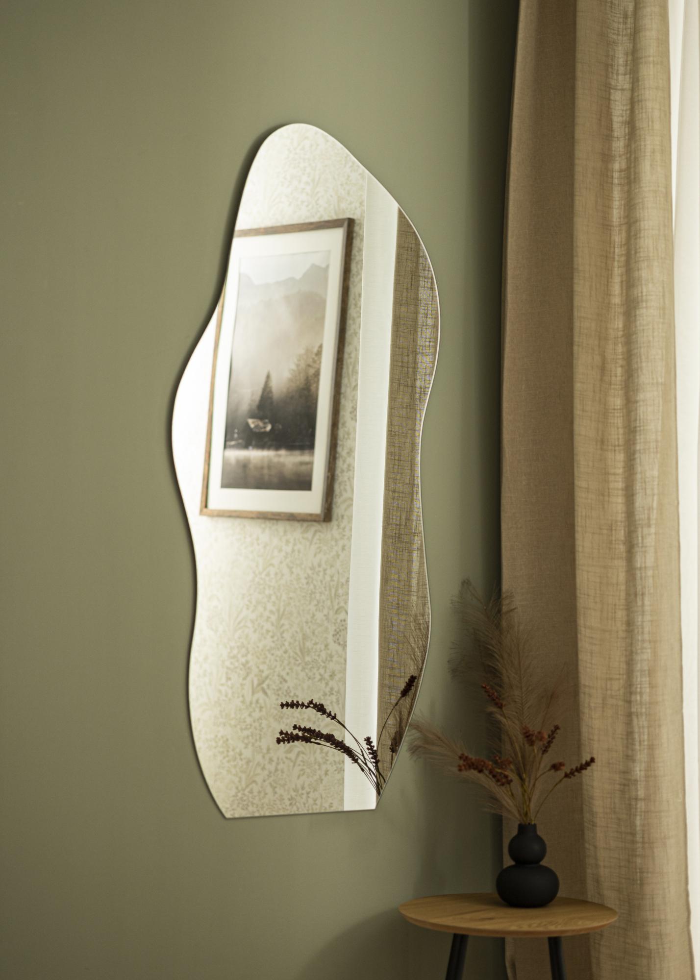 Toto je nástěnné zrcadlo v trendy designu, s boky s měkkým vlnitým tvarem. Spodní okraj je rovný, což zrcadlo činí mimořádně elegantním, když je zavěšeno nad nábytkem, kde spodní okraj zrcadla tvoří rovnoběžnou čáru s horní částí komody nebo postranního stolku. Zrcadlo má na zadní straně nástěnné držáky a montuje se na stěnu ve svislé poloze.