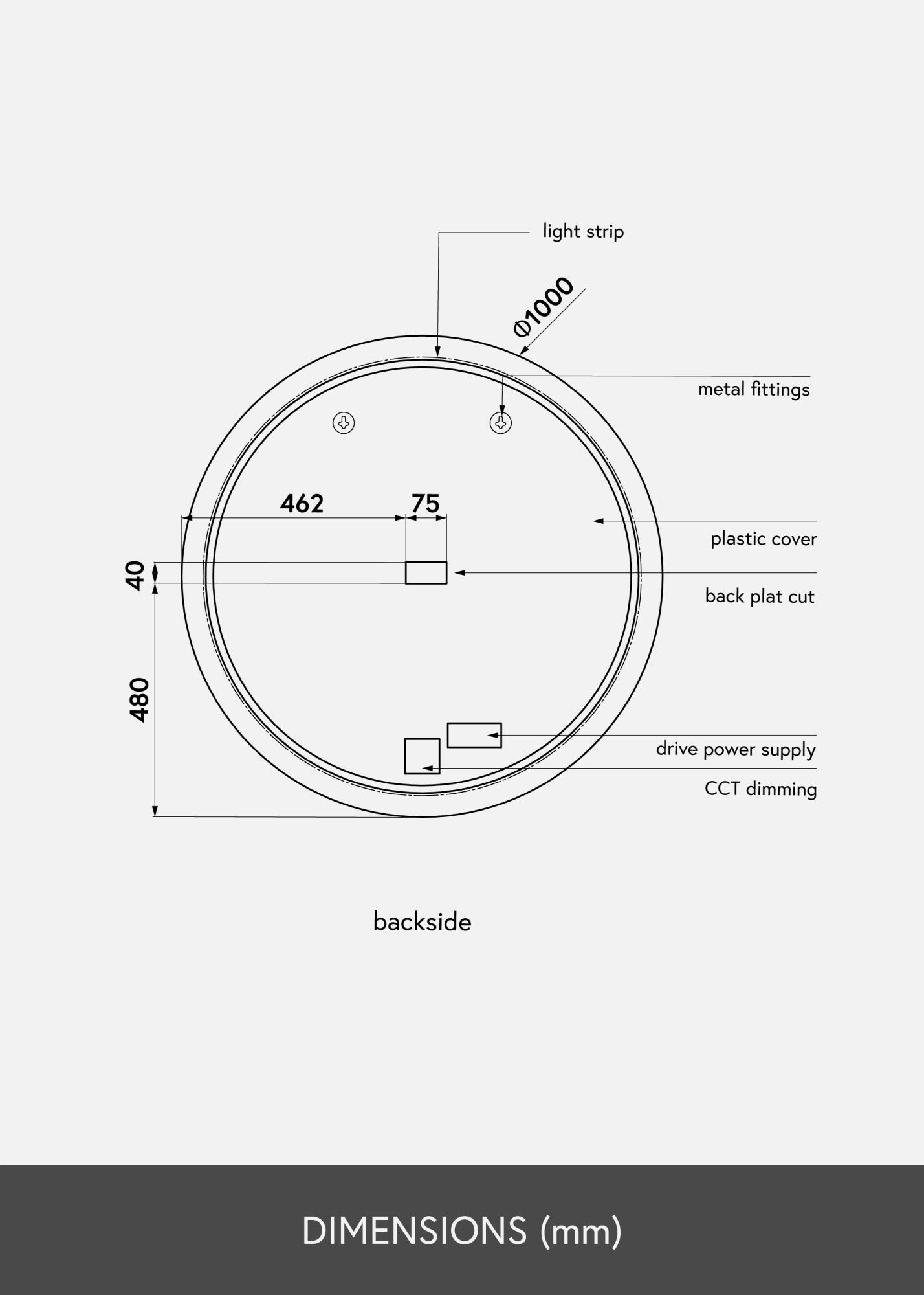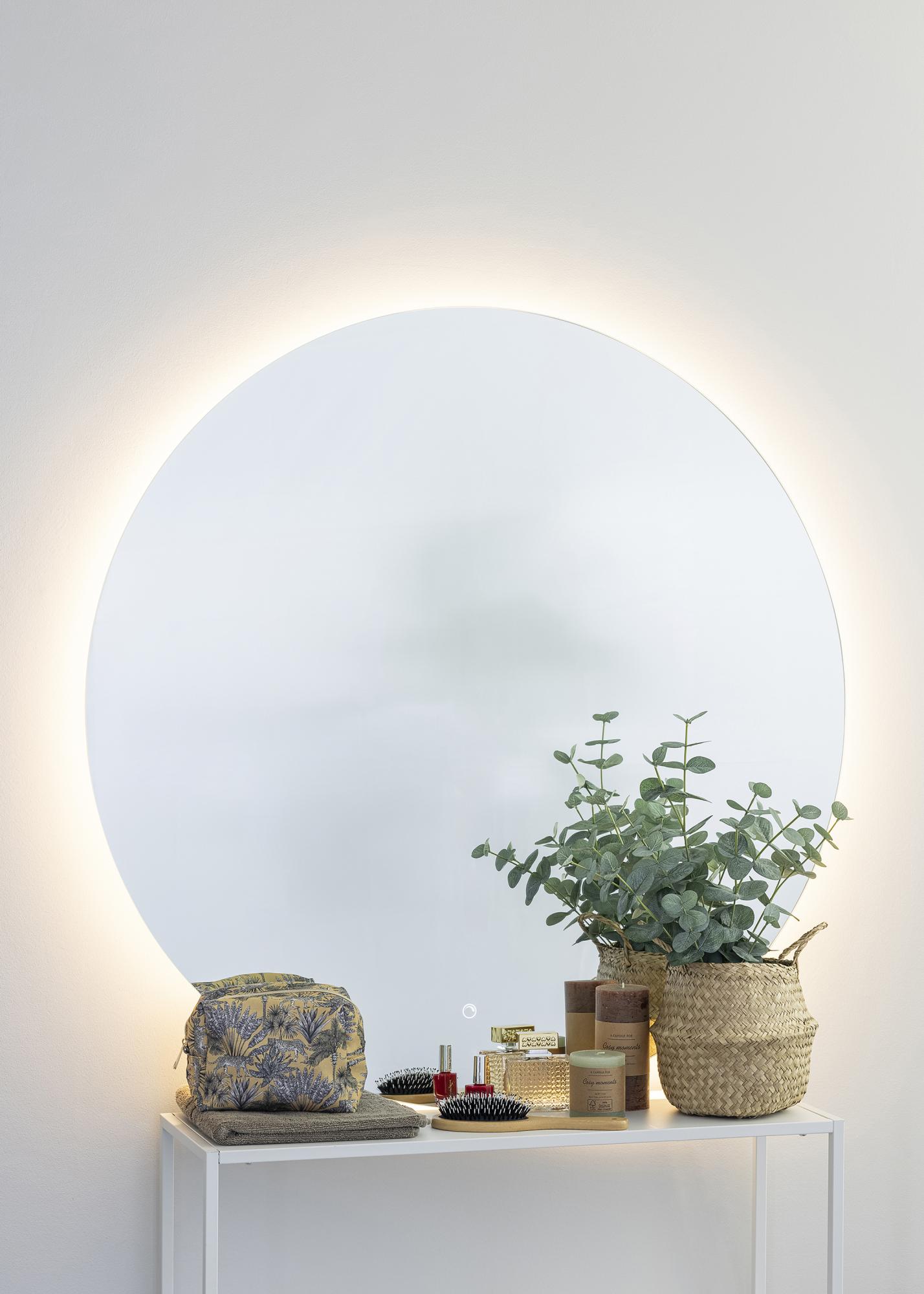 Zrcadlo je schválené pro koupelny, ale jeho nadčasový a elegantní design se hodí i na jiné stěny v domácnosti. Zrcadlo má průměr 100 cm, je pouze 3 cm hluboké a má nástěnné držáky. Zrcadlo je určeno pro pevnou instalaci a připojuje se ke spínači. Aby zrcadlo správně fungovalo, mělo by být připojeno k běžnému spínači, ne ke stmívacímu spínači.