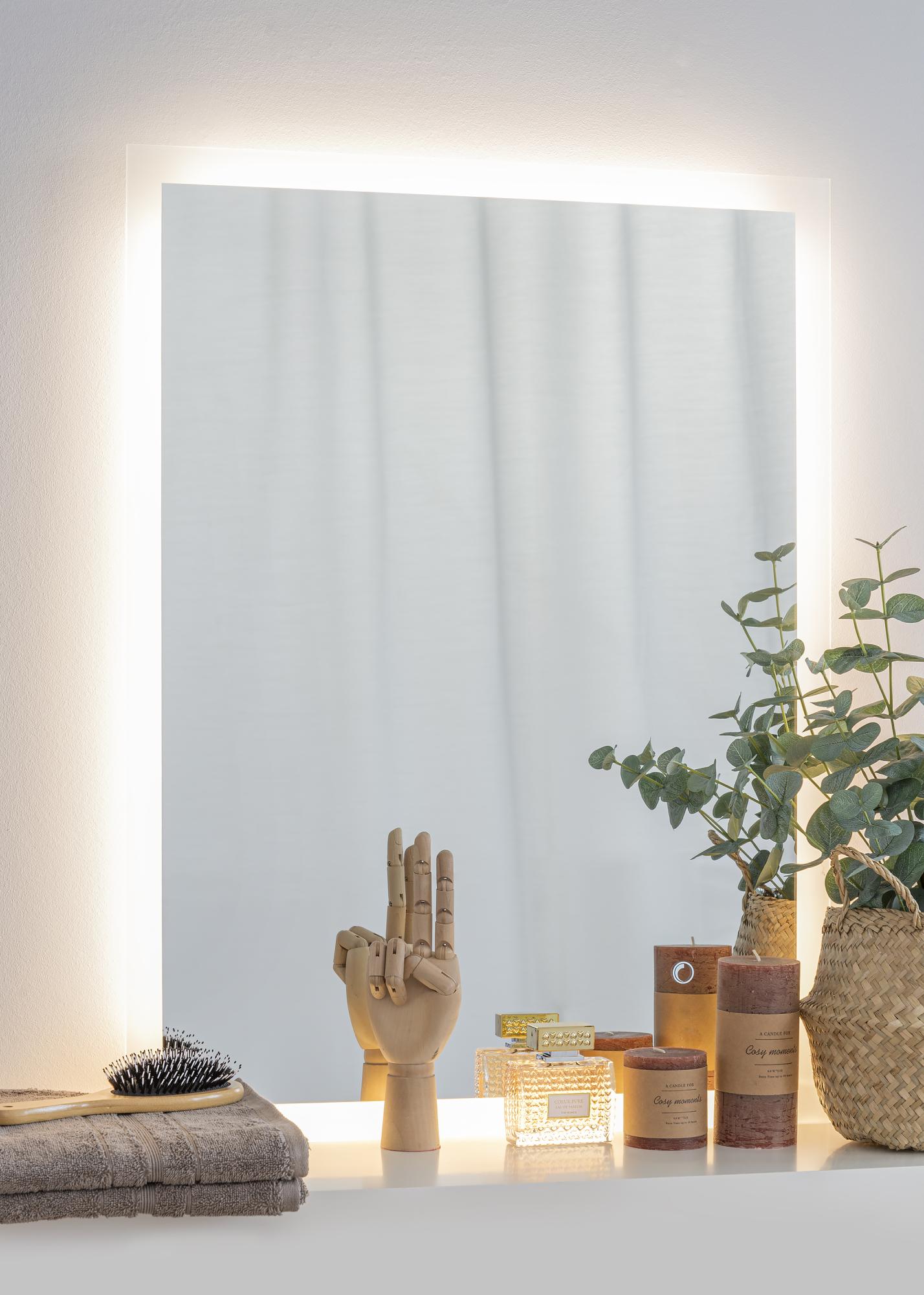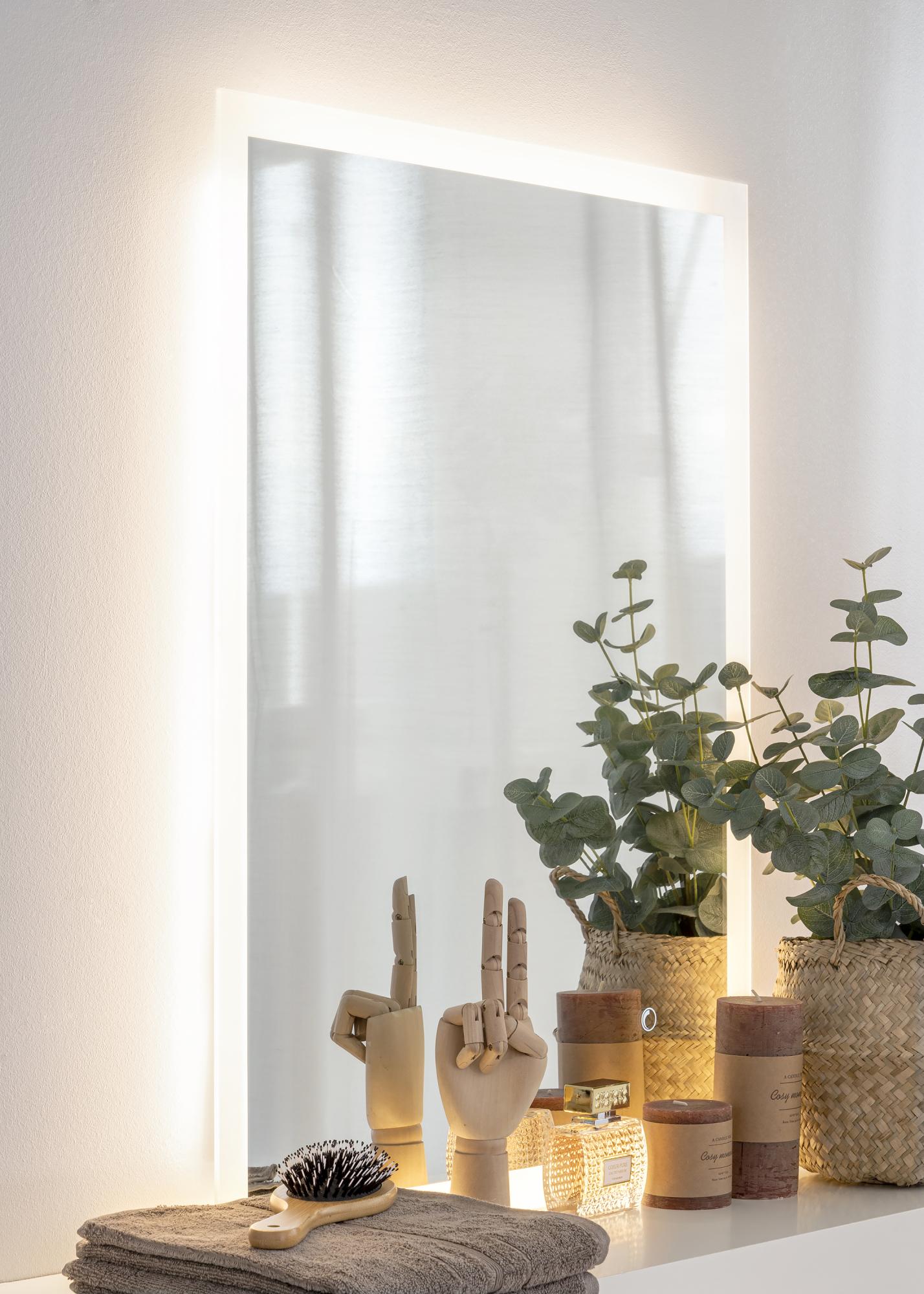 Toto je elegantní koupelnové zrcadlo v obdélníkovém tvaru od švédské značky KAILA. Zrcadlo má integrované LED osvětlení, které jde podél okraje jako rám a poskytuje příjemné teplé bílé světlo o teplotě 3000K. Osvětlení je stmívatelné a nastavuje se vodotěsným dotykovým tlačítkem. Přidržením prstu na dotykovém tlačítku se světlo zatemní na požadovanou sílu. Toto zrcadlo si pamatuje poslední nastavení osvětlení, když jej příště zapnete, a poskytuje vám možnost vždy se odrazit v dobrém světle!