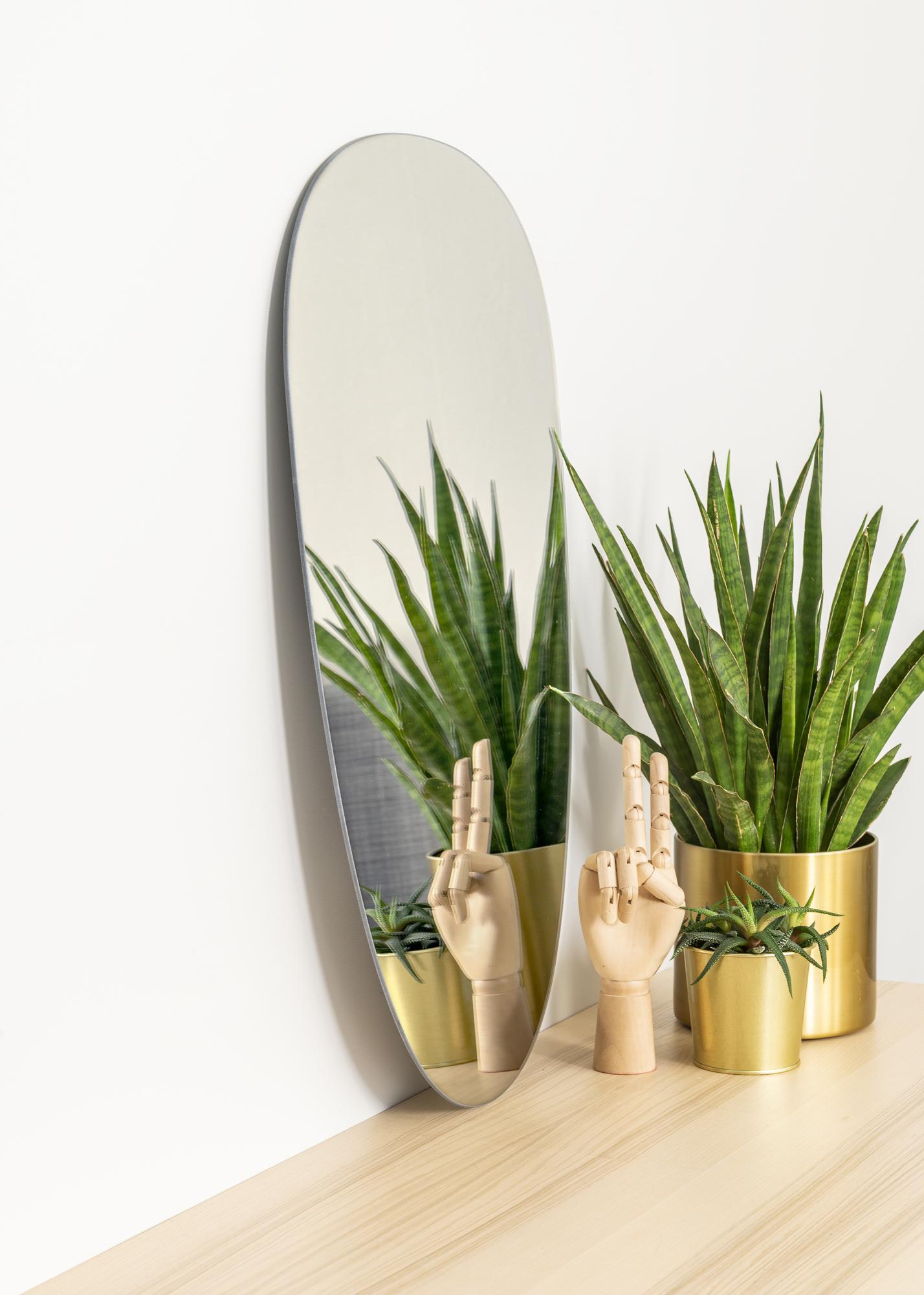 Elegantní a zajímavé zrcadlo jako toto vnese do vašeho interiéru moderní prvek! Zrcadlo má měkký a asymetrický tvar, který lze nejlépe popsat jako nerovnoměrně oválný. Zrcadlo je navíc velmi tenké a nemá žádný rám, což dále zesiluje jeho elegantní vzhled.