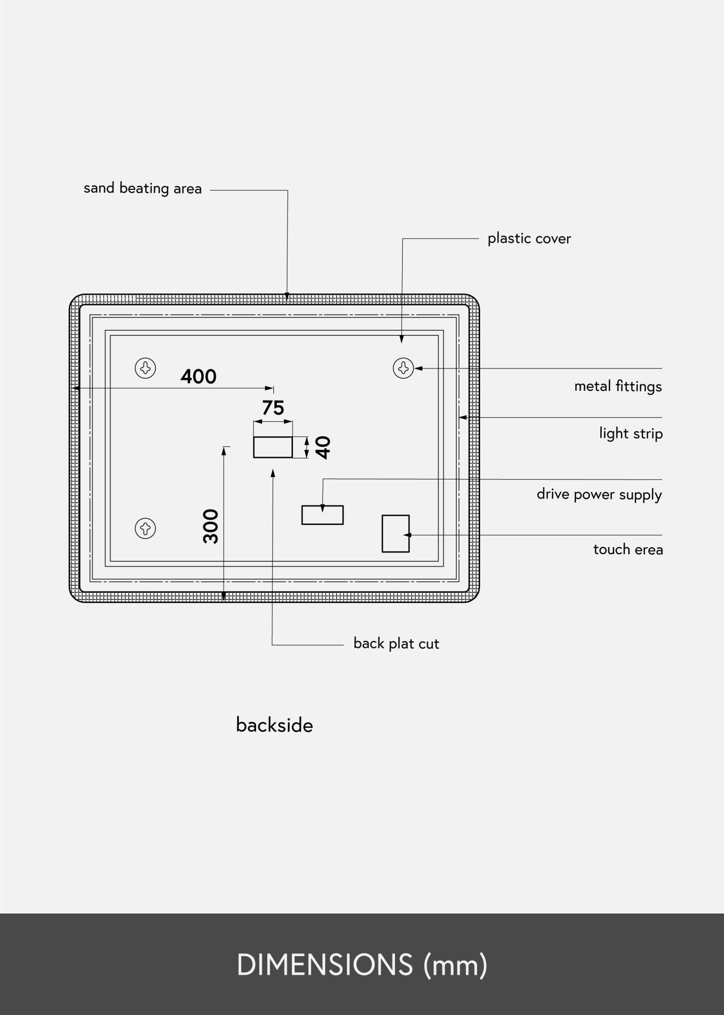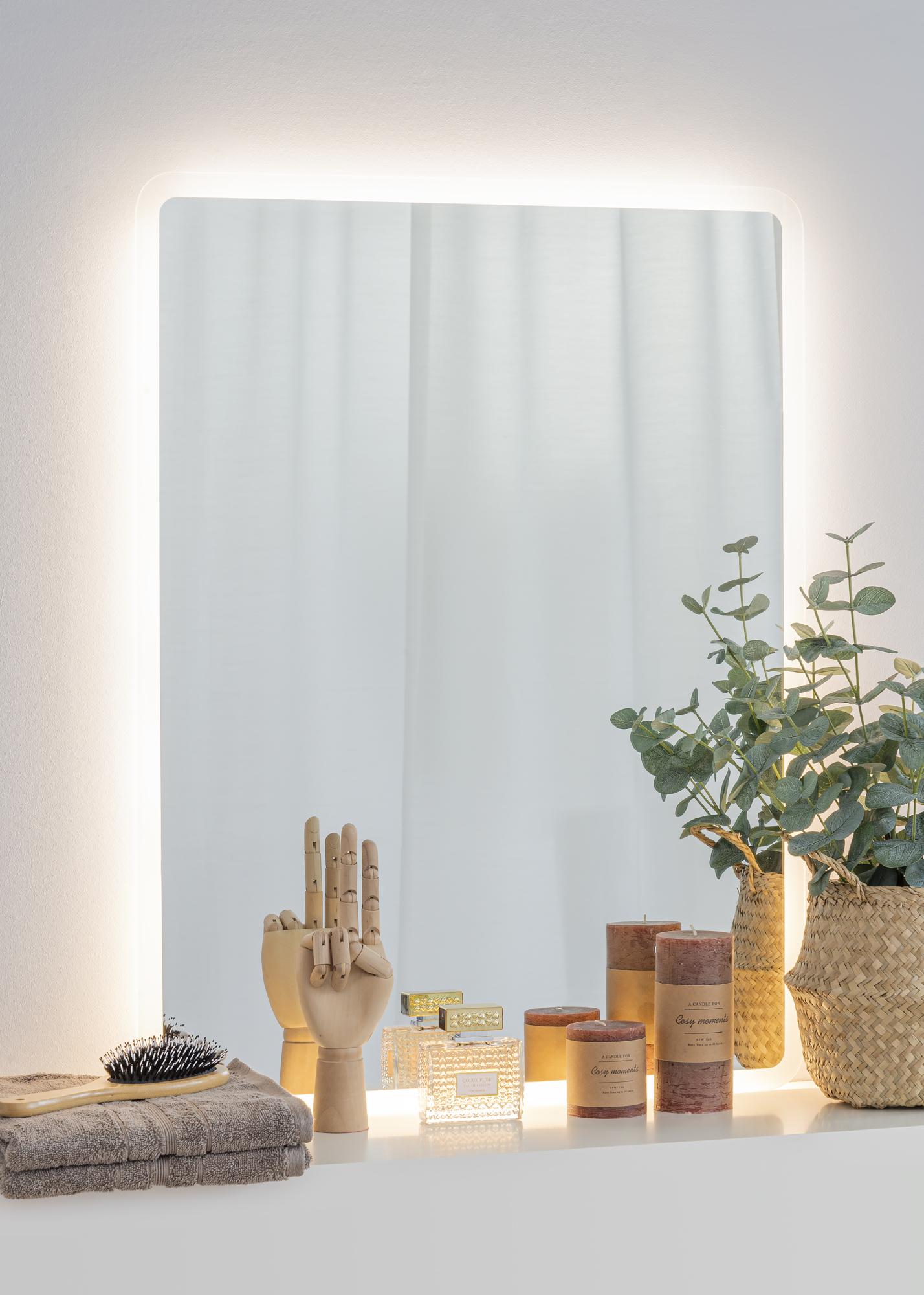 Toto koupelnové zrcadlo v nadčasovém designu má obdélníkový tvar a měkké okraje se zaoblenými rohy. Po okraji vede integrované LED osvětlení, které elegantně rámuje zrcadlo. LED osvětlení svítí za zrcadlem a poskytuje příjemný teplý bílý odstín 3000K. Osvětlení je stmívatelné a úroveň jasu můžete snadno nastavit podržením dotykového tlačítka na skleněné desce na několik sekund. Zrcadlo si pamatuje poslední nastavení světla při příštím zapnutí osvětlení. Zrcadlo je schváleno pro koupelny. Koupelnové zrcadlo je určeno pro pevnou instalaci a připojuje se ke spínači. Aby zrcadlo správně fungovalo, musí být připojeno k běžnému spínači, nikoliv k stmívatelnému spínači.