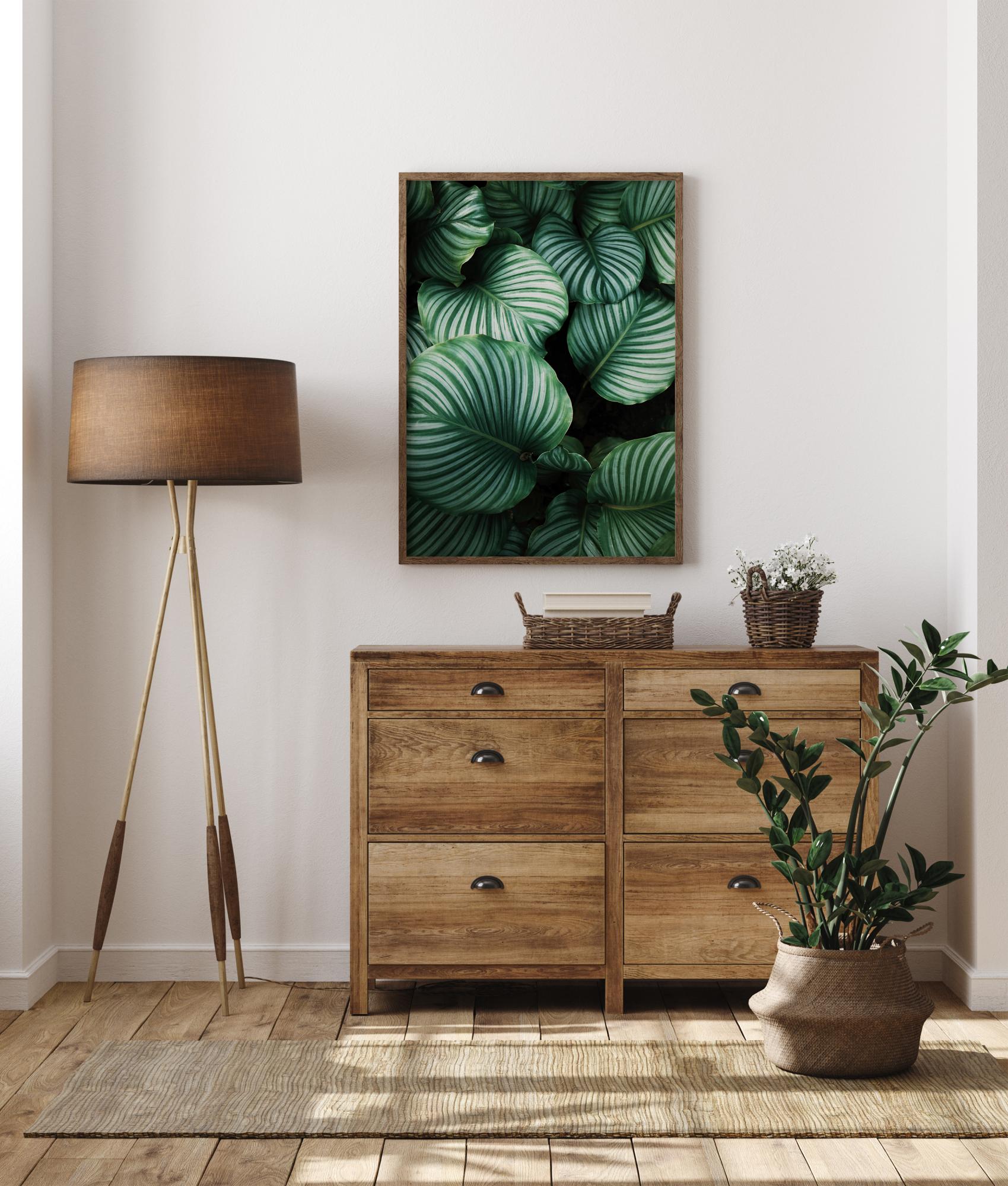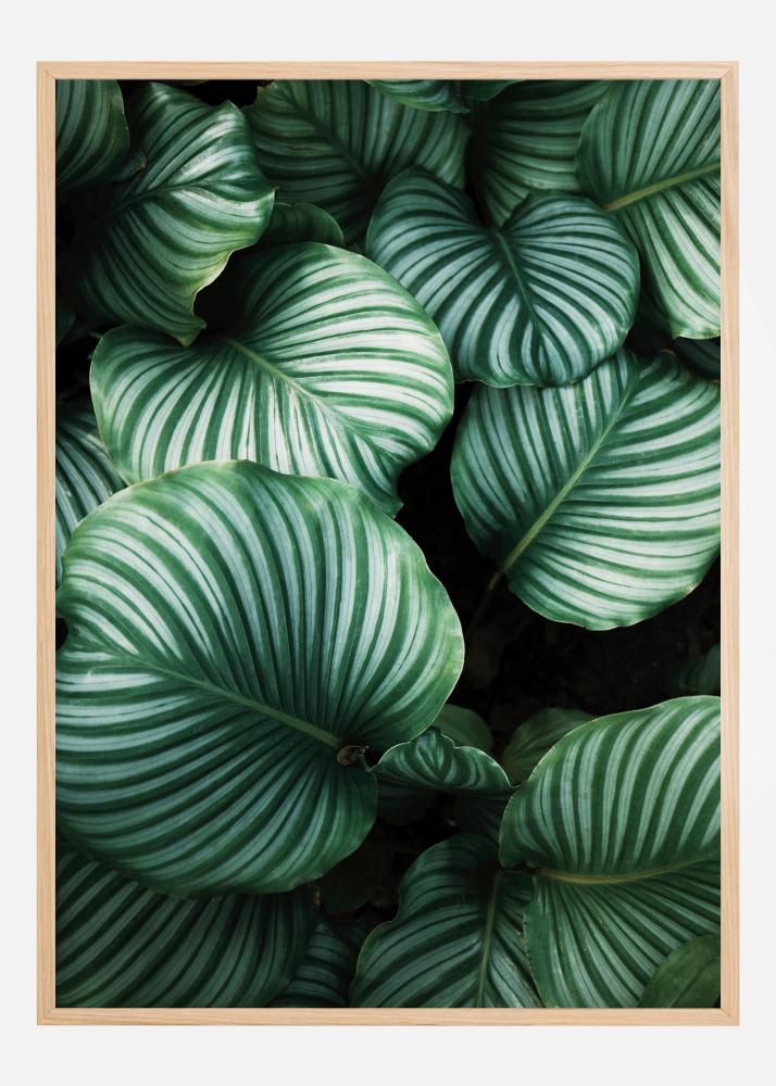 Krásný plakát z ptačí perspektivy s tmavými zelenými listy kalathey. Sluneční světlo dopadá na listy a vytváří pronikavé světlo. Různé odstíny zelené vytvářejí intenzivní atmosféru, což činí tento obraz ideálním k zavěšení obklopeným rostlinami v obývacím pokoji.