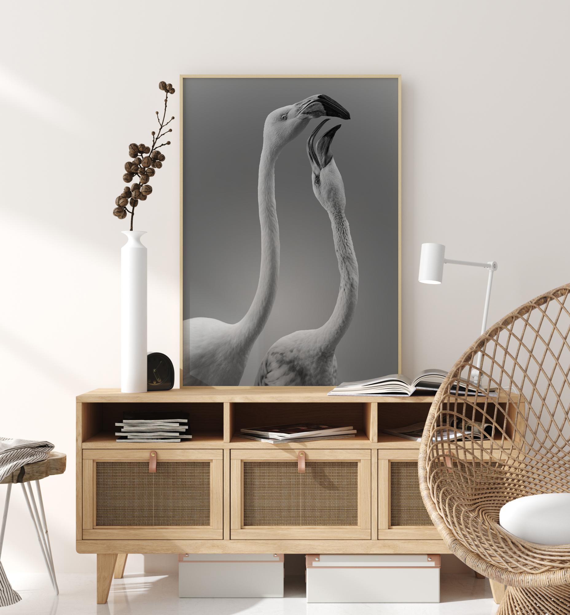 Přírodní plakát se dvěma plameňáky, kteří se naklánějí, aby se políbili. Jemné odstíny šedé na této černobílé fotografii se krásně vyváží s pastelovými barvami. Uklidněte se s těmito dvěma ptáky.
