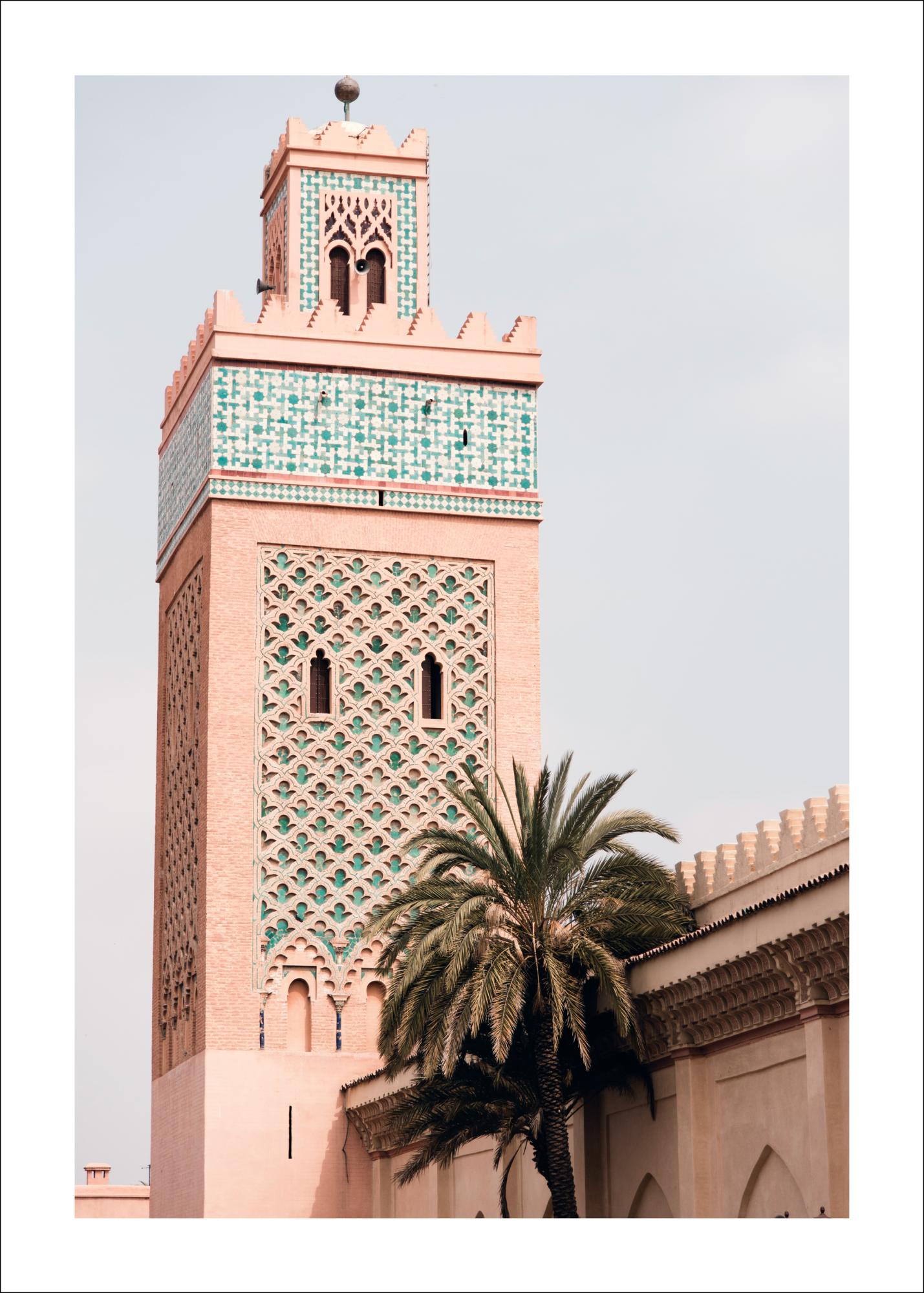 Plakát s mešitou Kutubiyya v Marrákeši za denního světla. Krásné barvy broskve a tyrkysové se dokonale mísí s světle modrou oblohou. Na spodku obrázku stojí samostatná palma se svými větvemi, které zakrývají spodní část střechy mešity. Tato broskvová kamenná struktura vytváří klidný pocit.