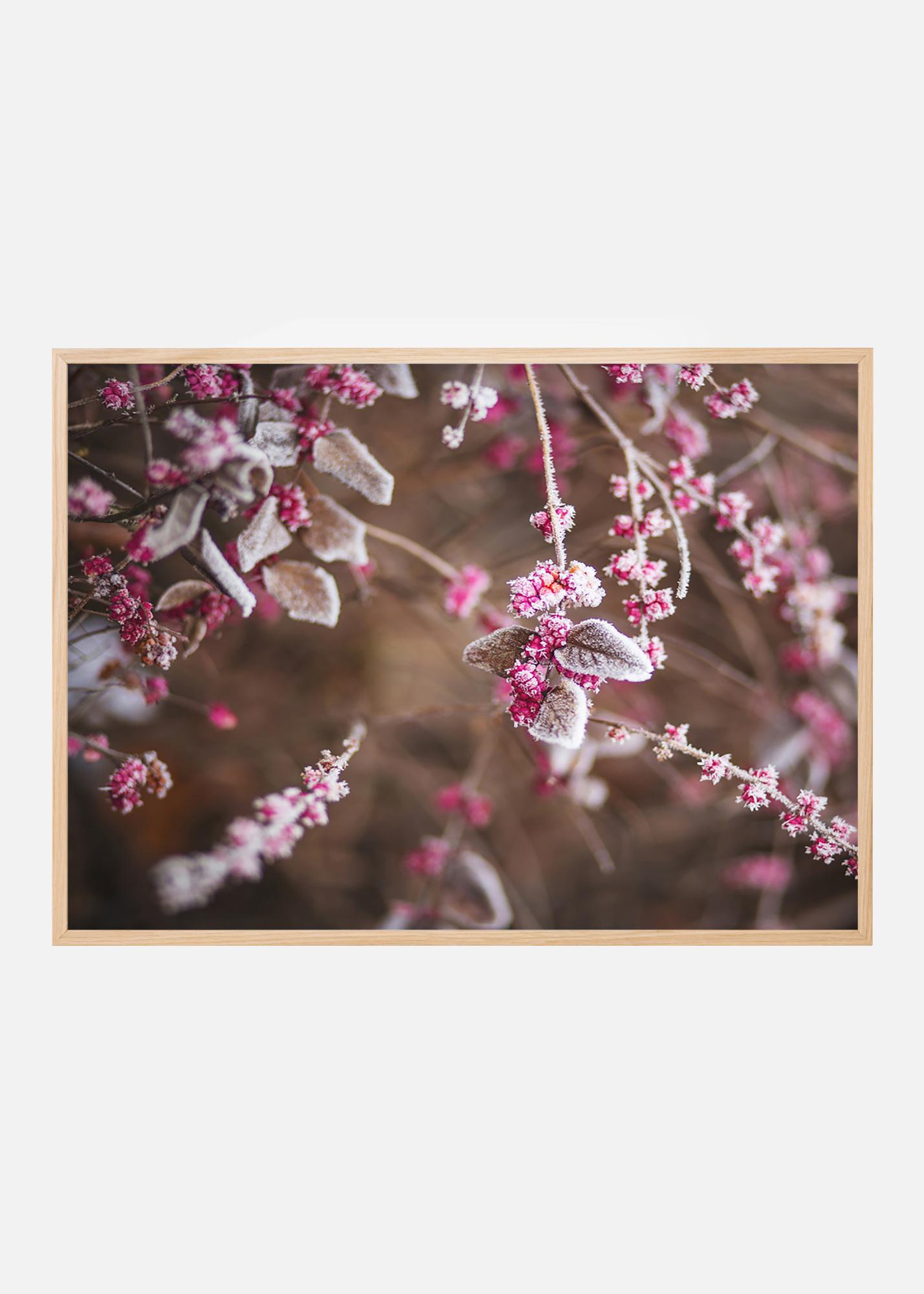 Fotografie s detailem zmrzlých růžových bobulí s krátkou hloubkou ostrosti. Tisk s růžovými bobulemi a pozadím v čokoládových tónech vytváří teplý a útulný dojem. Ve větší velikosti s elegantním rámem se obraz stane středem pozornosti v obývacím pokoji, nebo menší verzi umístěte do koláže obrazů spolu s jinými plakáty ve stejných odstínech barev.