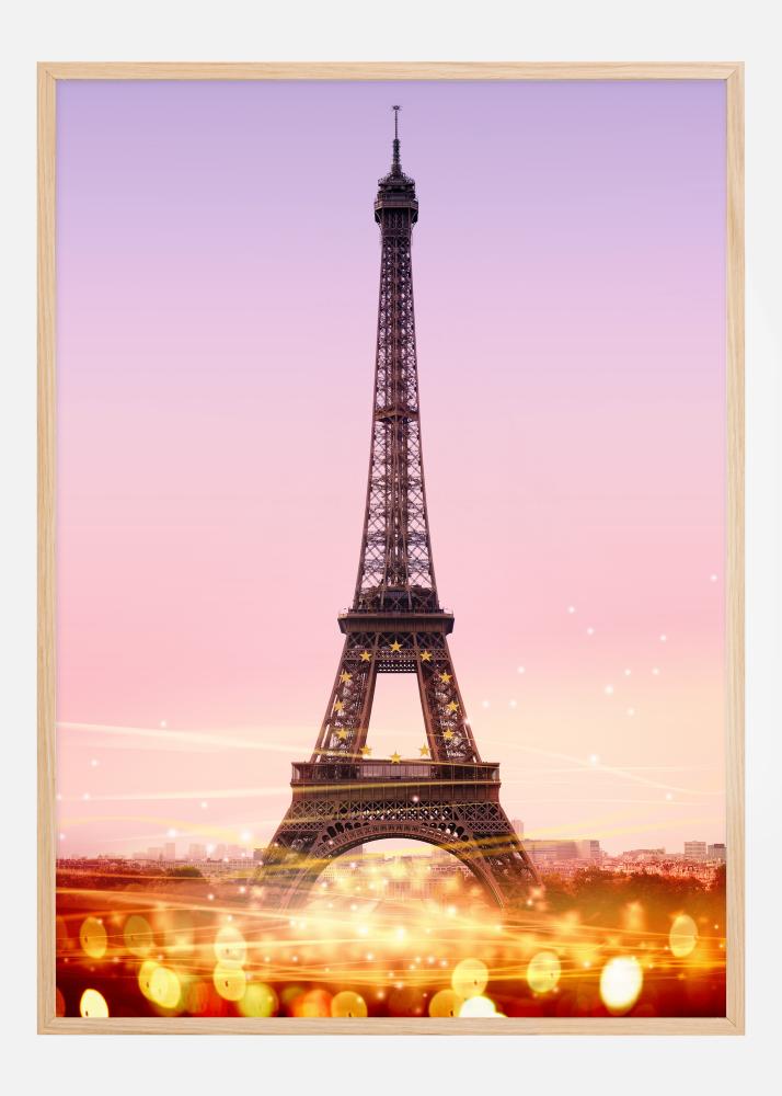 Tento plakát zachycuje majestátní Eiffelovu věž v atmosférickém soumraku. Jemné pastelové barvy na obloze vytvářejí romantické pozadí pro tento ikonický monument, zatímco světla města dole třpytí jako hvězdy, což dodává pocit magie a snovosti. Je to pocta Paříži, městu světla, a její schopnosti inspirovat lásku a úžas.