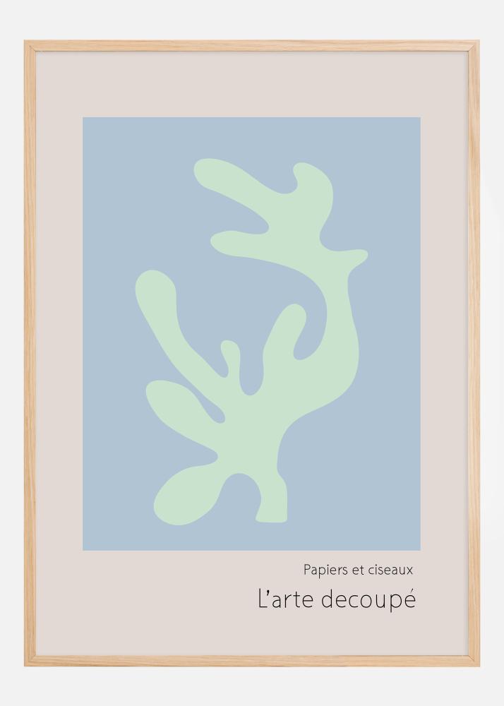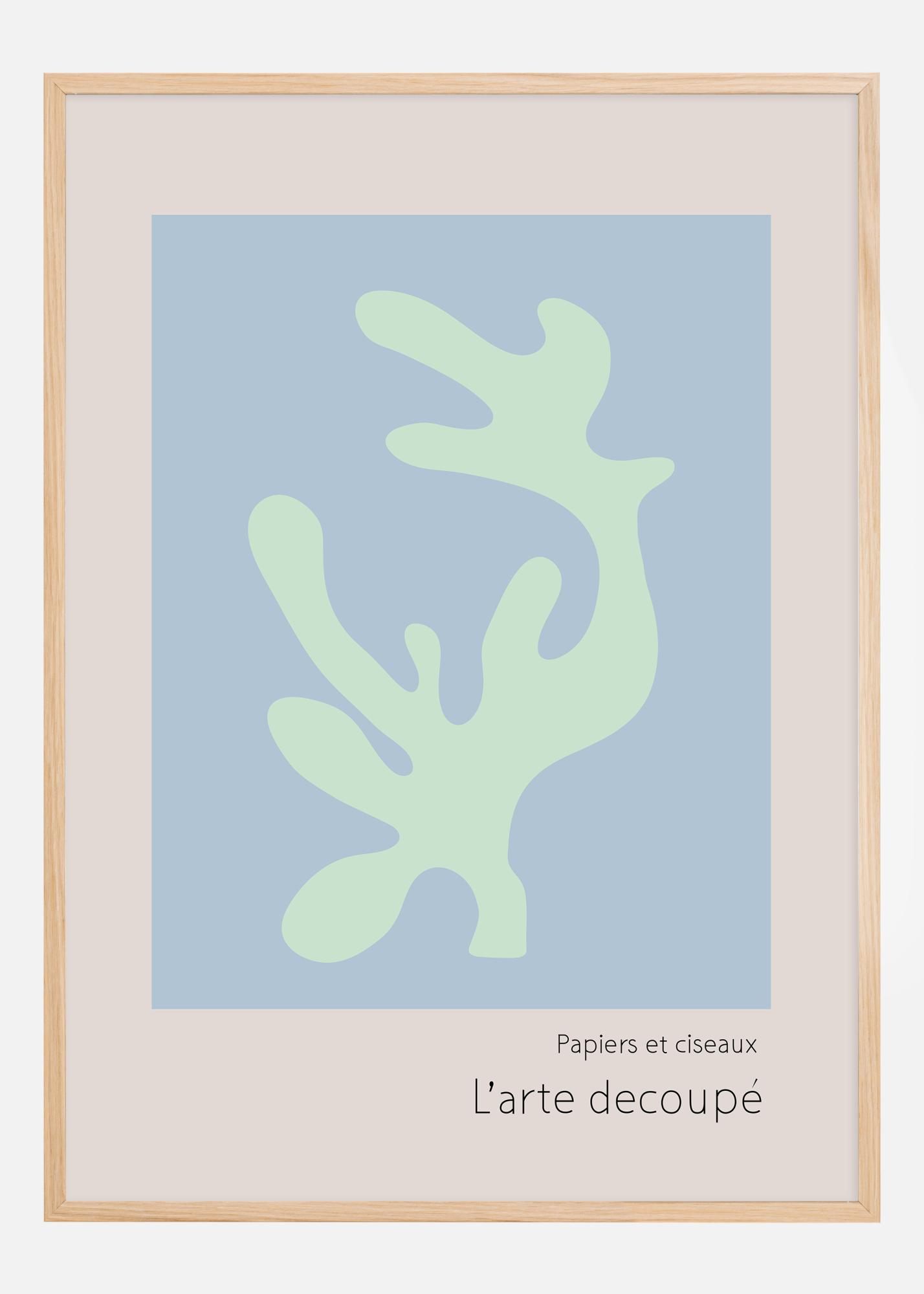 Tento sofistikovaný a minimalistický plakát oslavuje 'L'arte decoupé', umění řezání papíru, což je elegantní a nadčasová forma uměleckého vyjádření. Zobrazuje abstraktní tvar v uklidňující pastelově zelené barvě, který se vznáší na jemném modrém pozadí, čímž vytváří iluzi lehkosti a prchavosti. Jednoduchý tvar, který je jak organický, tak otevřený k interpretaci, vybízí diváka k prozkoumání negativních prostorů a nalezení vlastní významnosti ve vyřezaném vzoru.