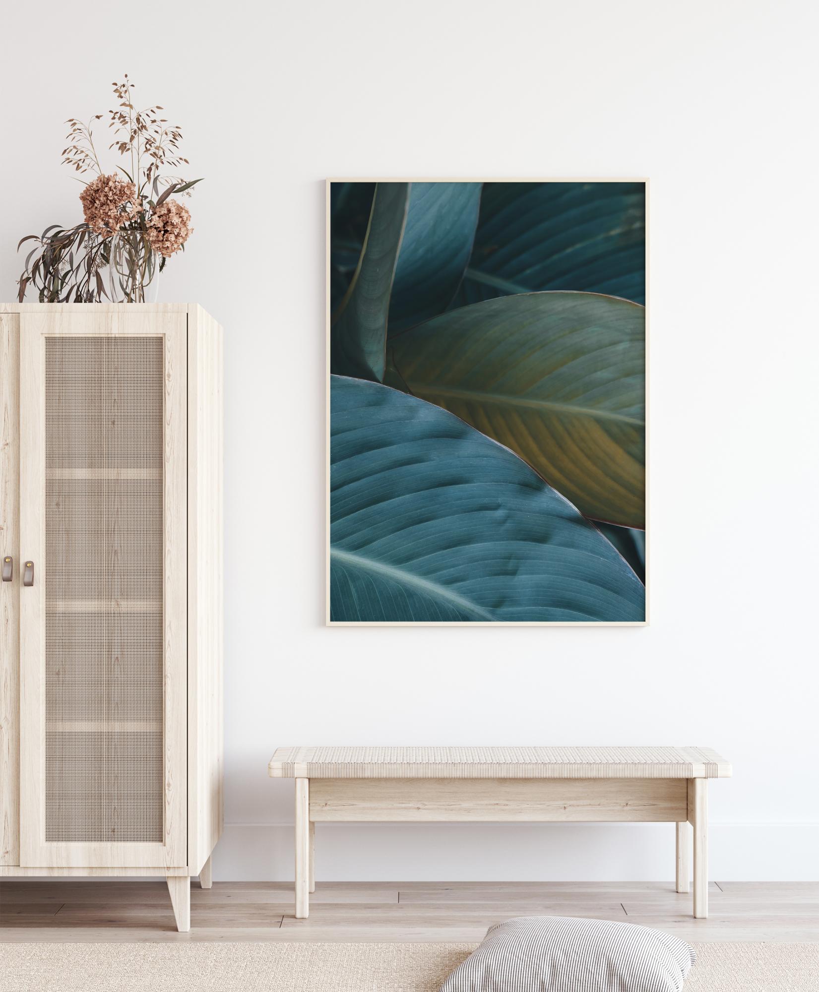 Detailní tisk listů. Jednoduchost tohoto plakátu se odráží v různých odstínech zelené, které jsou zde zastoupeny. Listy jsou uprostřed světlejší. Přirozené světlo osvětluje okraje a dává listům zlatem lemovaný vzhled. Krásný tisk k zavěšení v místnosti plné rostlin.