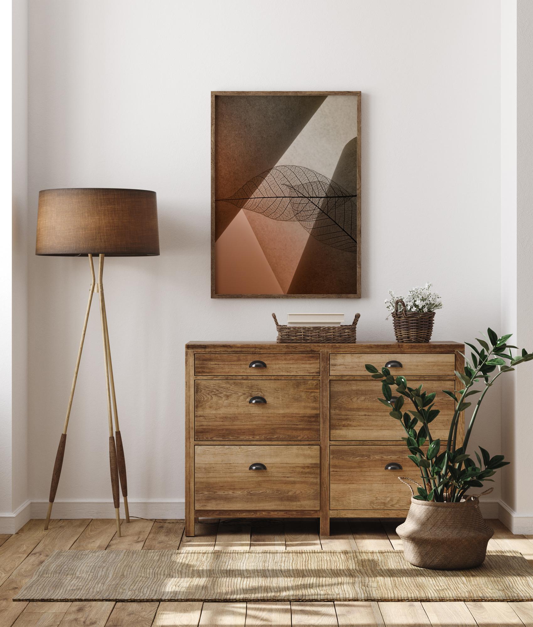 Úžasný obraz dvou listů zobrazených proti slunečnímu světlu. Světelný paprsek zvýrazňuje žilnatinu listů. Krásnému obrazu dominují různé odstíny hnědé, zatímco pozadí je charakterizováno jak hrubými, tak hladkými plochami, které odrážejí světlo. Perfektní plakát pro prosvětlení místnosti.