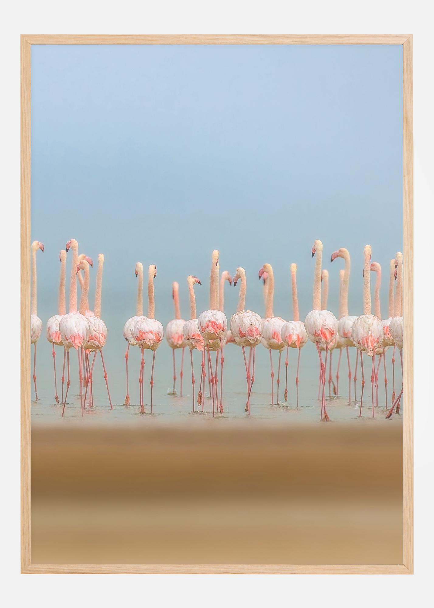 Spectakulární plakát s hejnem plameňáků na břehu vody. Tyto nádherné bytosti jsou zachyceny zezadu a jejich barva je zvýrazněna neutrálními tóny oblohy a písku. Ideální umístit do ložnice díky jeho fantasii podněcující jemnosti.