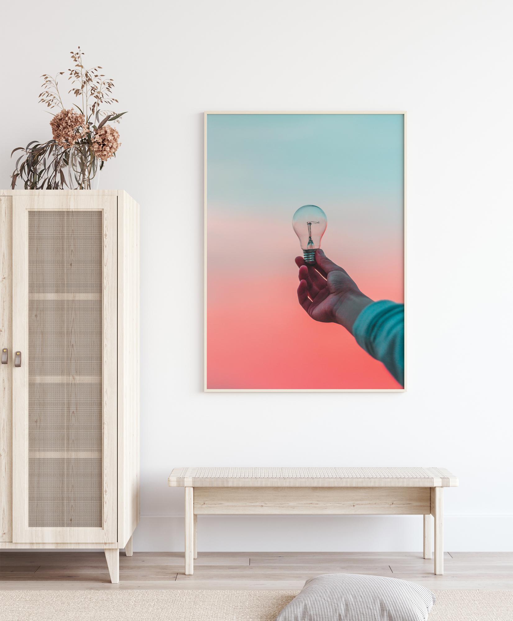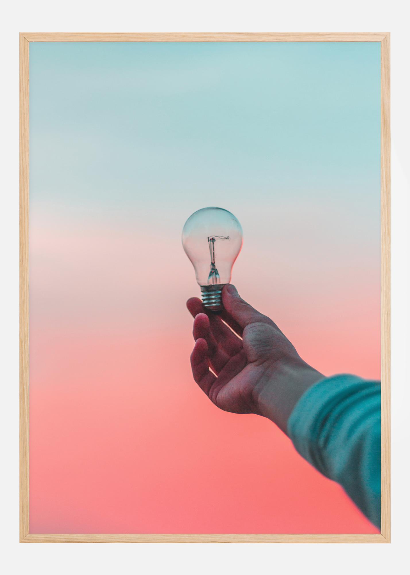 Jednoduchý tisk žárovky, která je držena proti obloze. Krásná světle modrá obloha zdůrazňuje tyrkysový svetr osoby, která drží žárovku. Spodní část plakátu odráží krásný růžový tón, který se odráží v žárovce. Uklidňující tisk, který by vypadal krásně proti pastelově zbarvené zdi.