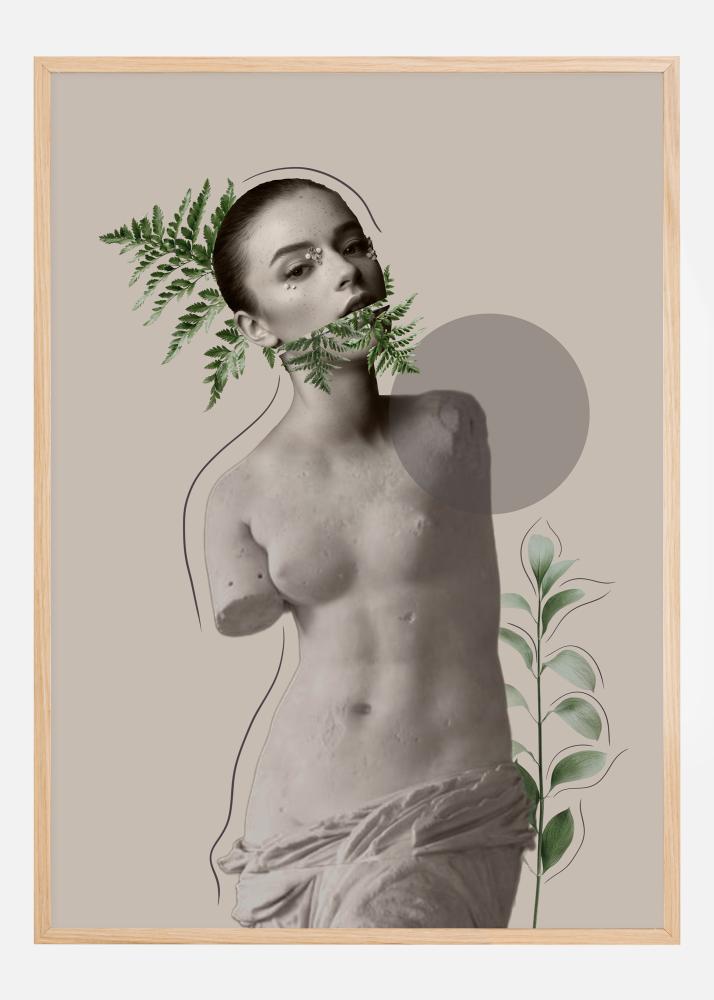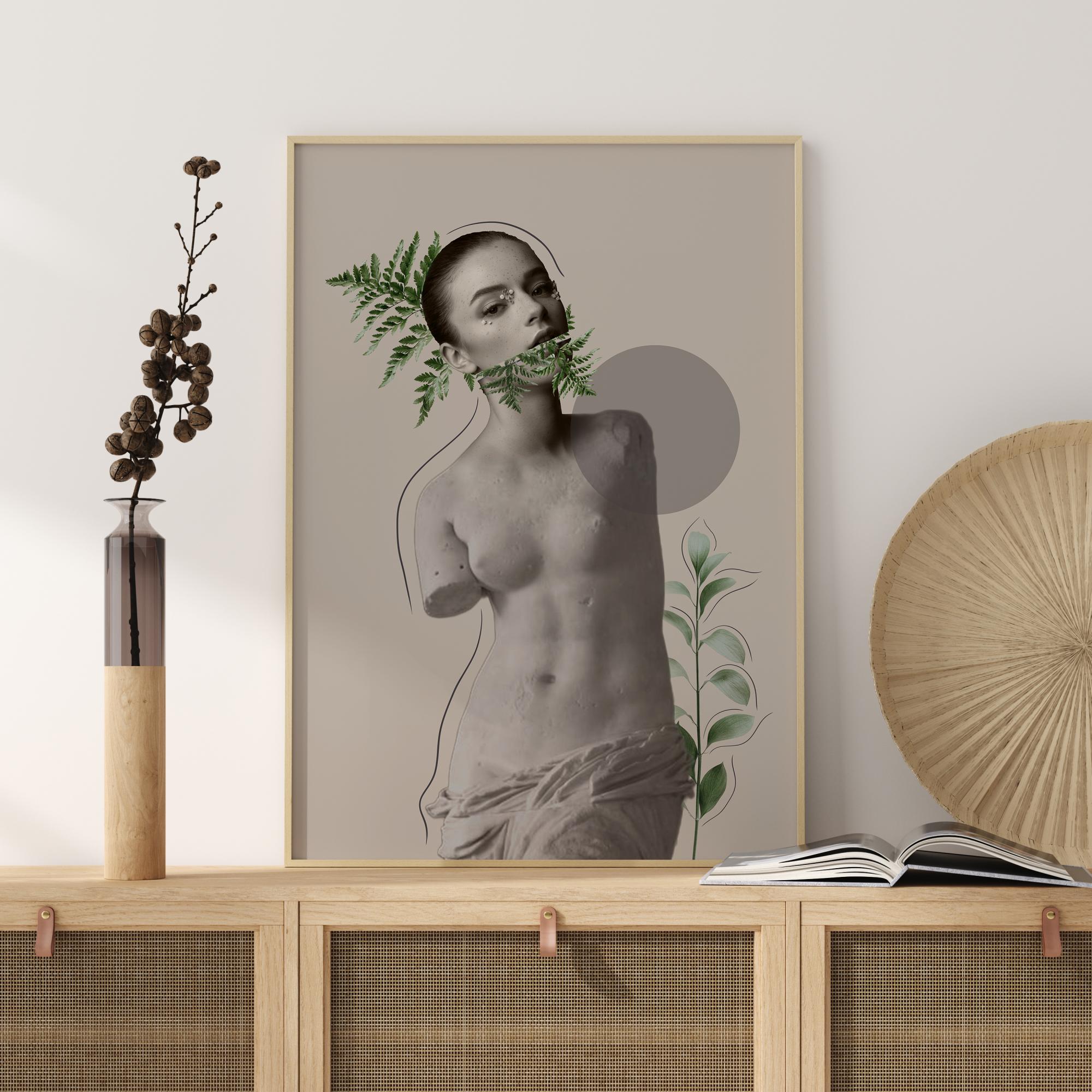 Výrazný plakát, který tvoří koláž z krás motivu. Hlavní postava je krásná žena obklopená zelení na staré řecké soše. Jemný kontrast mezi modernou a antikou. Tento obraz je silným vyjádřením pro minimalistický obývací pokoj.